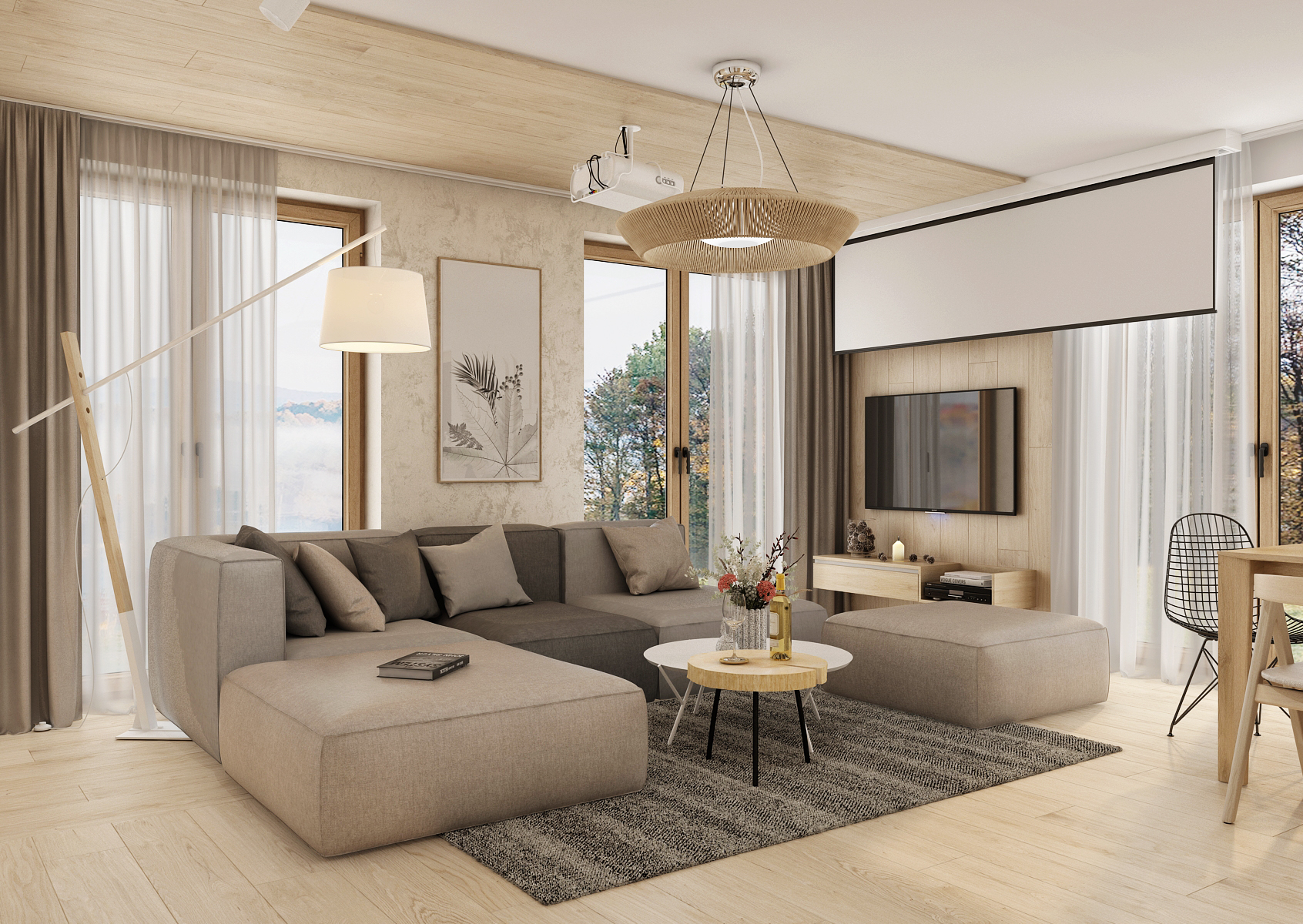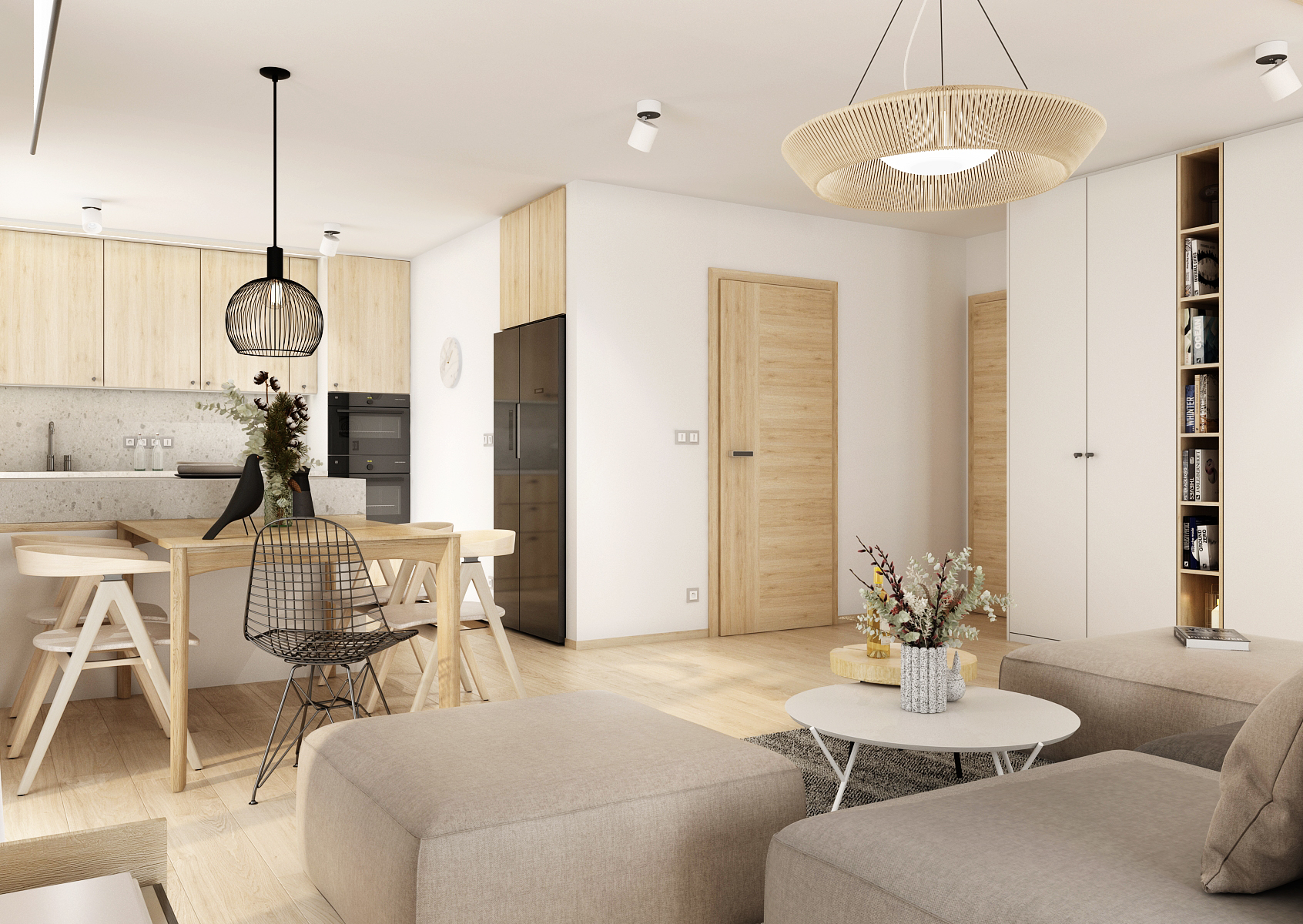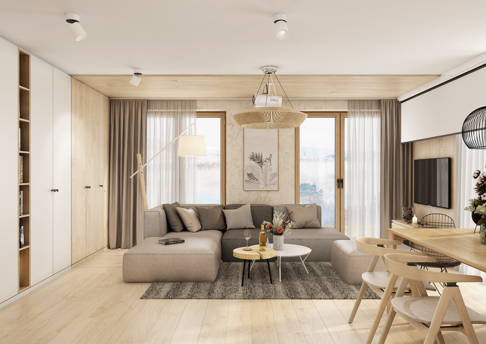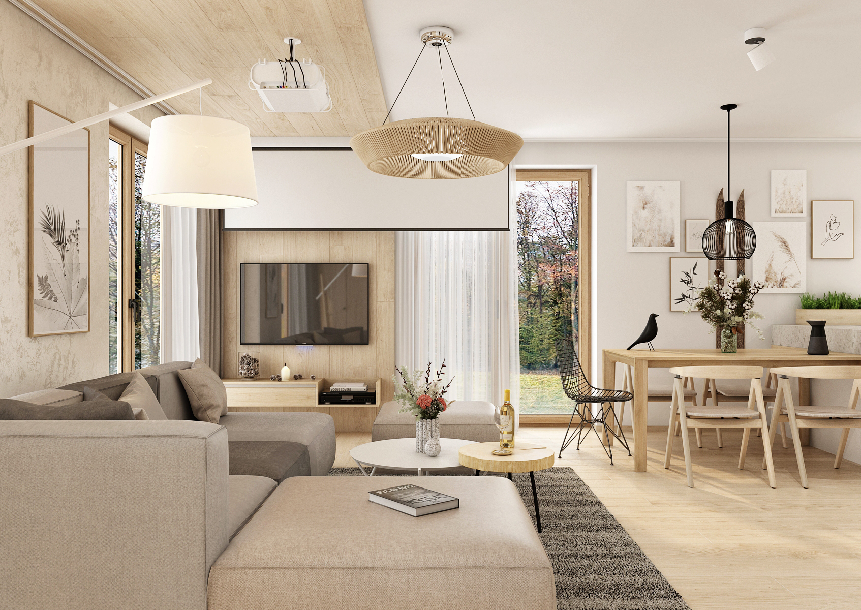 Obývací pokoj s jídelnou a kuchyňským koutem je doslova obložen dřevem. Dub se zde nachází jak v podobě masivní podlahy, tak i na skříňkách, skříních, dveřích, ale i jako obklady na stěnách a stropě. K prostorné sedací soupravě v odstínech šedé jsou přistaveny odkládací stolky, kdy jeden nese podobu špalku na kovové podnoži.