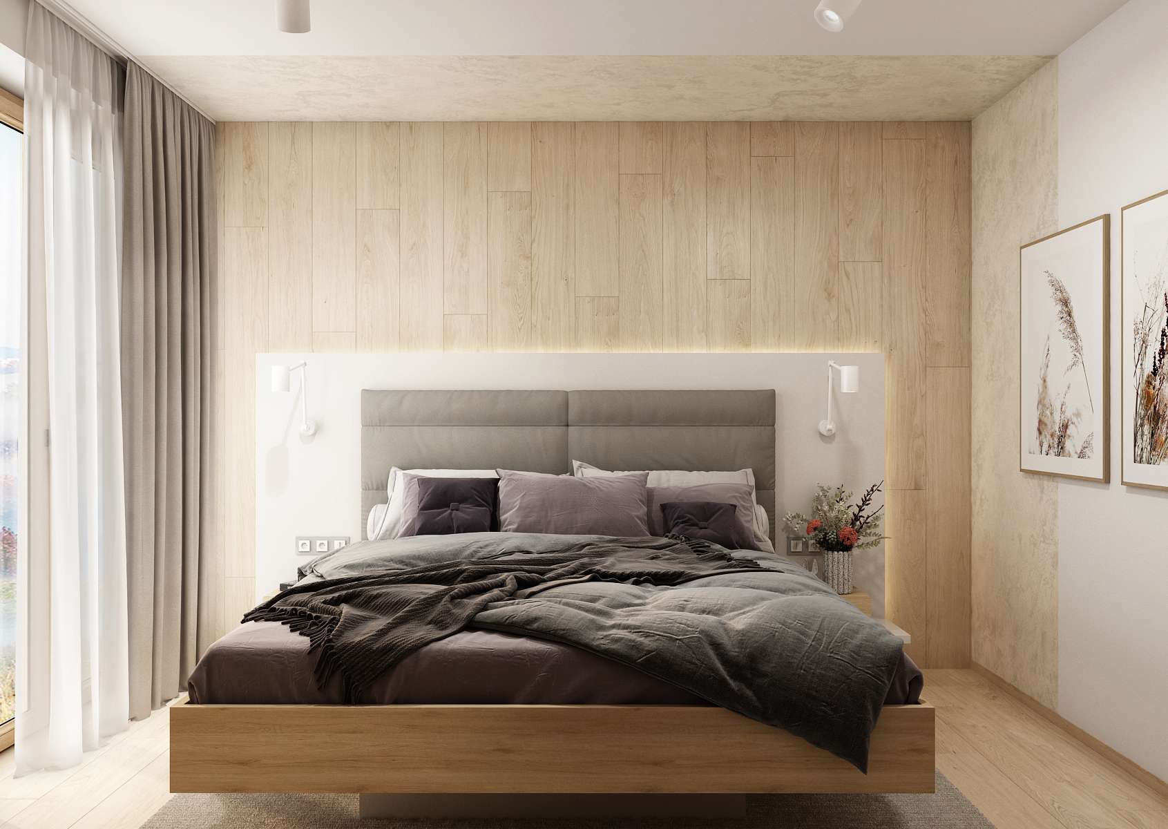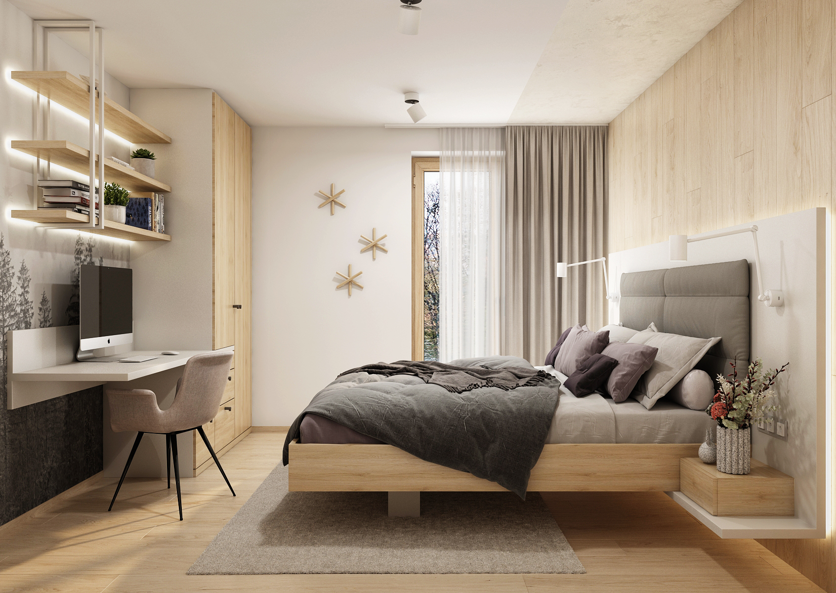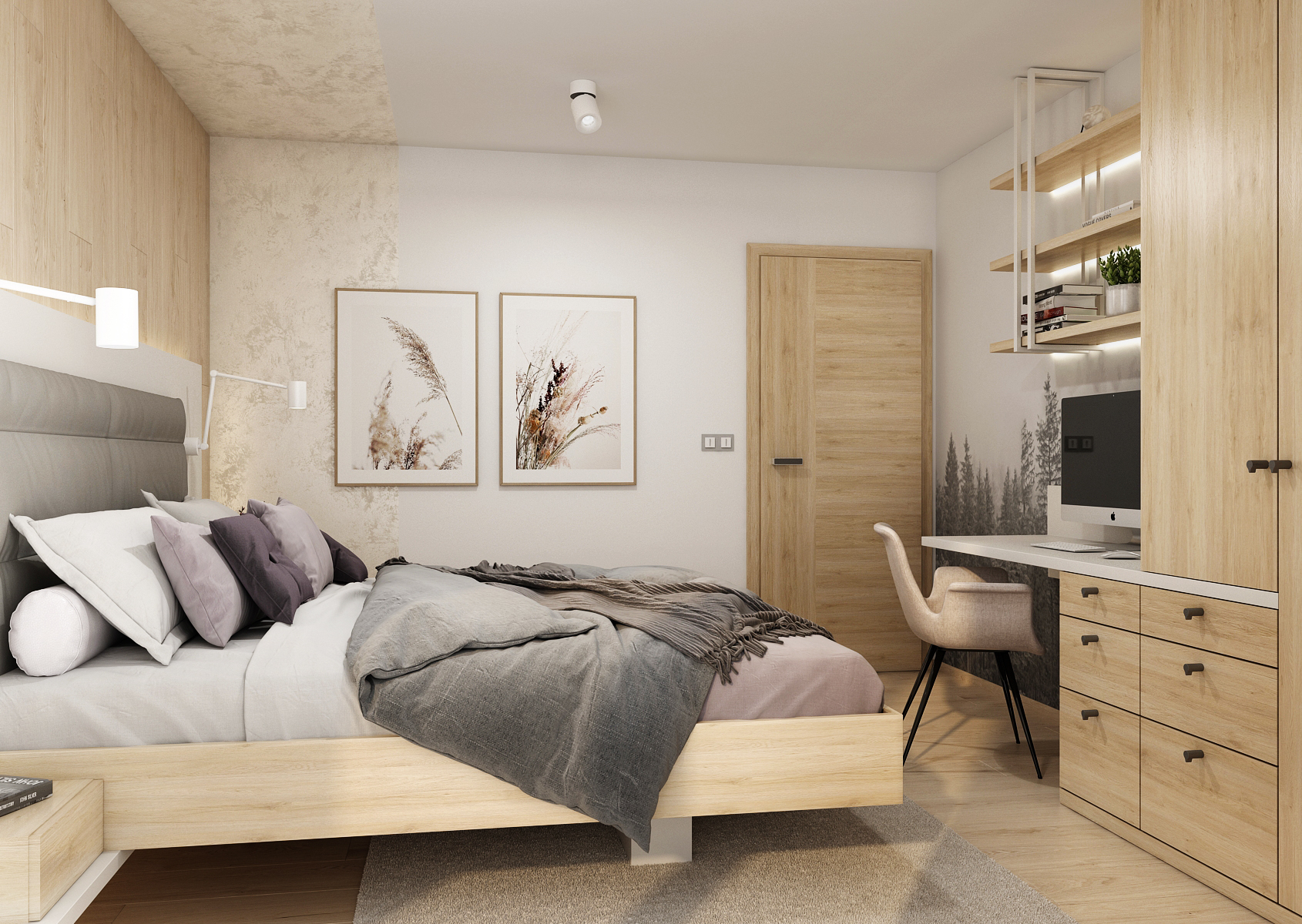 Ložnice je vybavena prostorným lůžkem, které působí dojmem levitace, s čelním panelem s čalouněnou částí. Nechybí ani ambientní osvětlení a dřevěný obklad po celé ploše stěny za lůžkem. Část okolních stěn a stropu zdobí béžová betonová stěrka. Pracovní místo je propojeno s šatní skříní a podsvícenými policemi. Prostor doplňuje tapeta lesa a věšáky Logs od značky TON.