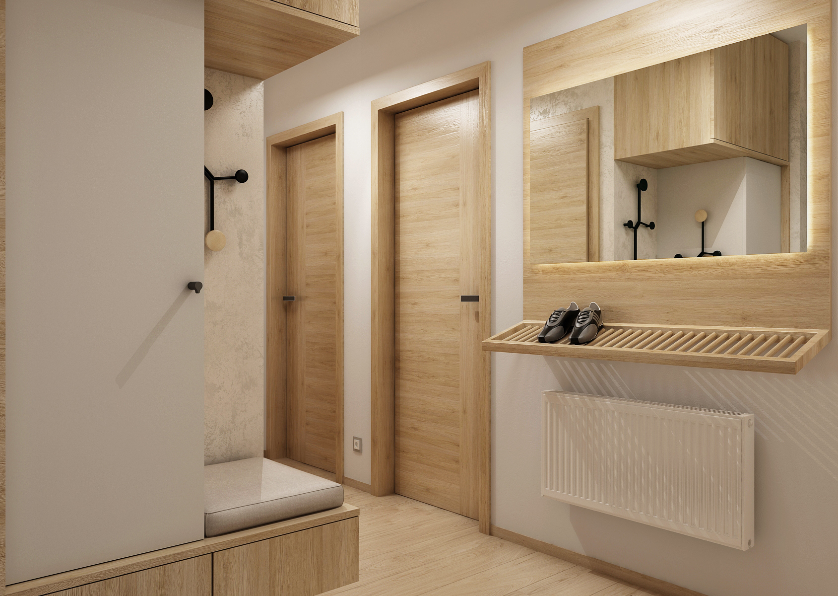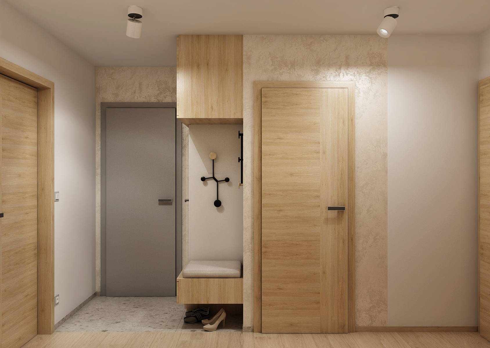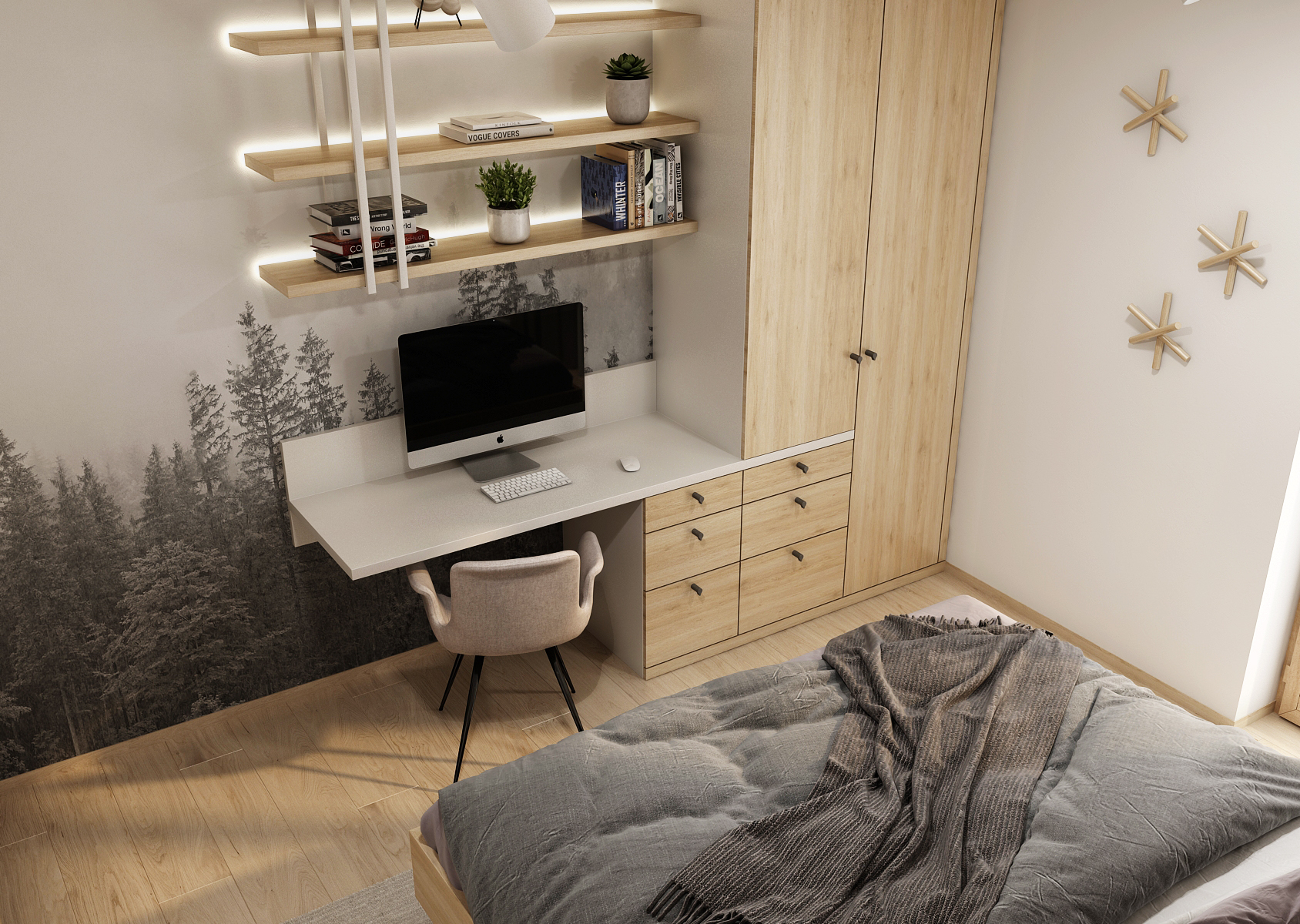 Ložnice je vybavena prostorným lůžkem, které působí dojmem levitace, s čelním panelem s čalouněnou částí. Nechybí ani ambientní osvětlení a dřevěný obklad po celé ploše stěny za lůžkem. Část okolních stěn a stropu zdobí béžová betonová stěrka. Pracovní místo je propojeno s šatní skříní a podsvícenými policemi. Prostor doplňuje tapeta lesa a věšáky Logs od značky TON.