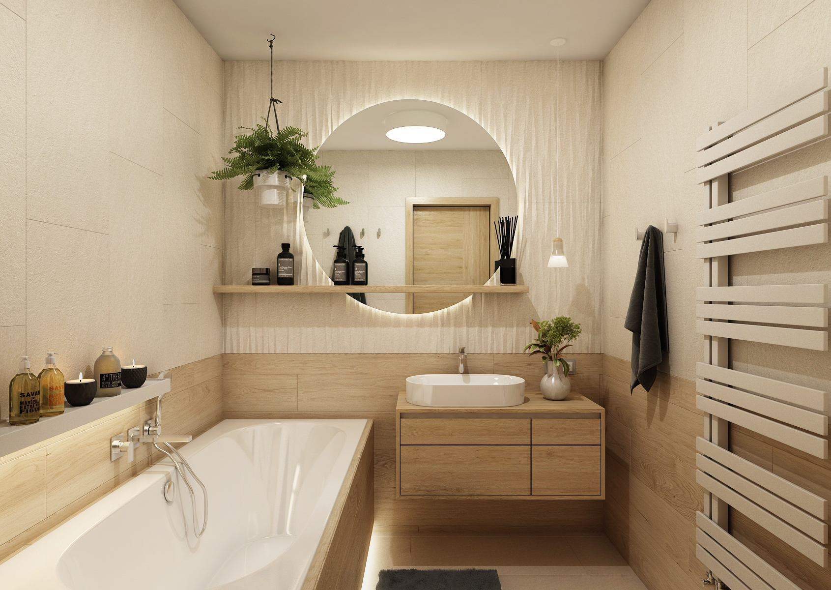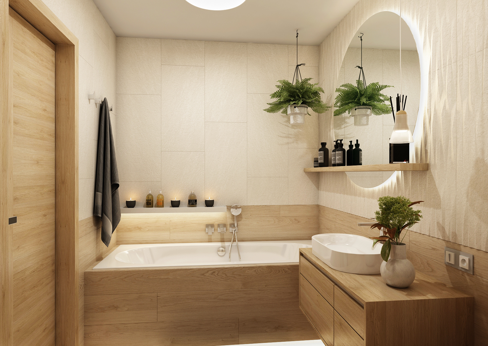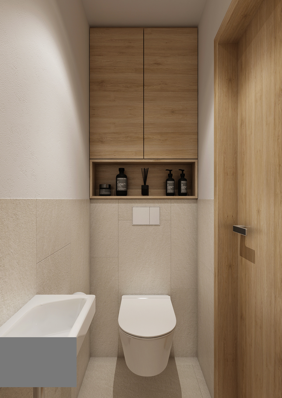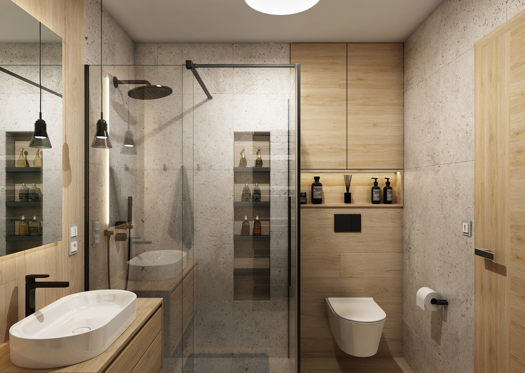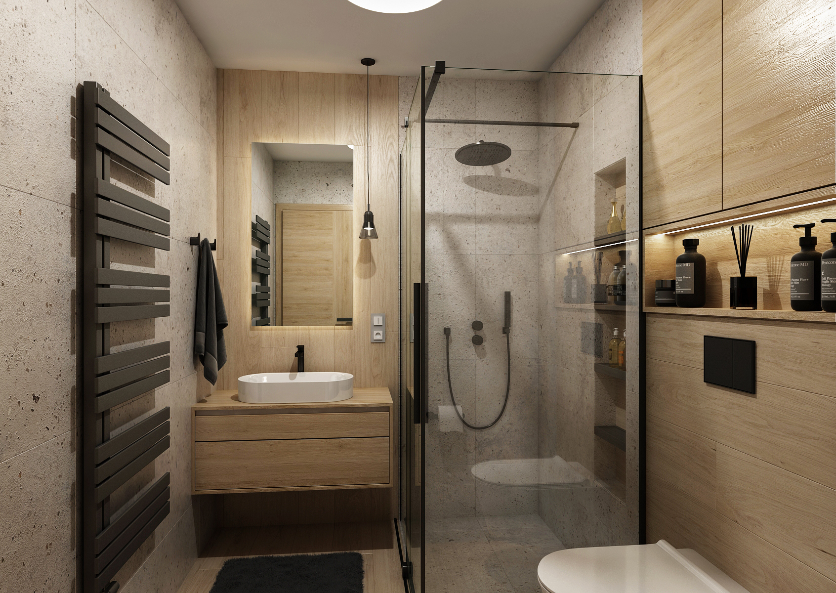 Koupelnám a toaletě se dřevěné obklady také nevyhnuly. Jsou zde v kombinaci s velkoformátovým kamenným obkladem a černými doplňky. Nechybí ani podsvícení kolem zrcadla a ve výklenku.