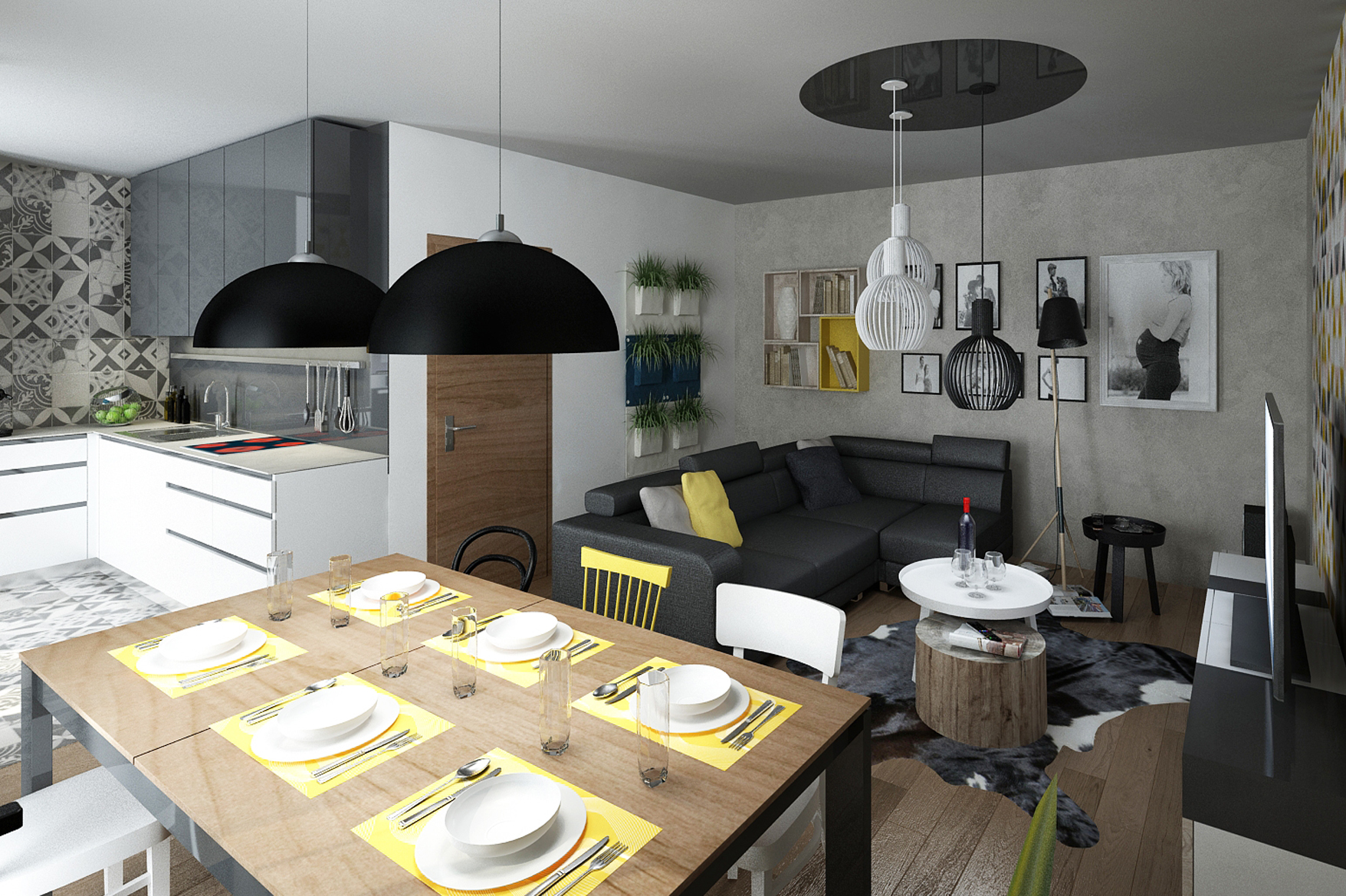 Obývací pokoj s kuchyňským koutem a jídelnou
