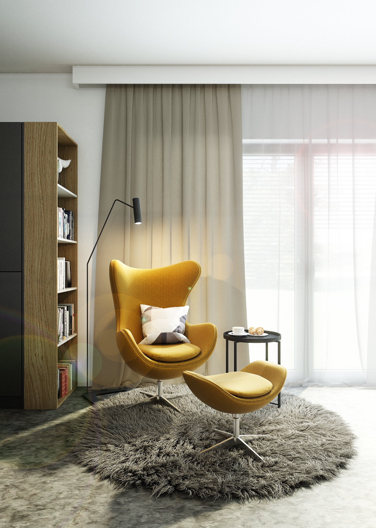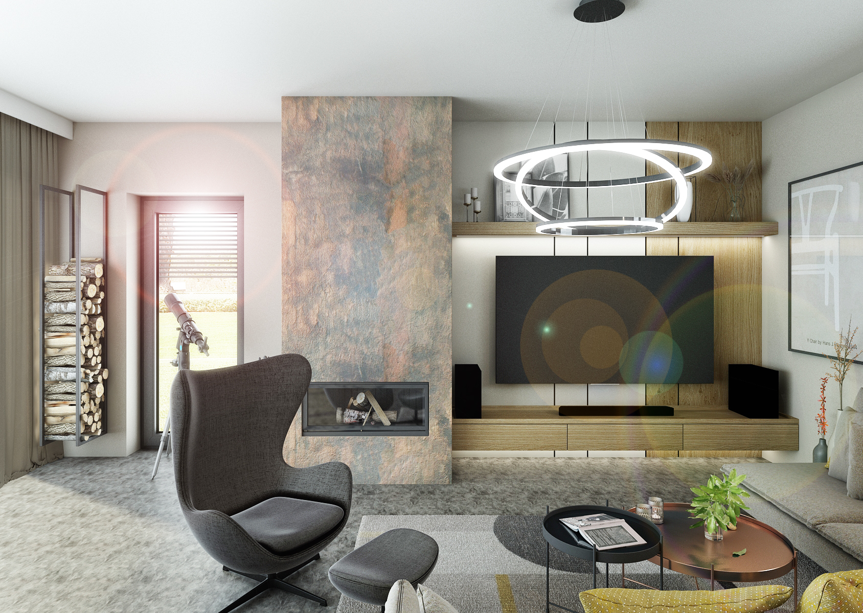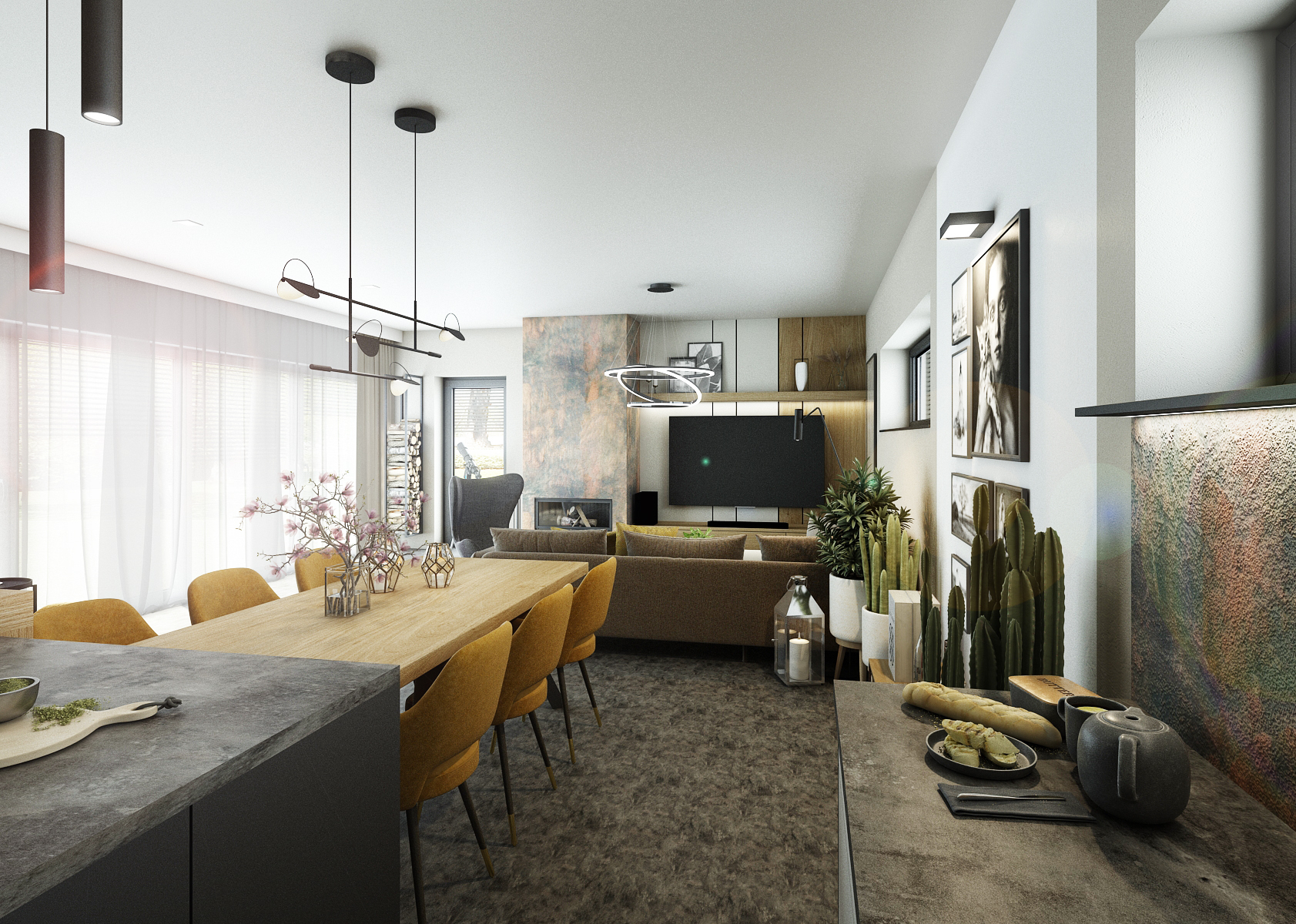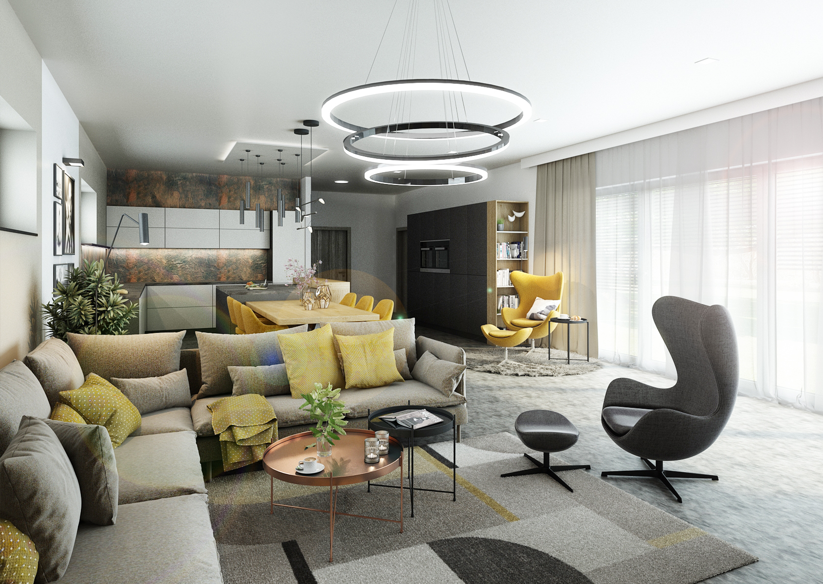 Obytný prostor disponuje hlavně velkými francouzskými okny, které místnosti dodávají dostatek přirozeného světla, které je základem pro každý interiér. Obývací pokoj je laděn do zemitých tónů barev s občasnými barevnými akcenty, čímž si zachovává svou střízlivost. Šedou a béžovou barvou zde prostupuje okrová barva, která se nachází na bytovém textilu či nábytkových prvcích. Betonová stěrka zdobící jak krb, tak i kuchyň dodává díky své výrazné struktuře a barvě živost celému interiéru.