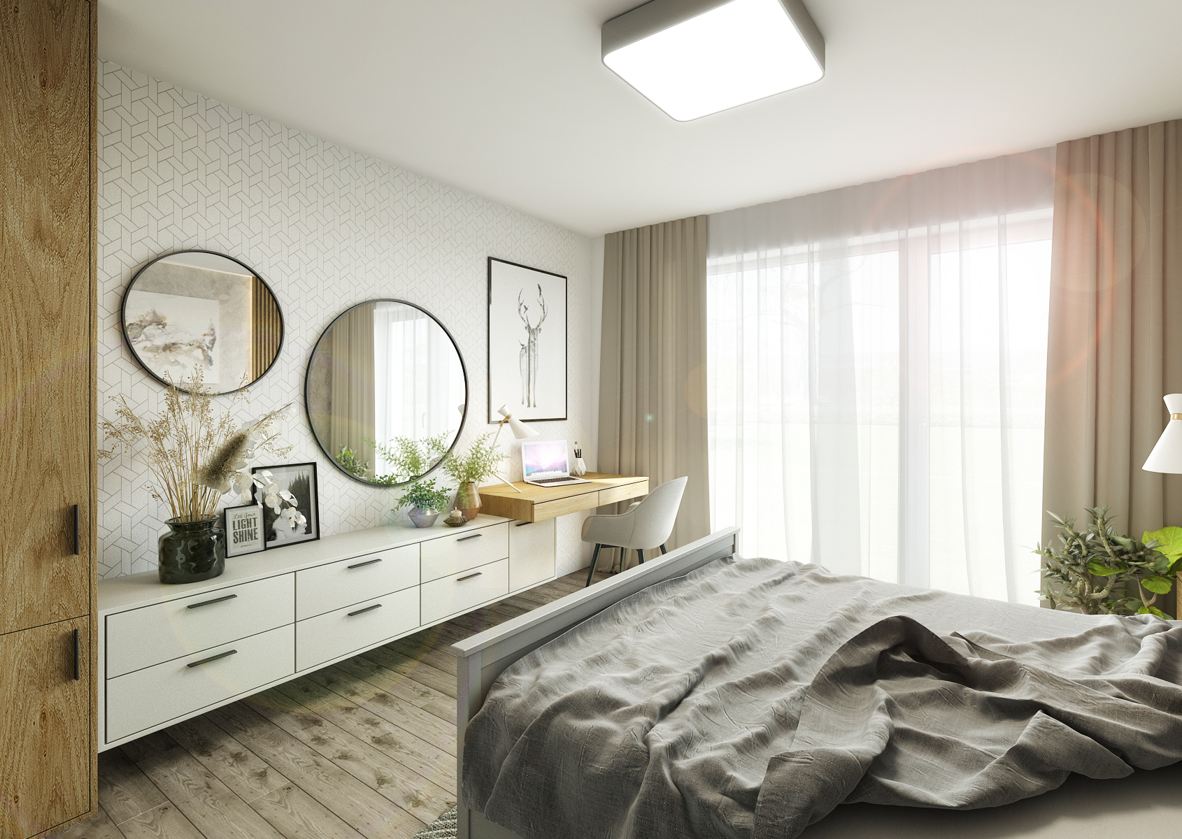 Strukturovaná betonová stěrka je využita i v jedné z ložnic, ovšem v něžnějším a méně výrazném tónu béžové. Ta je skvěle doplňována dubovým dřevem v podobě lamelových panelů, nočních stolků a pracovního prostoru naproti postele. Kromě stěrky je zde další zeď zpestřena vzorovanou tapetou. Druhá ložnice pro změnu hraje odstíny šedé, která je podpořena různým podsvícením či originálním svítidlem.