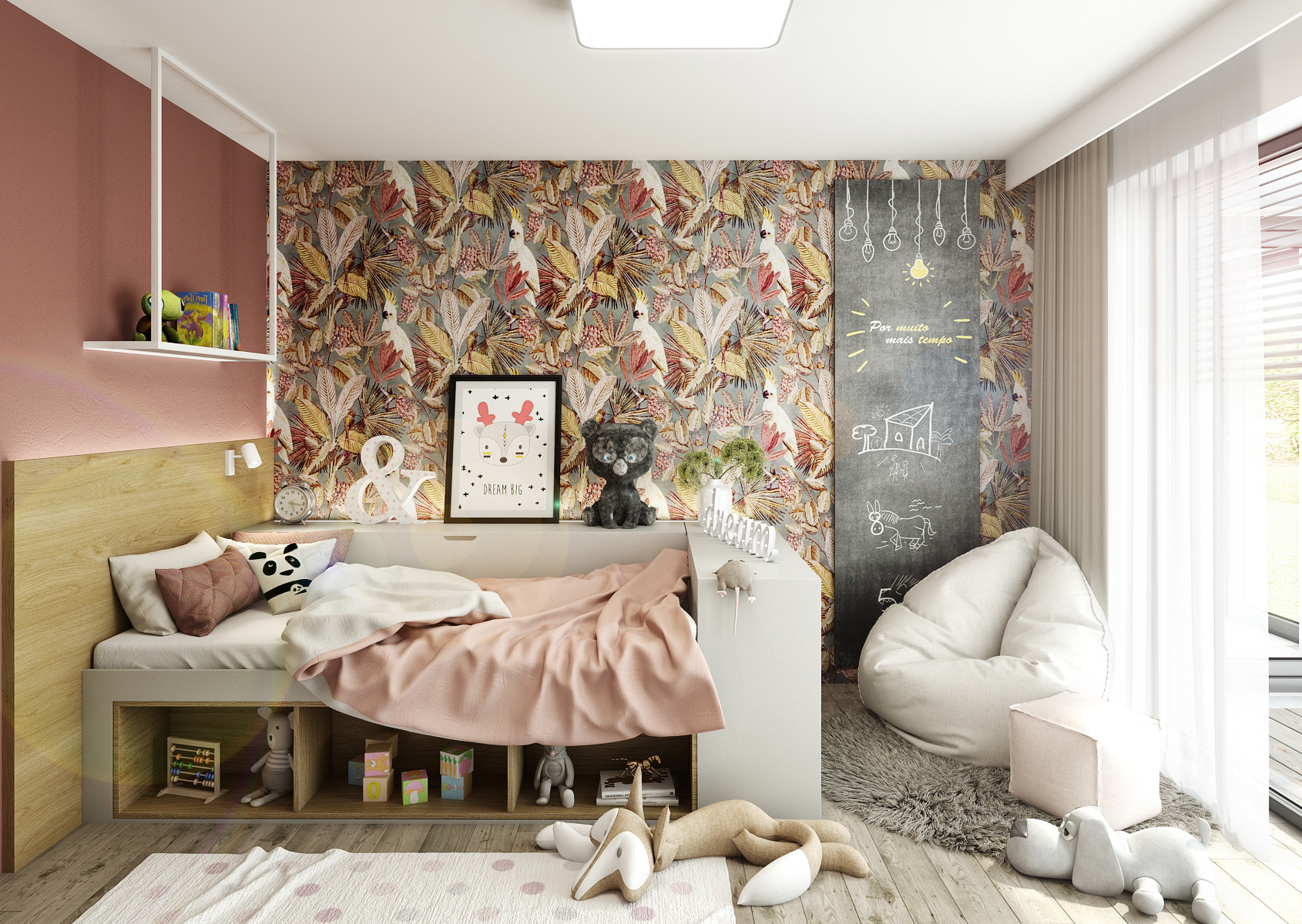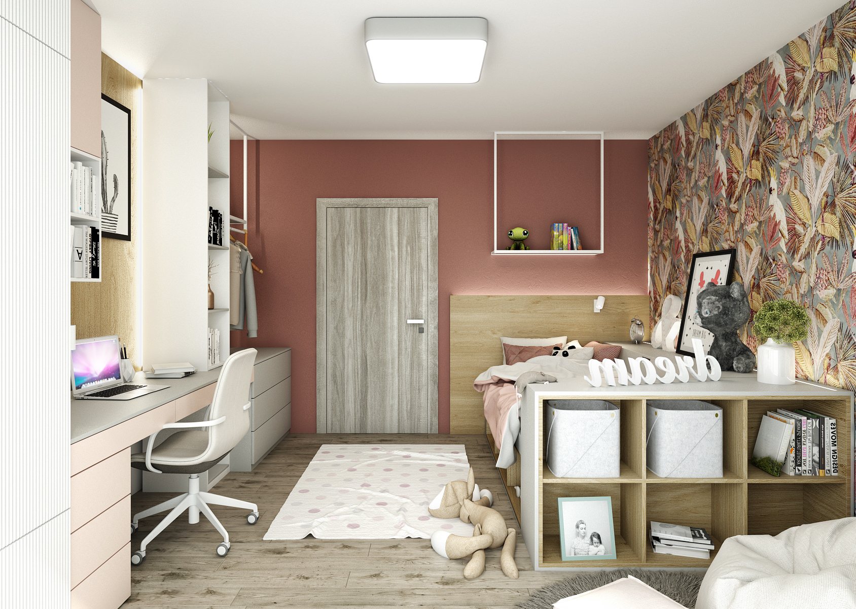 Dětský pokoj je pro změnu velice výrazný, ať už volbou výmalby či tapety, která v podobě listů s papouskem Jaco ladí i se zvoleným bytovým textilem. Postel s podsvíceným čelem nabízí spoustu jak úložného prostoru, tak i odkládacích míst. Protější stěna slouží jako šatní skříň a pracovní místo dohromady, opět je laděno do jemné růžové s prostupujícím dekorem dřeva.