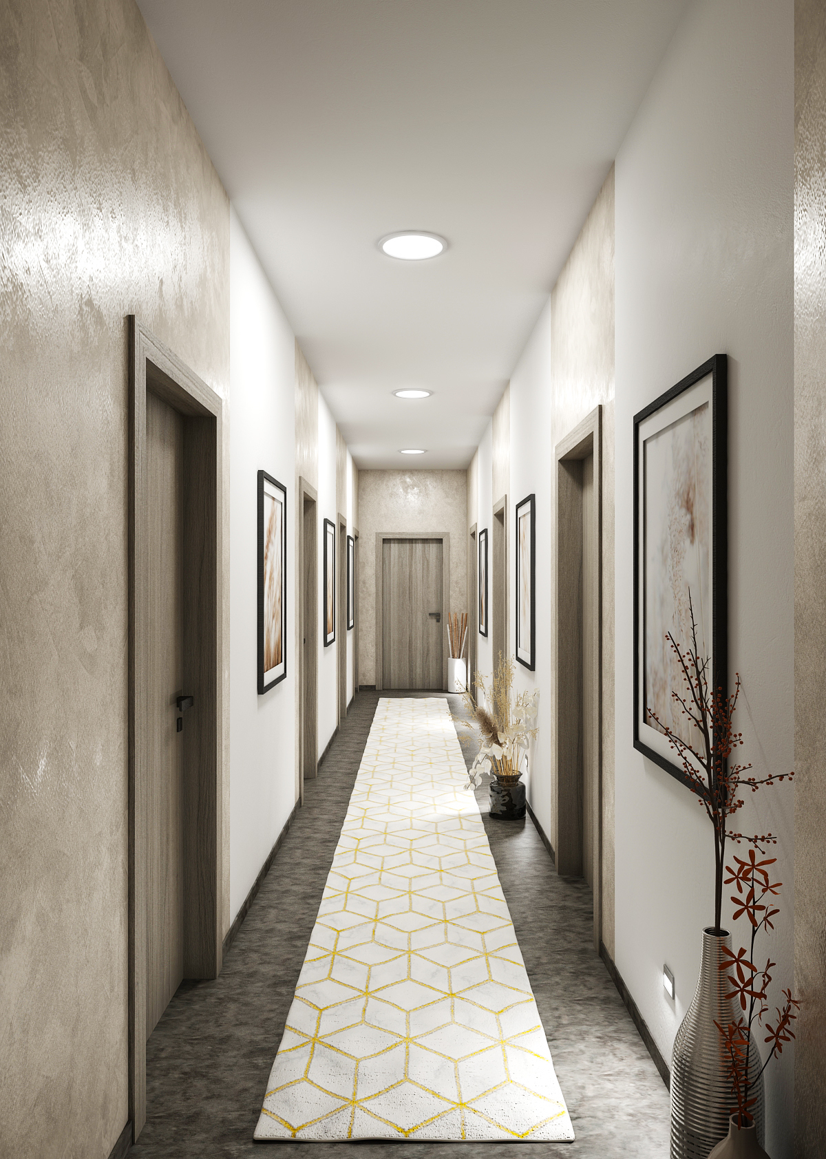 Kromě přirozeného světla je i to umělé potřeba. Nad odkládacími stolky se nachází několik kruhových svítidel kopírujíc tak tvar stolků, kuchyni a jídelnu kromě závěsných svítidel osvětlují i LED pásky jak pod horními skříňkami, tak i ve stropním podhledu.