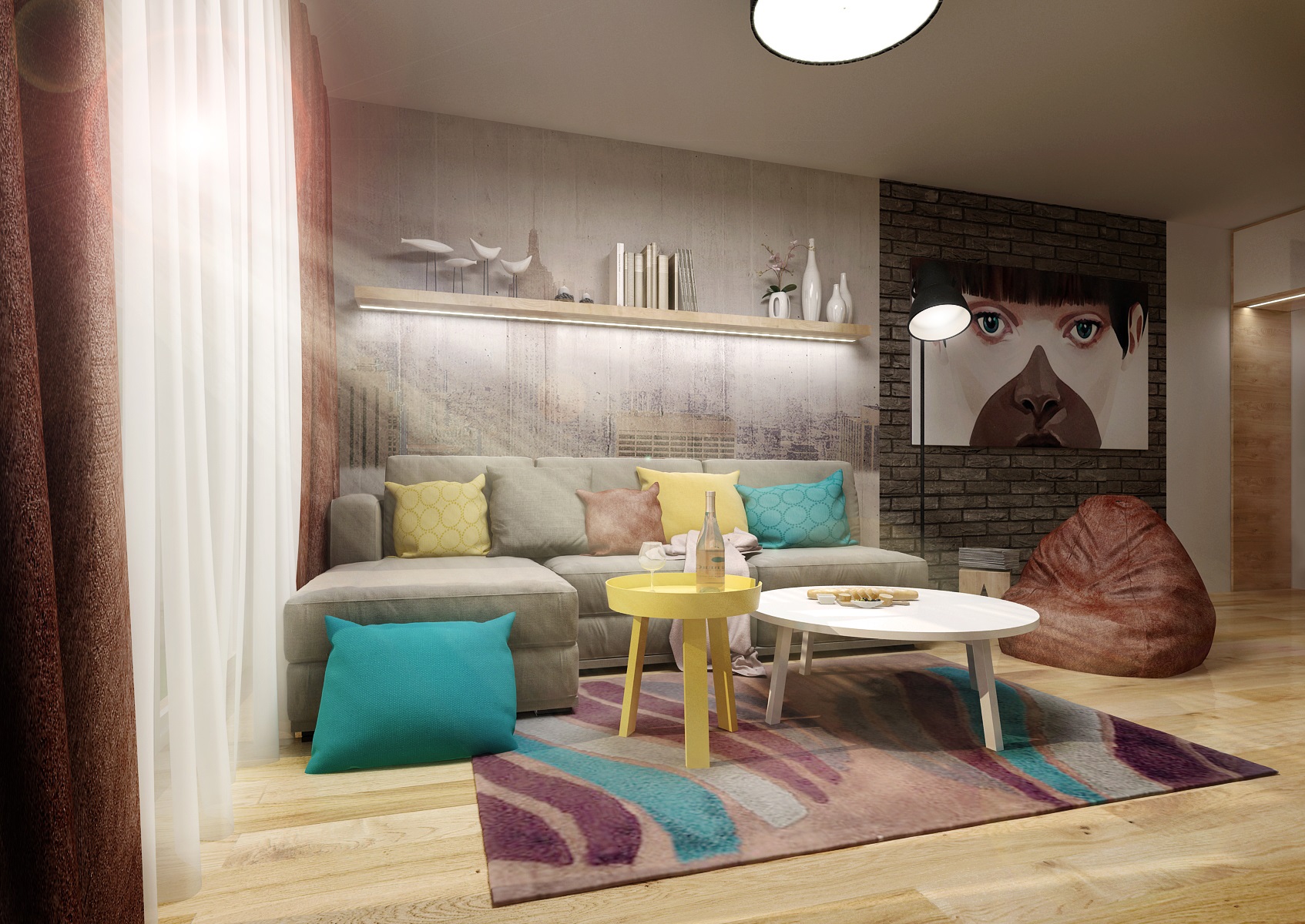 Stylové "mladé" bydlení s dubovou vinylovou podlahou, antracitovým kamenným obkladem, vintage tapetou za šedou sedací soupravou s lenoškou a stěnou s obkladem v ocelové barvě. Výrazné barvy na dekoracích, textilu a stěnách vyvažuje bílá a dřevodekor dubu na nábytku.