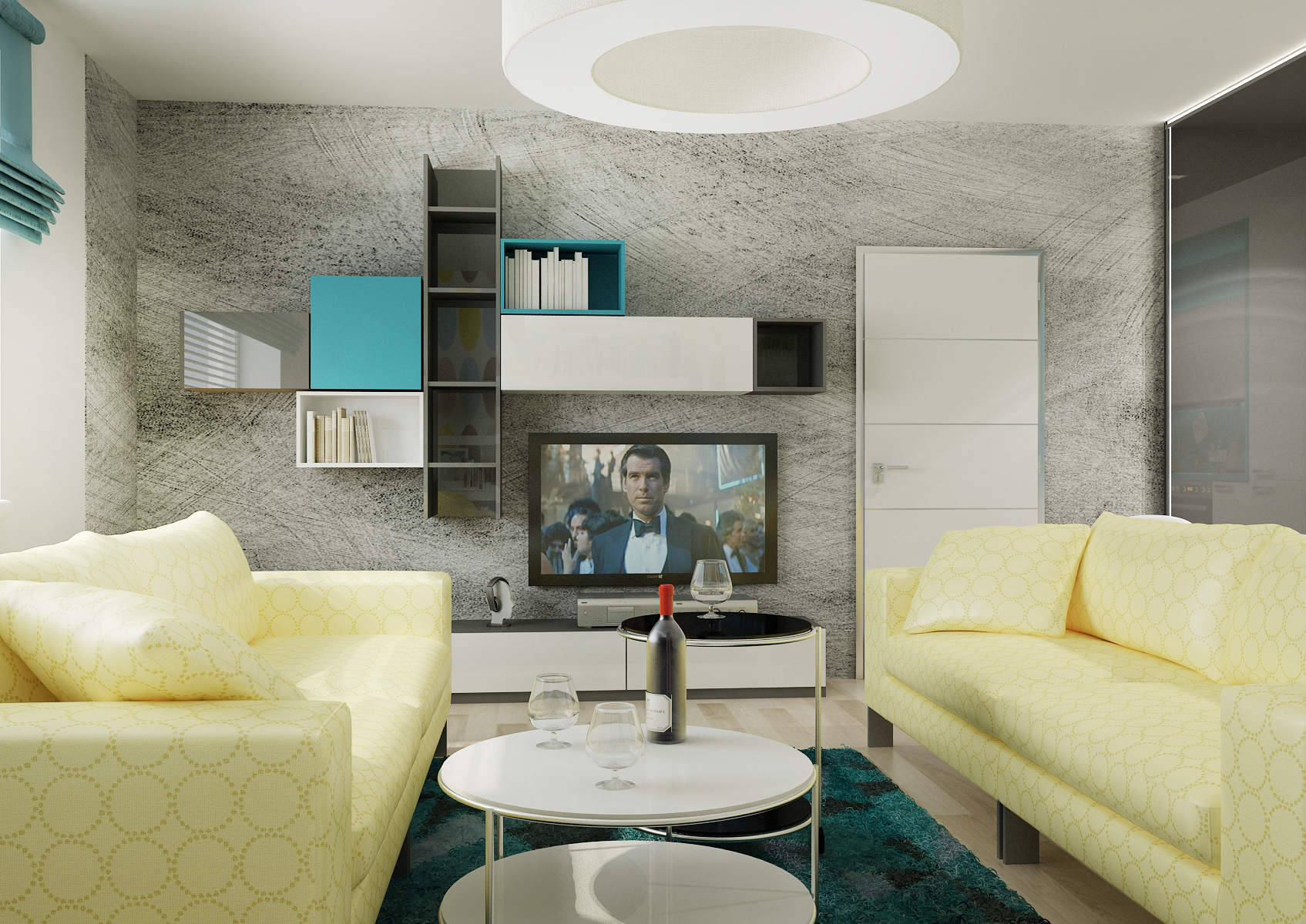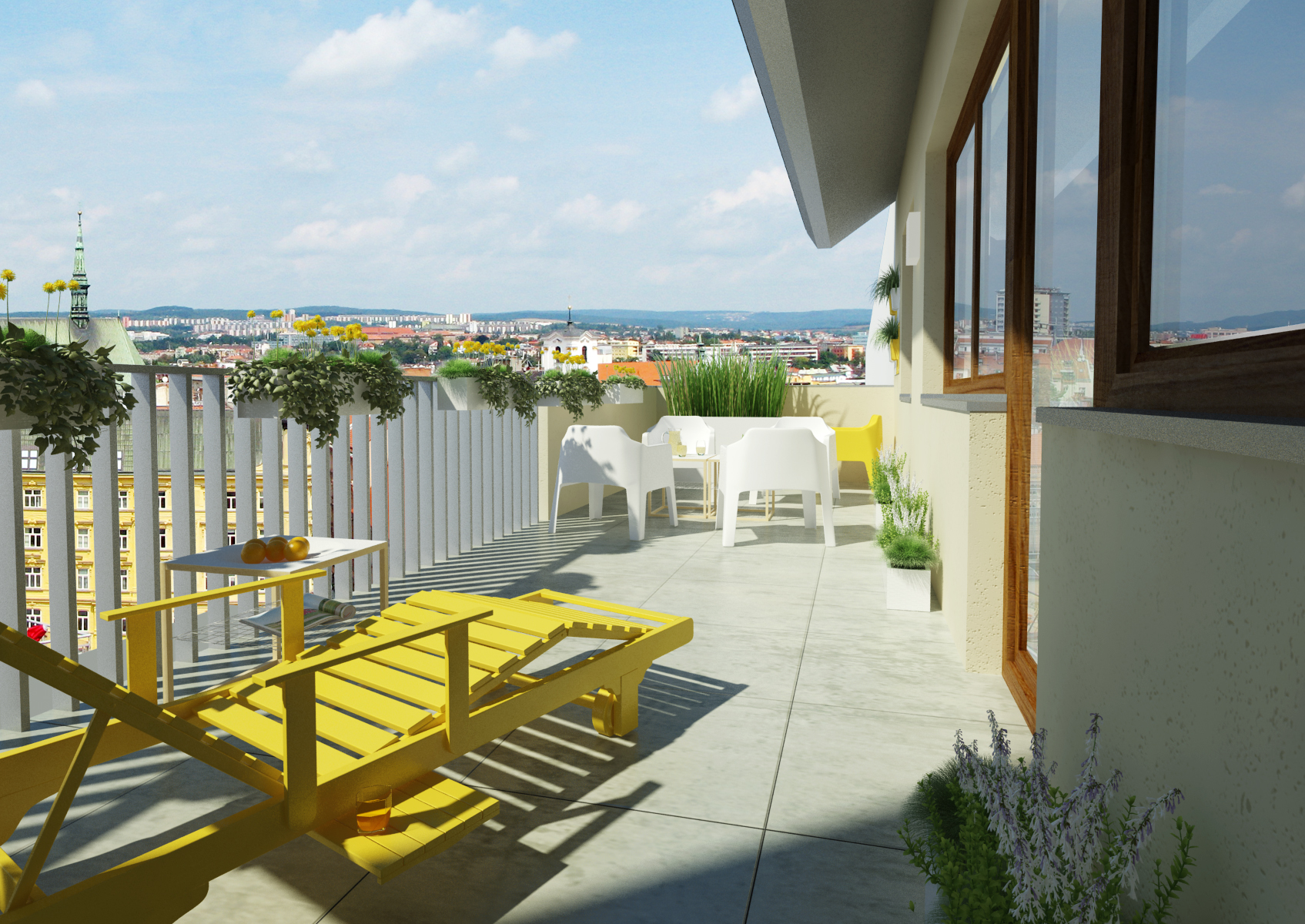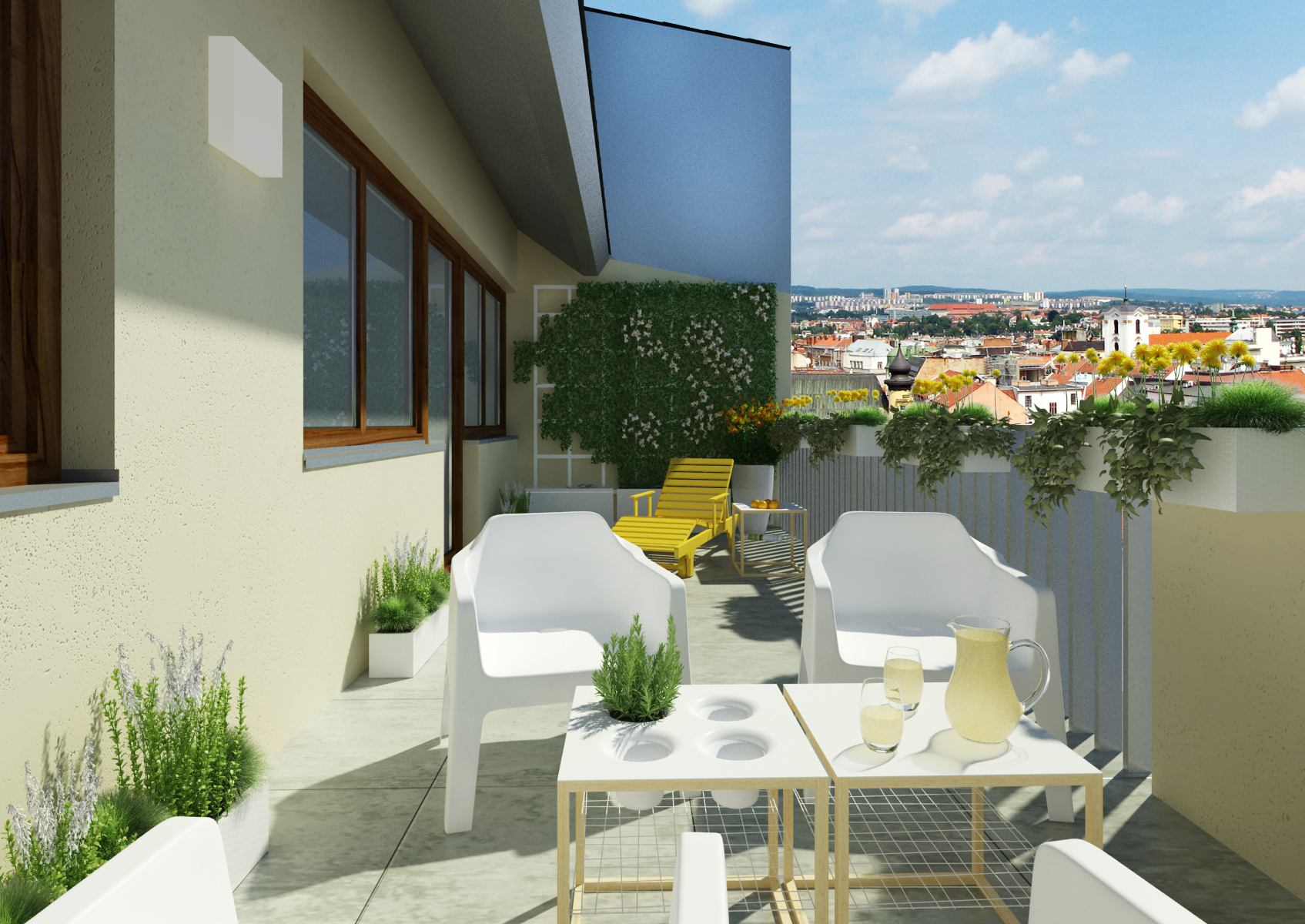 Malý byt v centru Brna, ale zato s terasou a výhledem na centrum města. V obývacím pokoji s kuchyní zaujmou výrazné barvy žluté s tyrkysovou na skleněném obkladu v kuchyni, sedačce, koberci a hlavně tapeta Heads od LAVMI. Obývací a kuchyňská zóna je pomyslně oddělena černým podsvíceným skleněným obkladem.