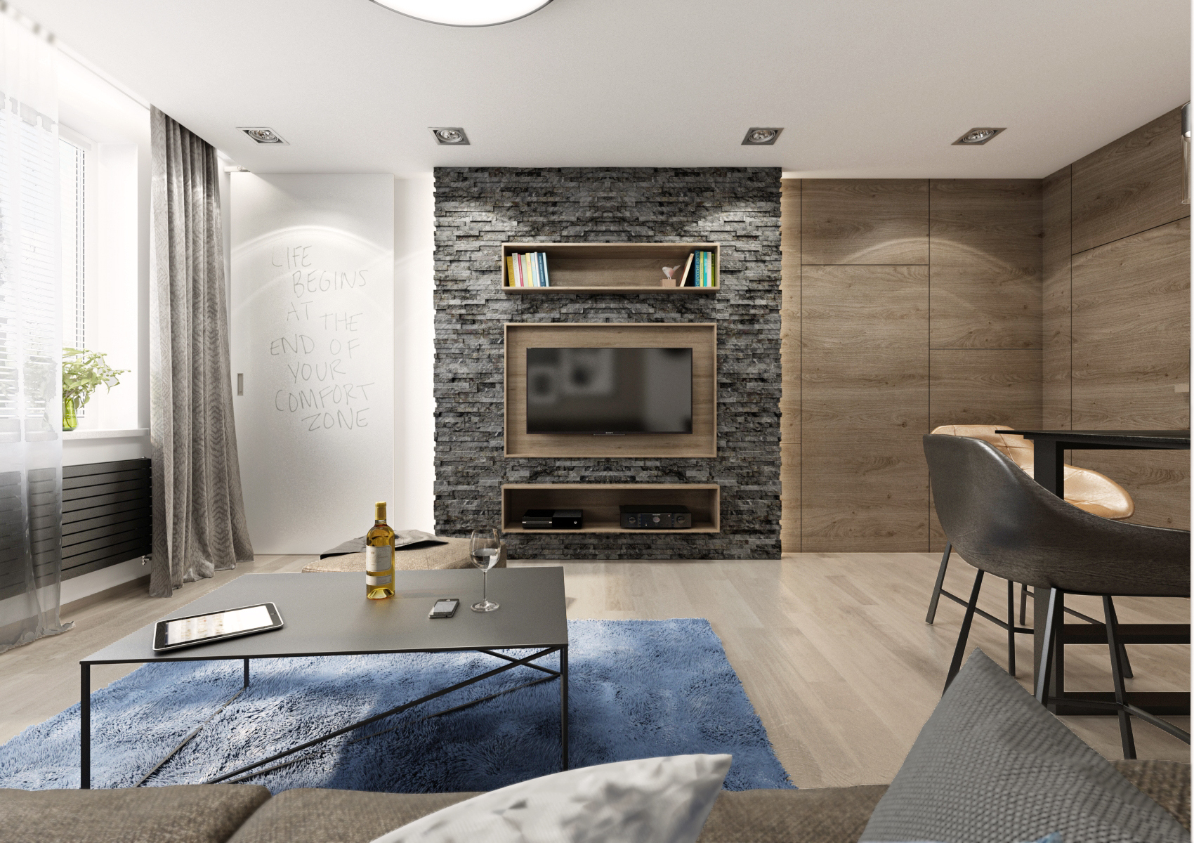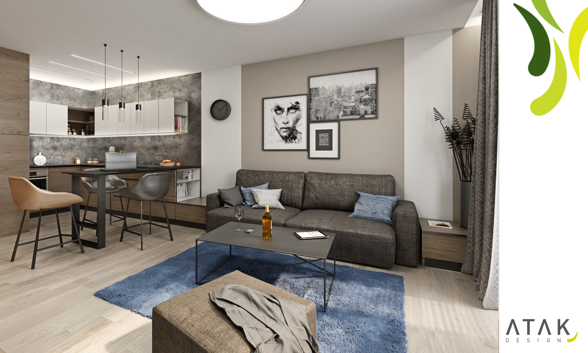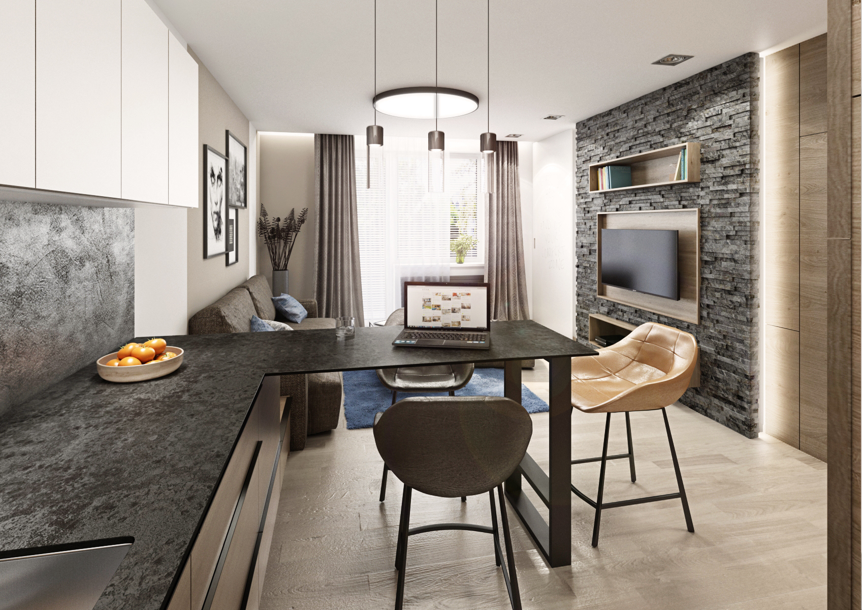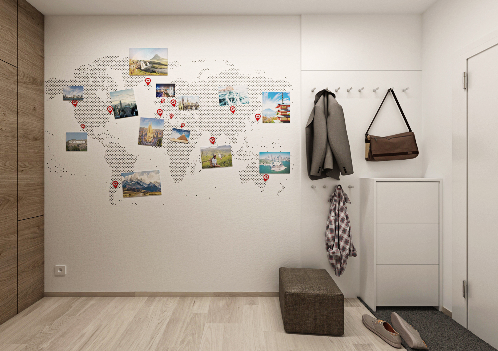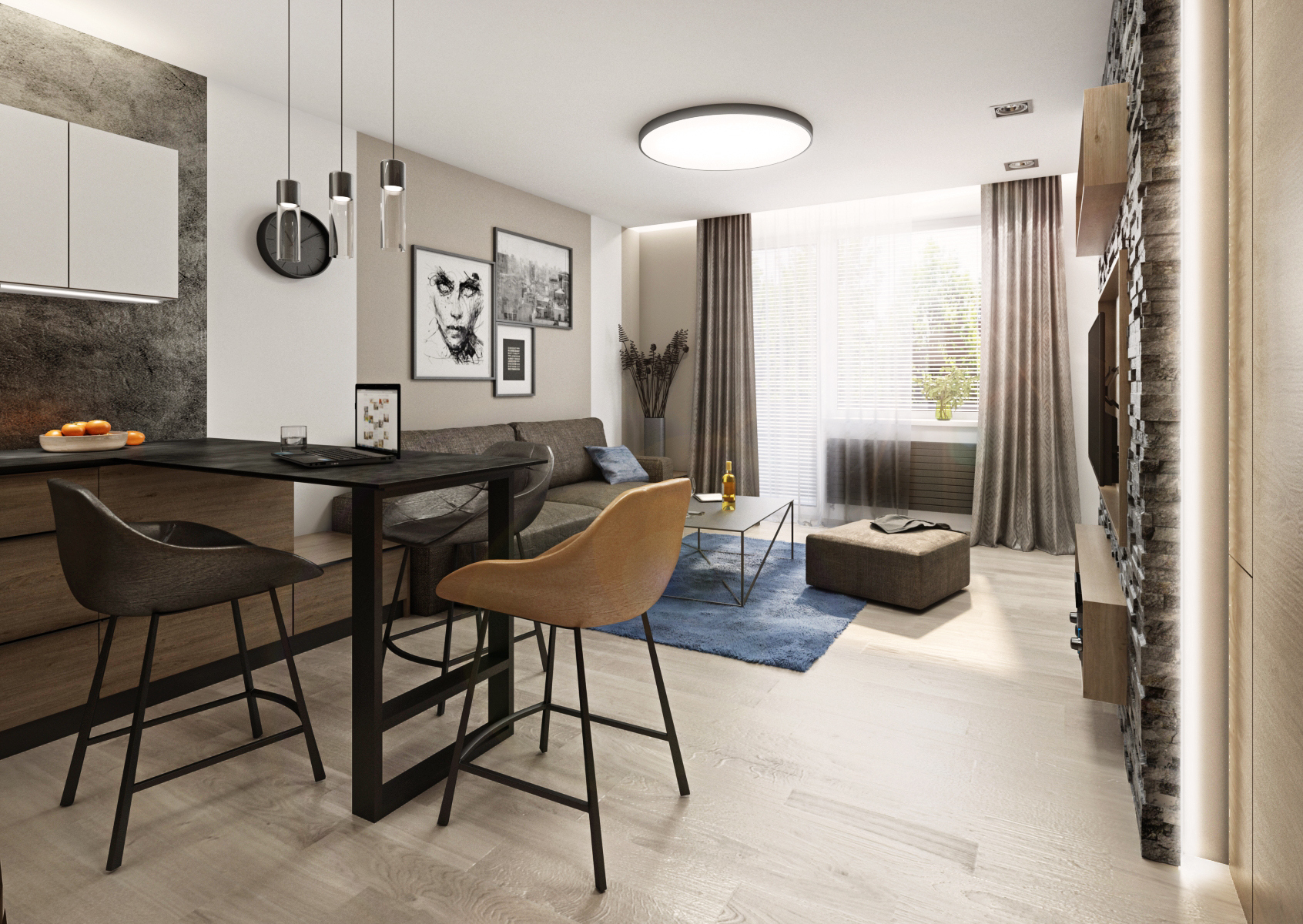 Pánské doupě, které nepostrádá styl a eleganci. Díky své profesy cestuje majitel po celém světě. Navštívená místa si pak „připíchne“ na velkoformátovou tapetu v předsíní. Použitím jednotného materiálu (laminát Dub Halifax tabákový) splývají dveře do pokoje i do koupelny s nábytkem i obložením stěn. Tvoří výškově jednotnou linii od šatní skříně v předsíni až po vestavbu u kuchyňské linky, kde je ukryta lednice. Absenci klasického jídelního stolu nahrazuje pult s barovými křesílky, navazující na kuchyňskou pracovní desku.