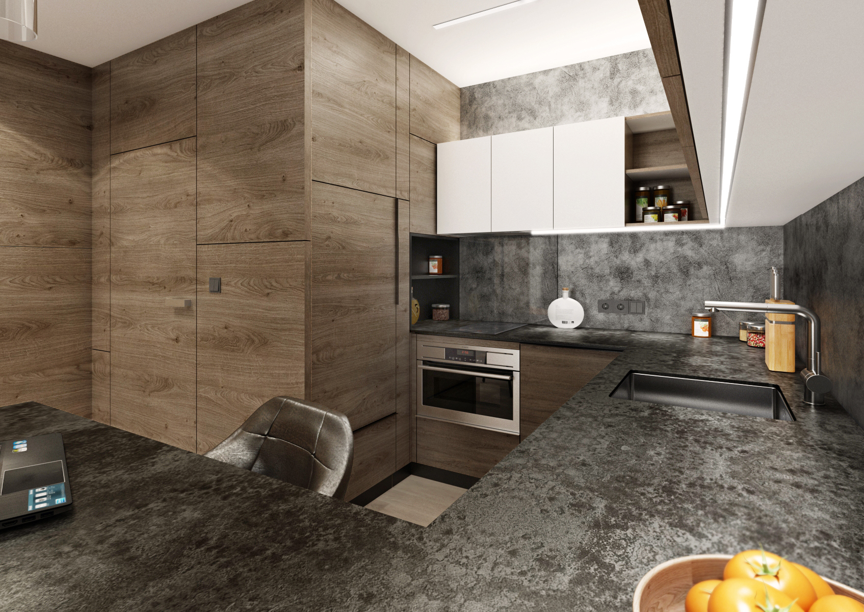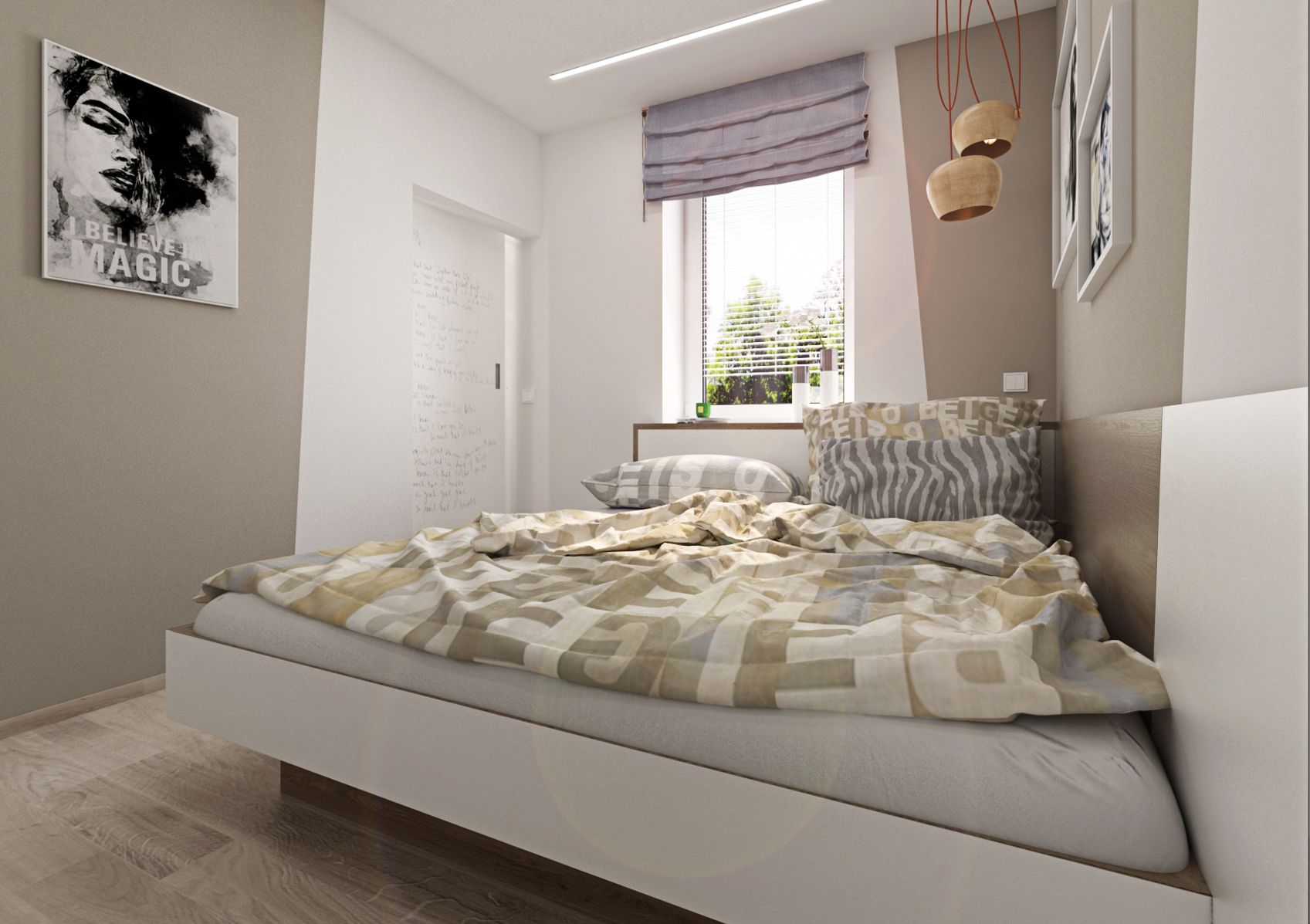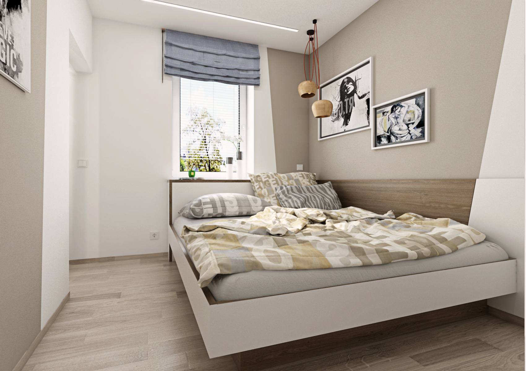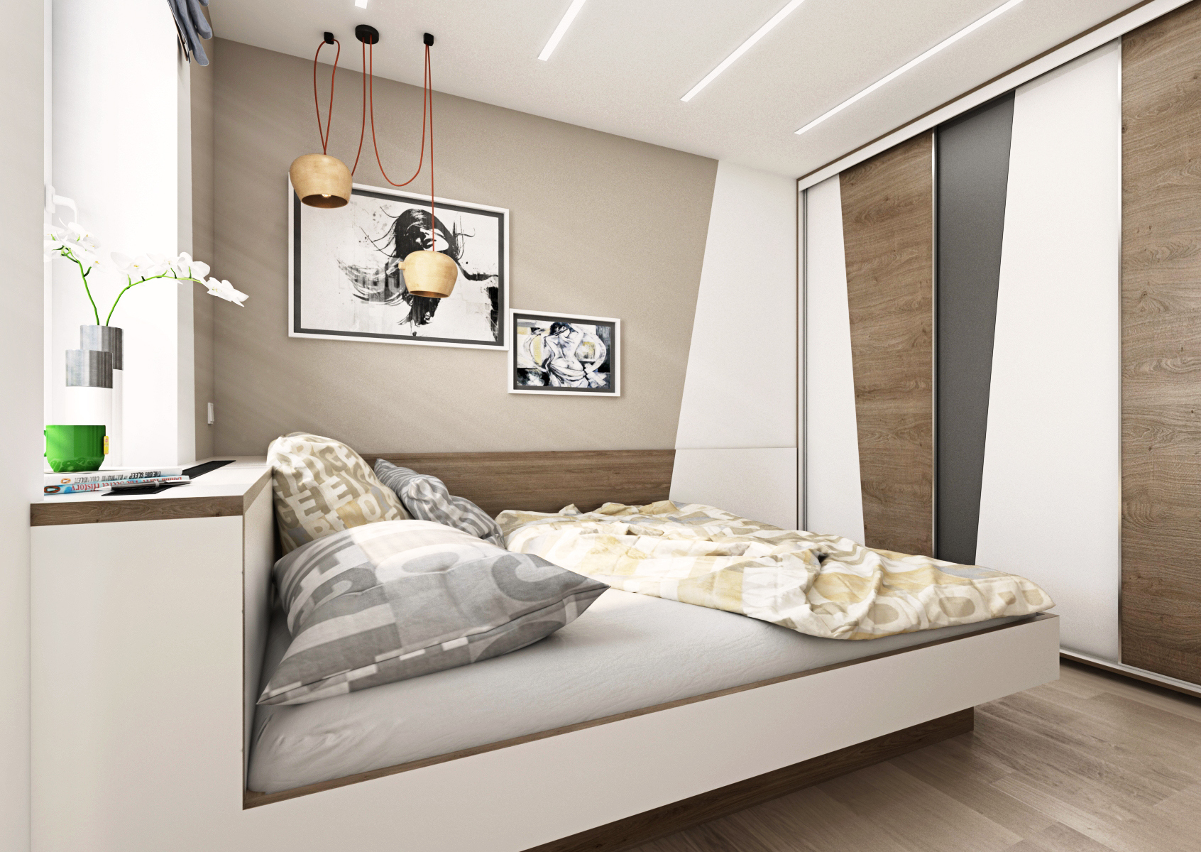 Pro nedostatek místa byly pro vstup do ložnice zvoleny posuvné dveře (s bílým opakovaně popisovacím povrch) a dvojlůžko bylo podélně přisunuto ke zdi, aby šlo projít k šatní skříni. Nábytek byl vyroben na míru v kombinaci stejného dubového dekoru s bílou a šedou (laminát EGGER Hedvábně bílá a Onyxově šedá), kdy bílé desky byly pro efekt opatřeny dubovou ABS hranou.