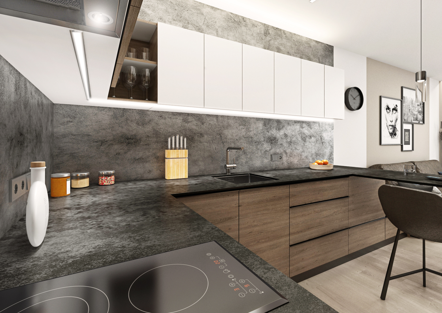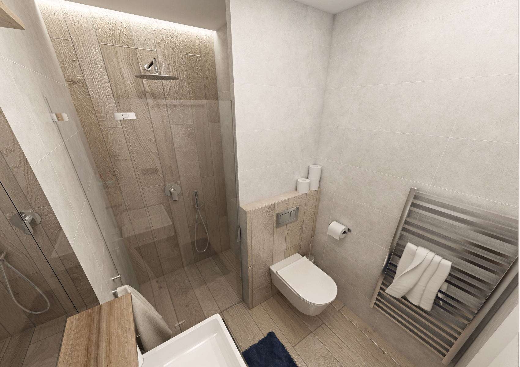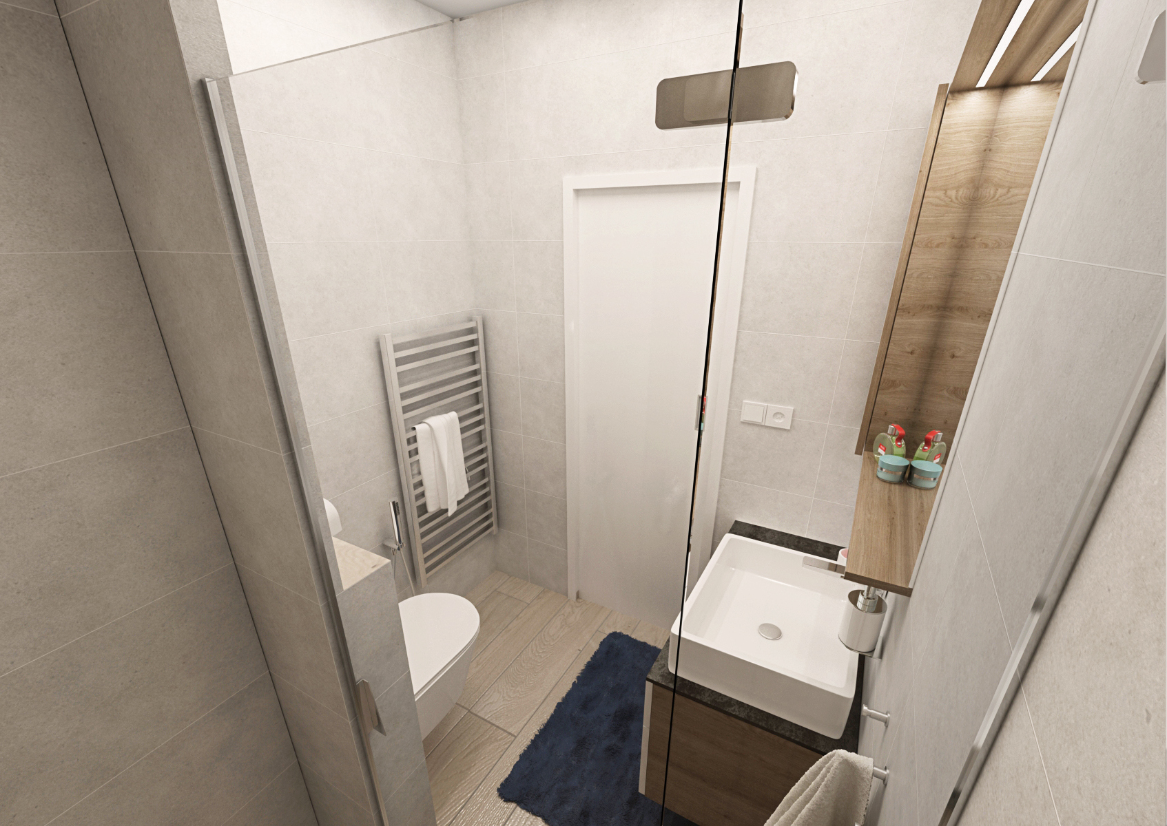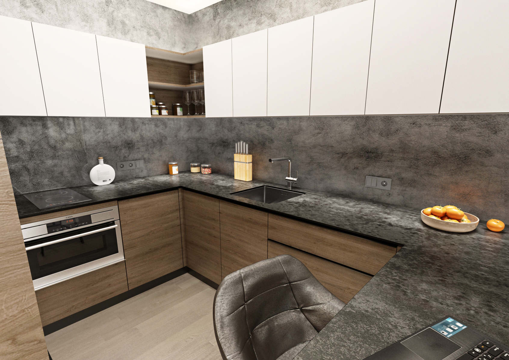 Pro nedostatek místa byly pro vstup do ložnice zvoleny posuvné dveře (s bílým opakovaně popisovacím povrch) a dvojlůžko bylo podélně přisunuto ke zdi, aby šlo projít k šatní skříni. Nábytek byl vyroben na míru v kombinaci stejného dubového dekoru s bílou a šedou (laminát EGGER Hedvábně bílá a Onyxově šedá), kdy bílé desky byly pro efekt opatřeny dubovou ABS hranou.