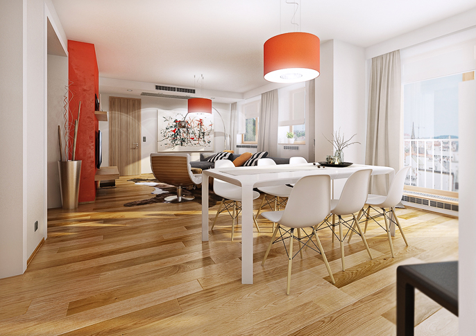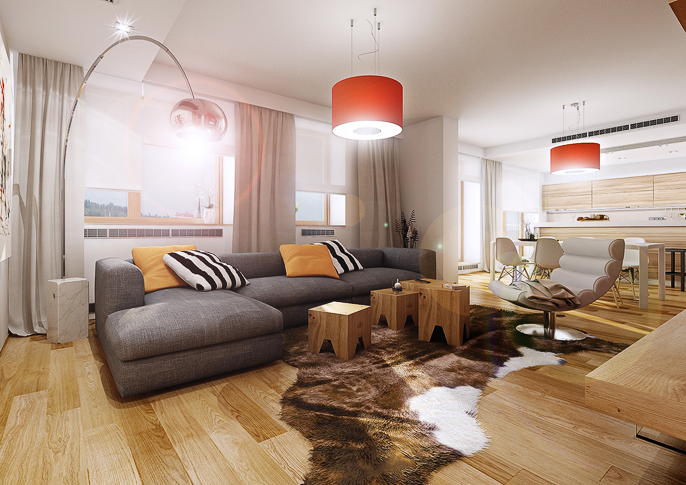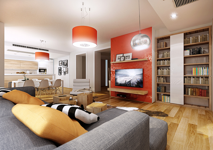 Luxusní interiér apartmánu v kombiinaci s oranžovou