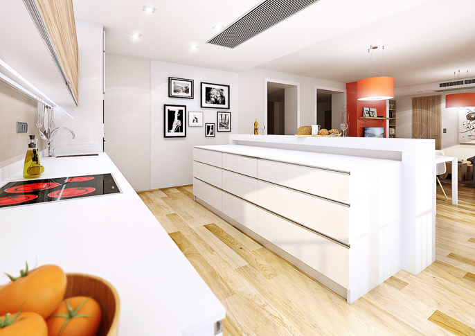 Návrh luxusního apartmánu v novém bytovém domě v Brně. Elegantní krémová a bílá barva je v kontrastu s výrazným oranžovým benátským štukem na stěně s TV a závěsnými svítidly. V kombinaci s bílou barvou interiér působí čistě a moderně. V prostoru jsou použity přírodní prvky typu kožešinového koberce.