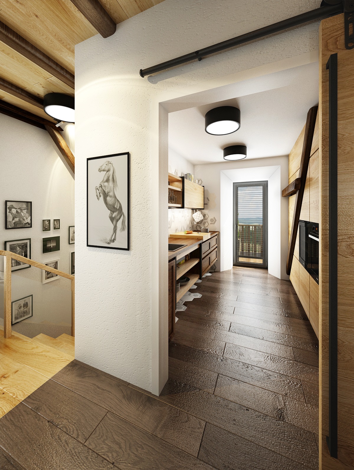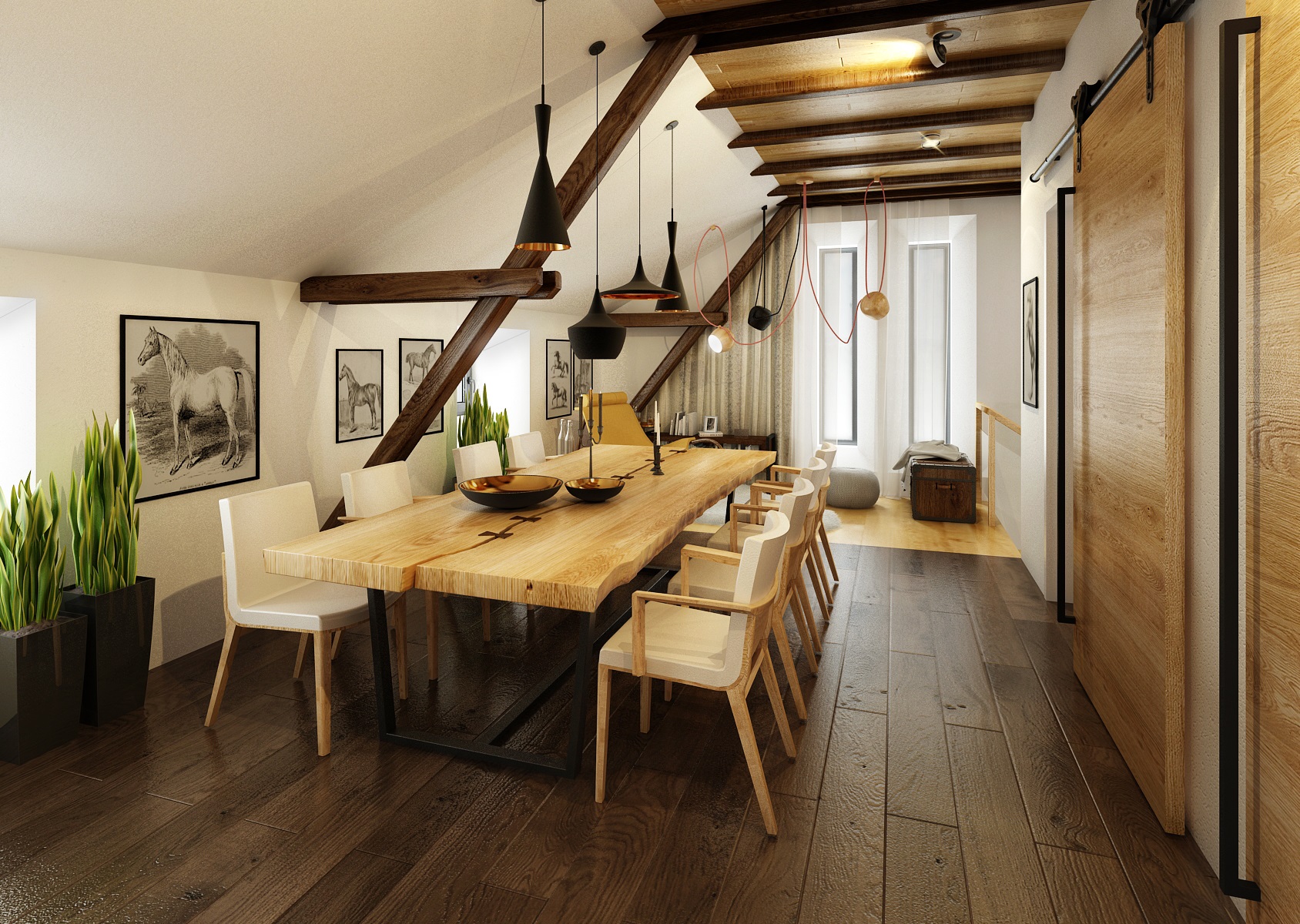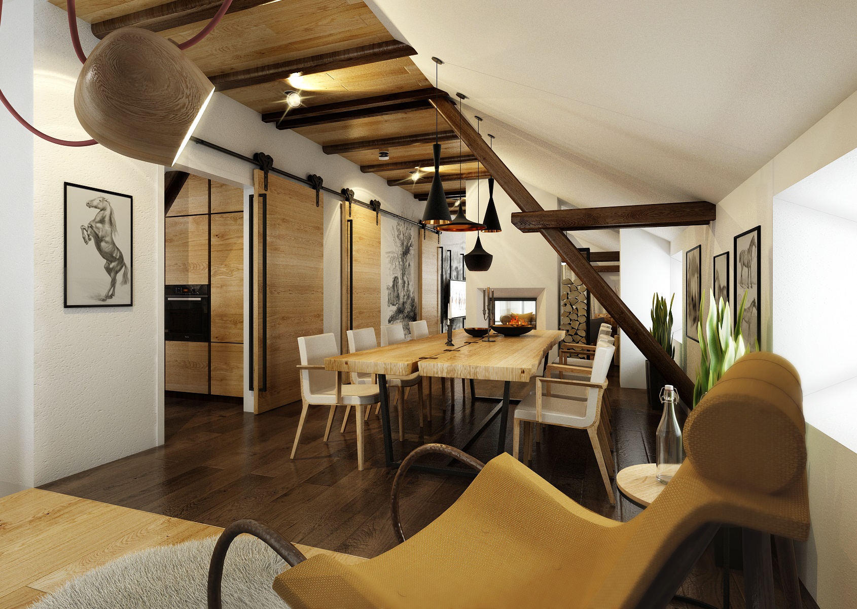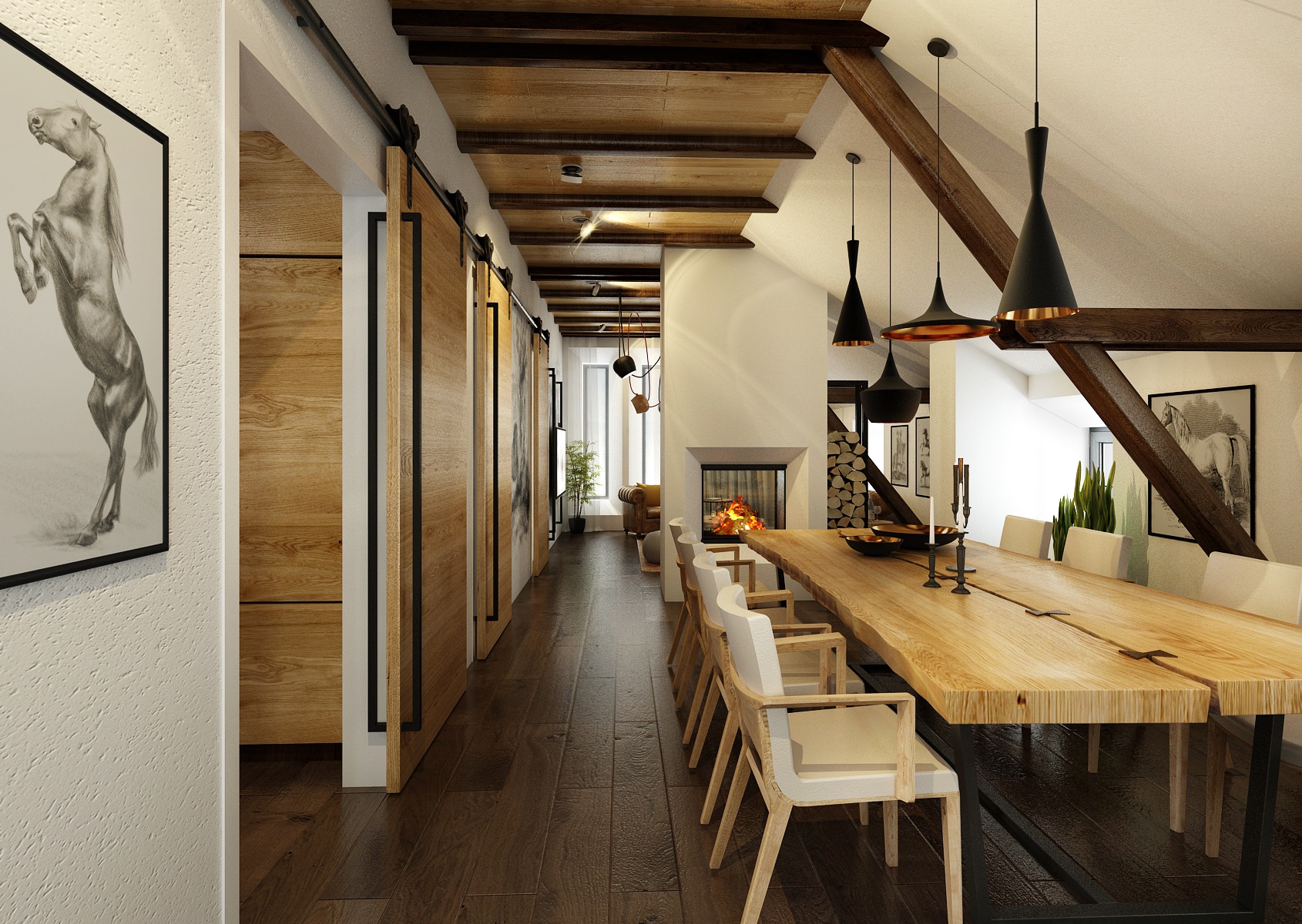 Návrh rekonstrukce půdního prostoru bývalého hospodářského stavení na privátní bydlení. V zadání znělo vytvořit moderní byt s venkovskou tématikou. Hlavní roli hraje masiv, dub, s přírodním a s tmavým mořením, vhodně doplněný černým jeklem. Interiérové posuvné dveře jsou zavěšeny na pojezdovém kování, jako mívají vrata do stodoly. Zůstal přiznaný dřevěný krov a nechybí ani krbová kamna, retro obklady použité v kuchyní a koupelně, stylový nábytek a dekorace, jako jsou například tapeta a kresby s motivem koní.