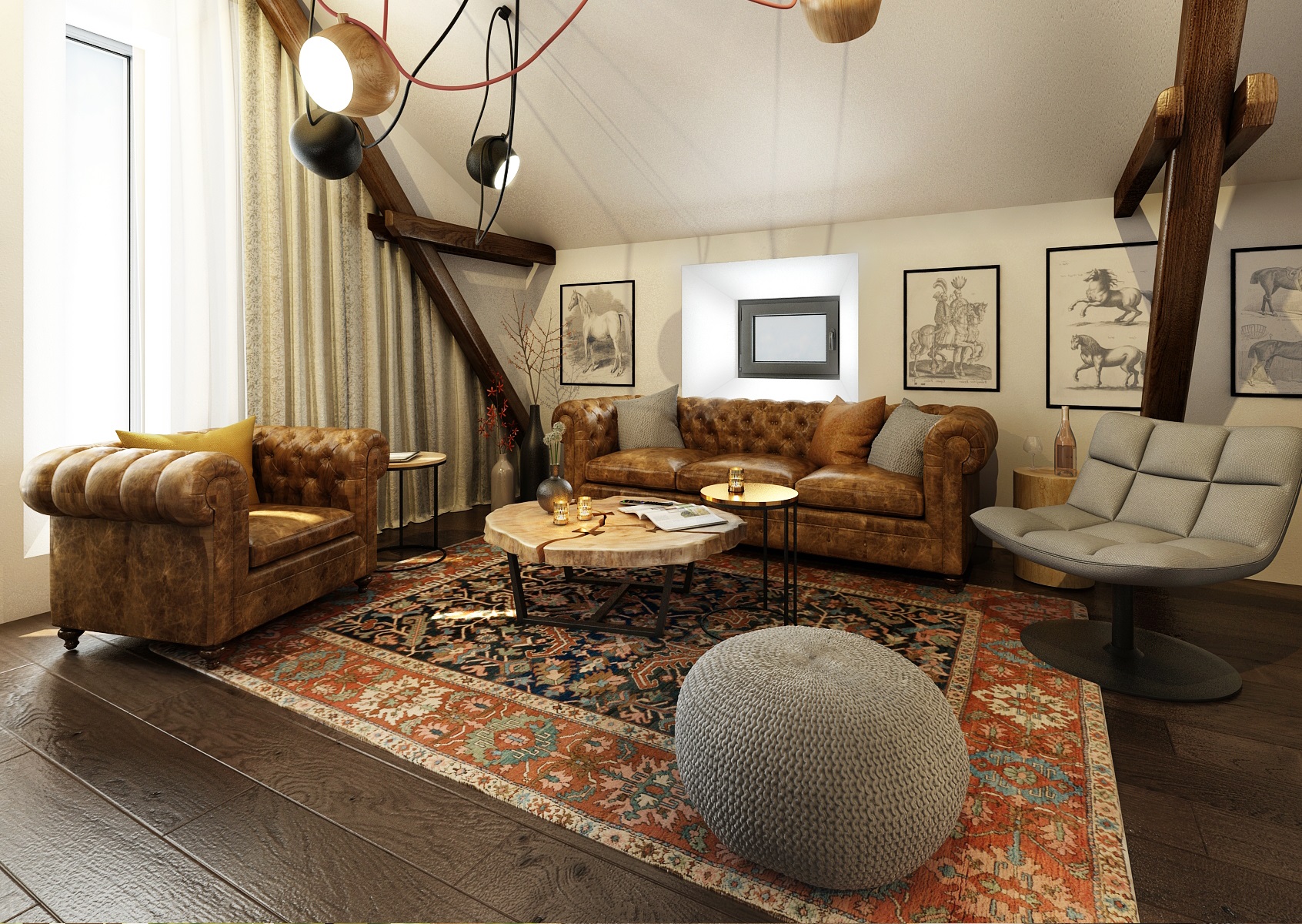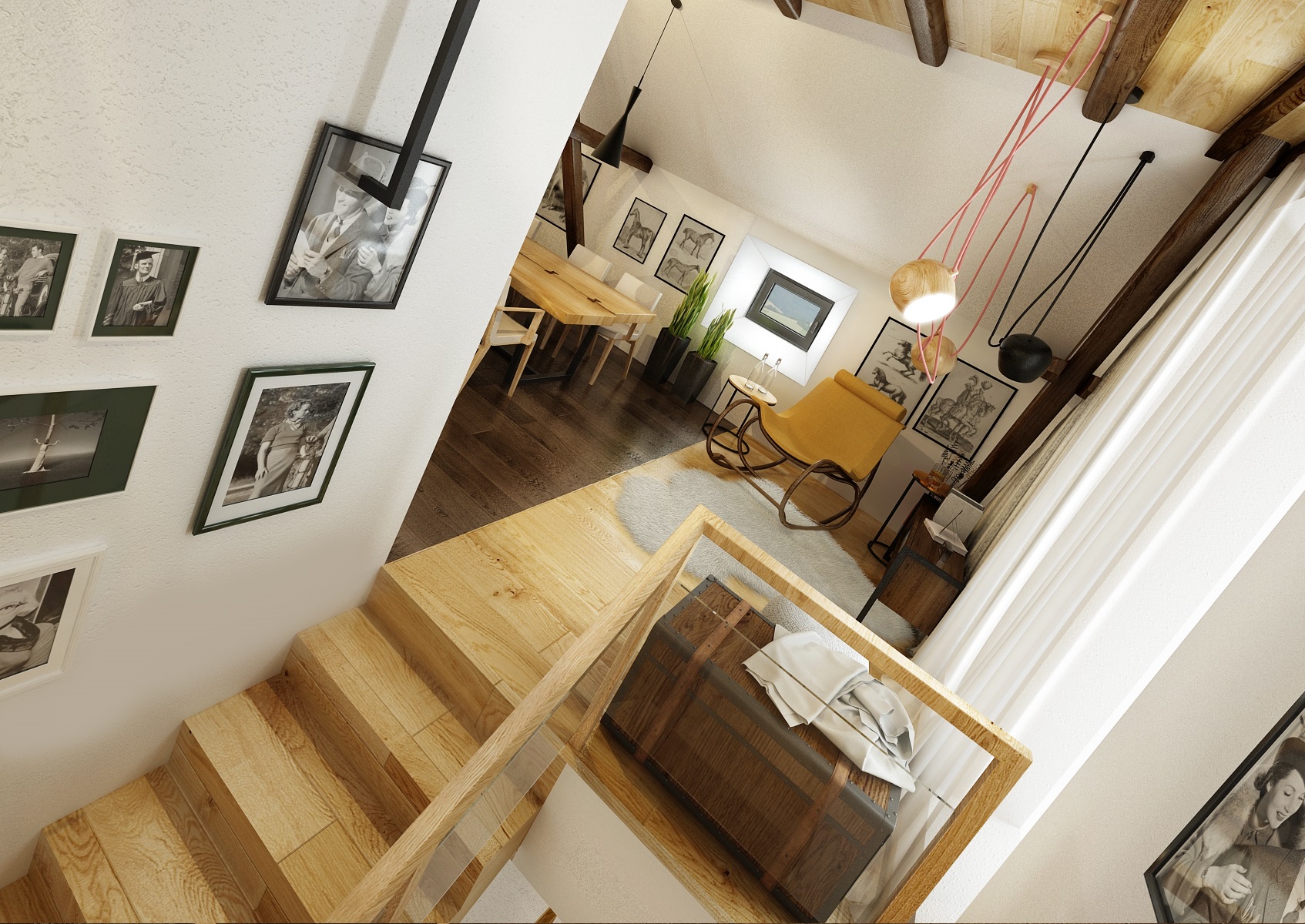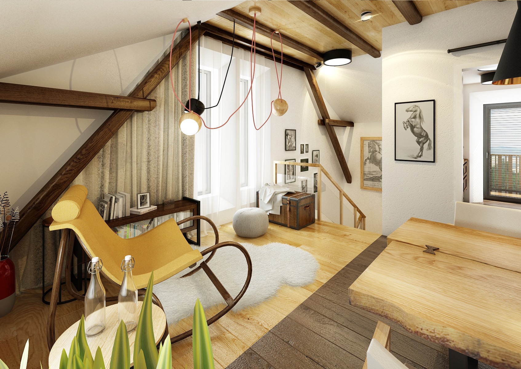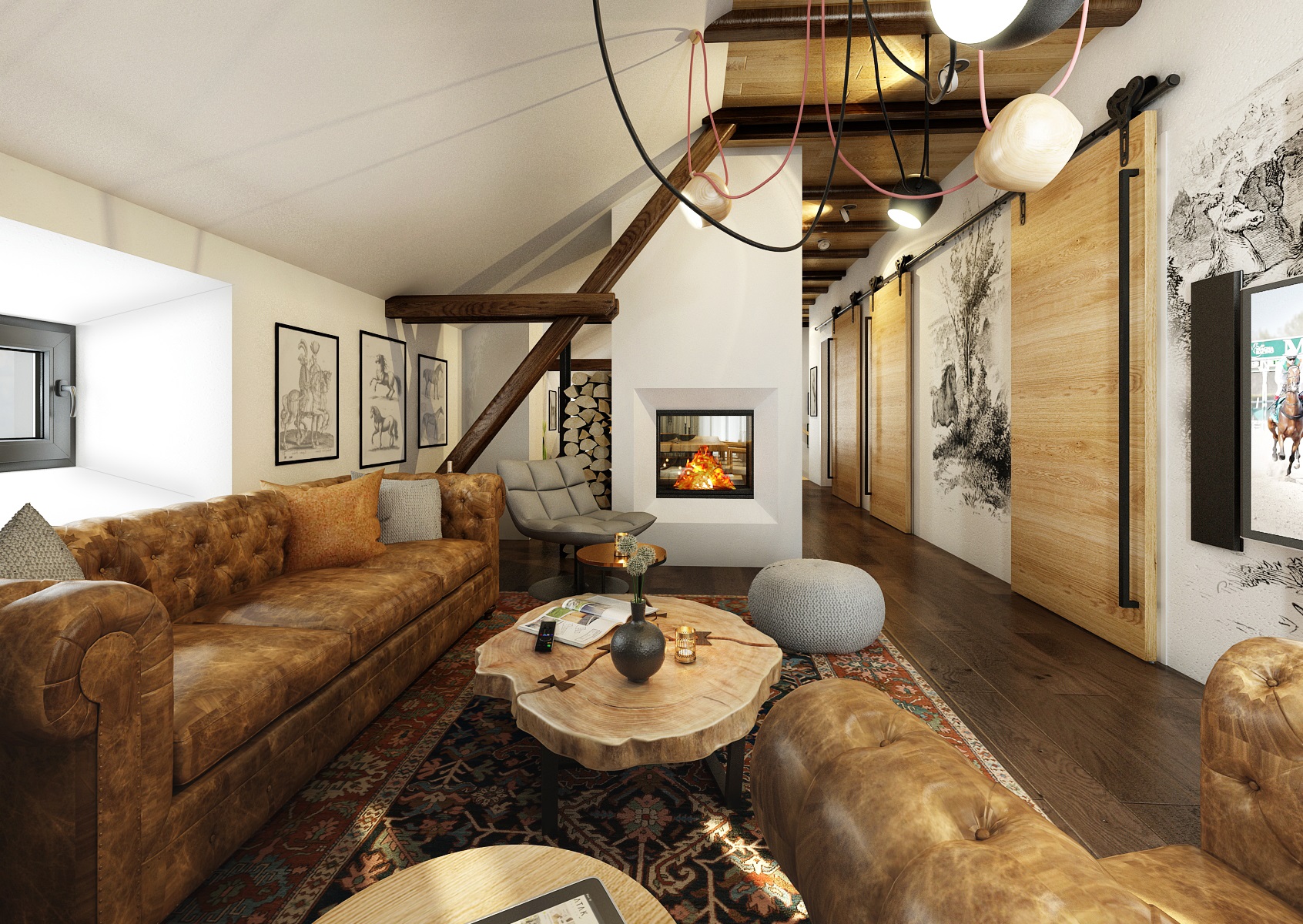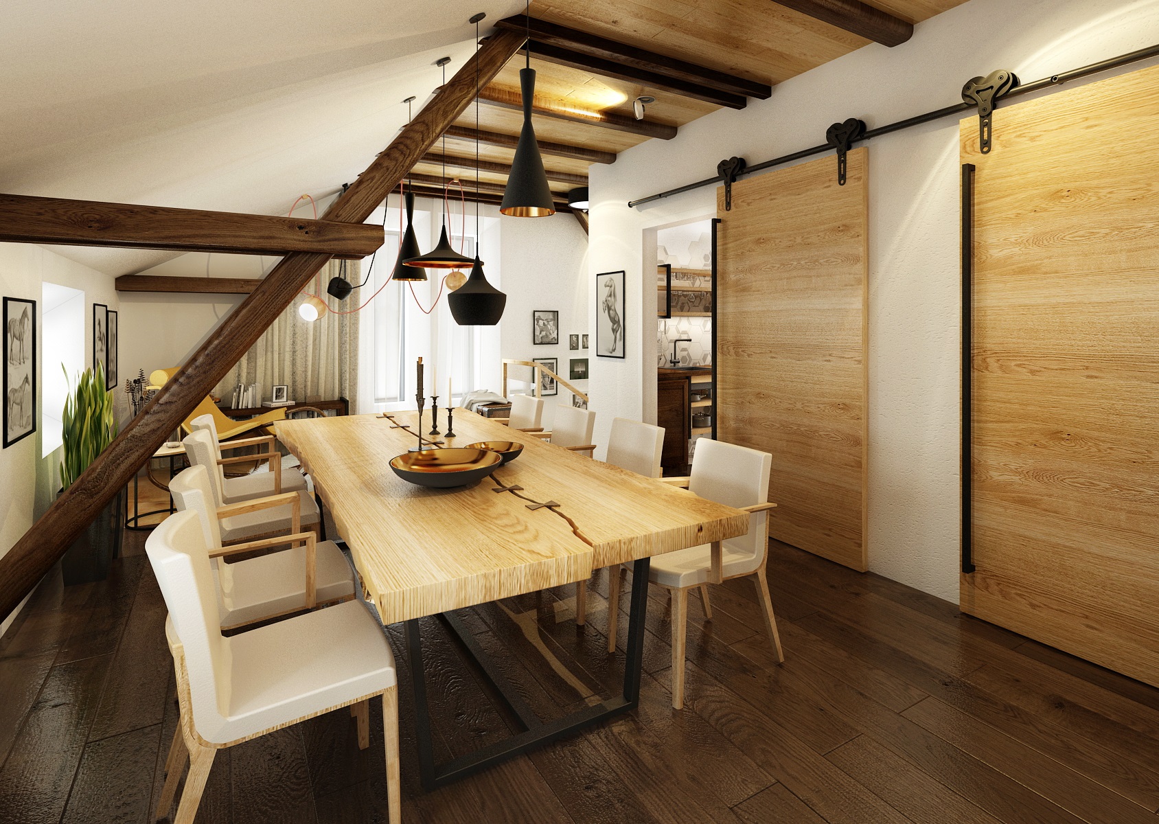 Návrh rekonstrukce půdního prostoru bývalého hospodářského stavení na privátní bydlení. V zadání znělo vytvořit moderní byt s venkovskou tématikou. Hlavní roli hraje masiv, dub, s přírodním a s tmavým mořením, vhodně doplněný černým jeklem. Interiérové posuvné dveře jsou zavěšeny na pojezdovém kování, jako mívají vrata do stodoly. Zůstal přiznaný dřevěný krov a nechybí ani krbová kamna, retro obklady použité v kuchyní a koupelně, stylový nábytek a dekorace, jako jsou například tapeta a kresby s motivem koní.
