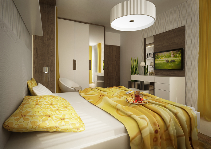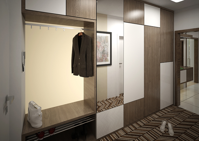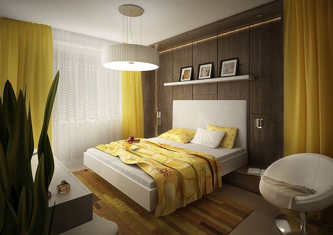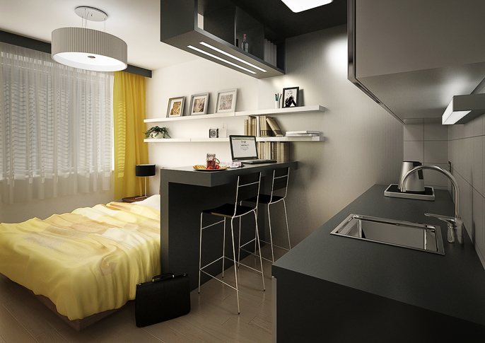 Ústředním materiálem užitým v celém bytě je dřevěná dýha v kombinaci s doplňky a obklady v živých barvách a v bílém lesklém laminu. Druhou částí návrhu je garsonka řešená v černém laminu, jež kontrastuje s žlutými doplňky a vzorovanou tapetou.