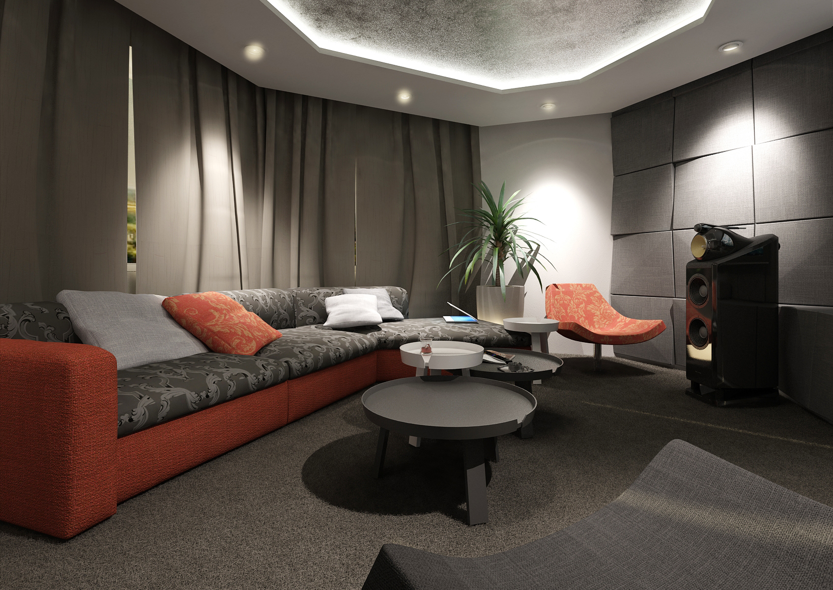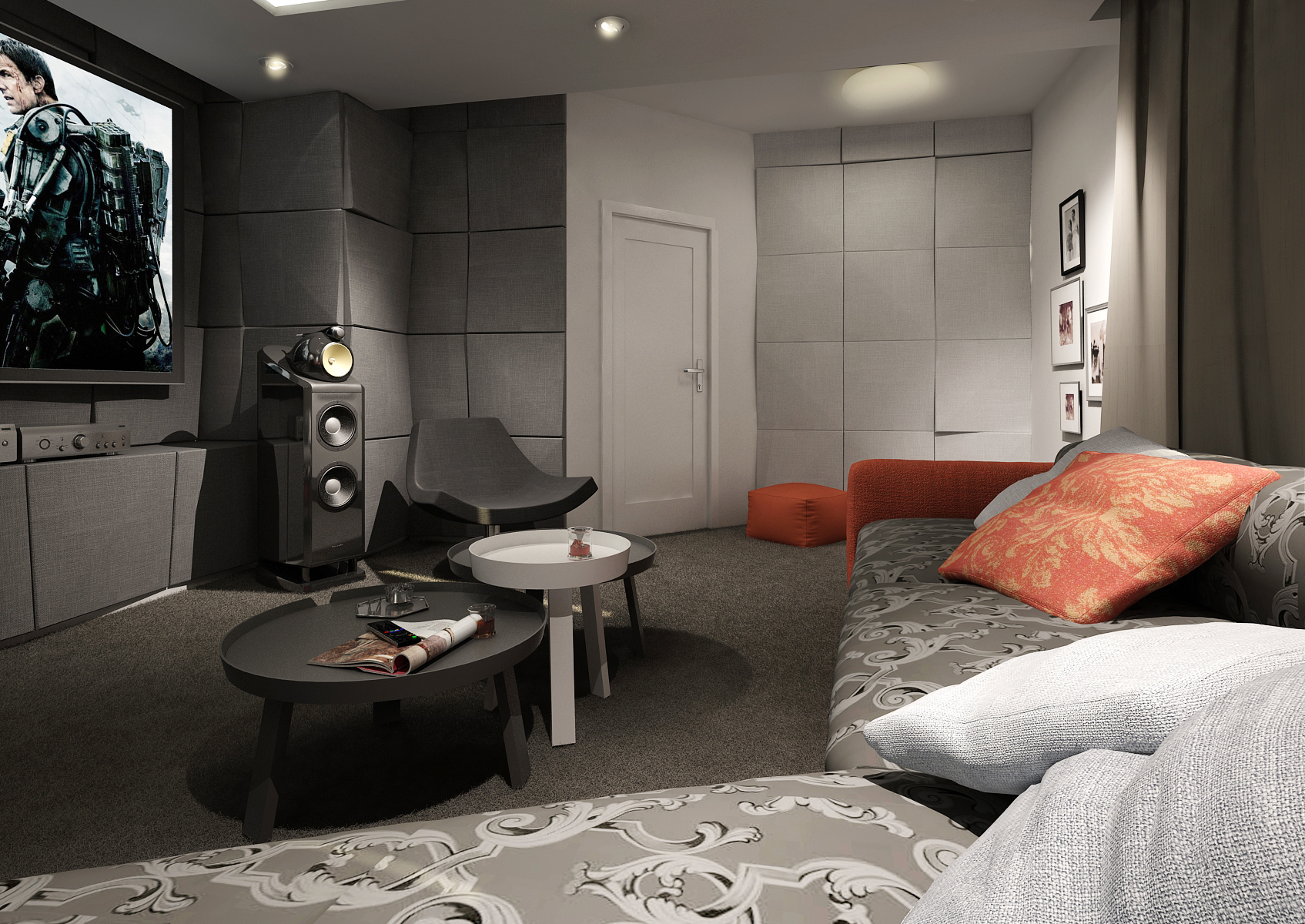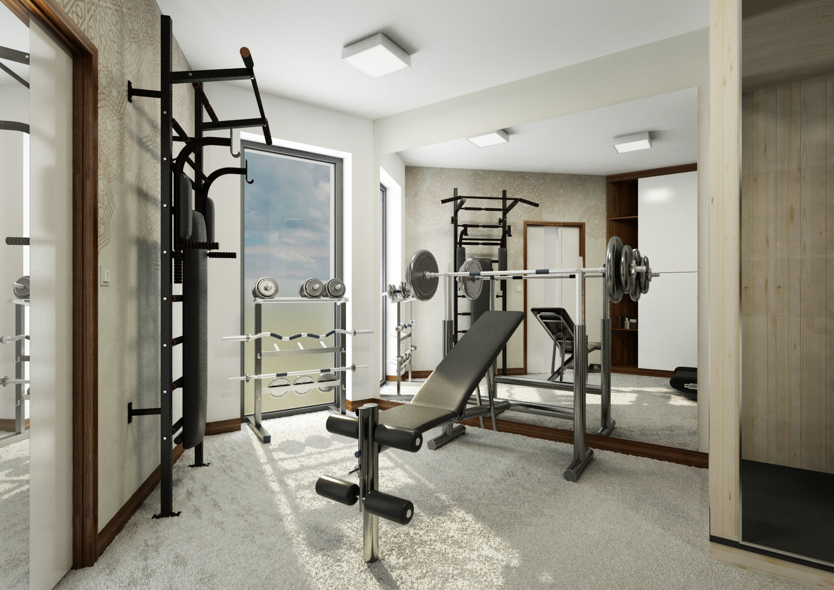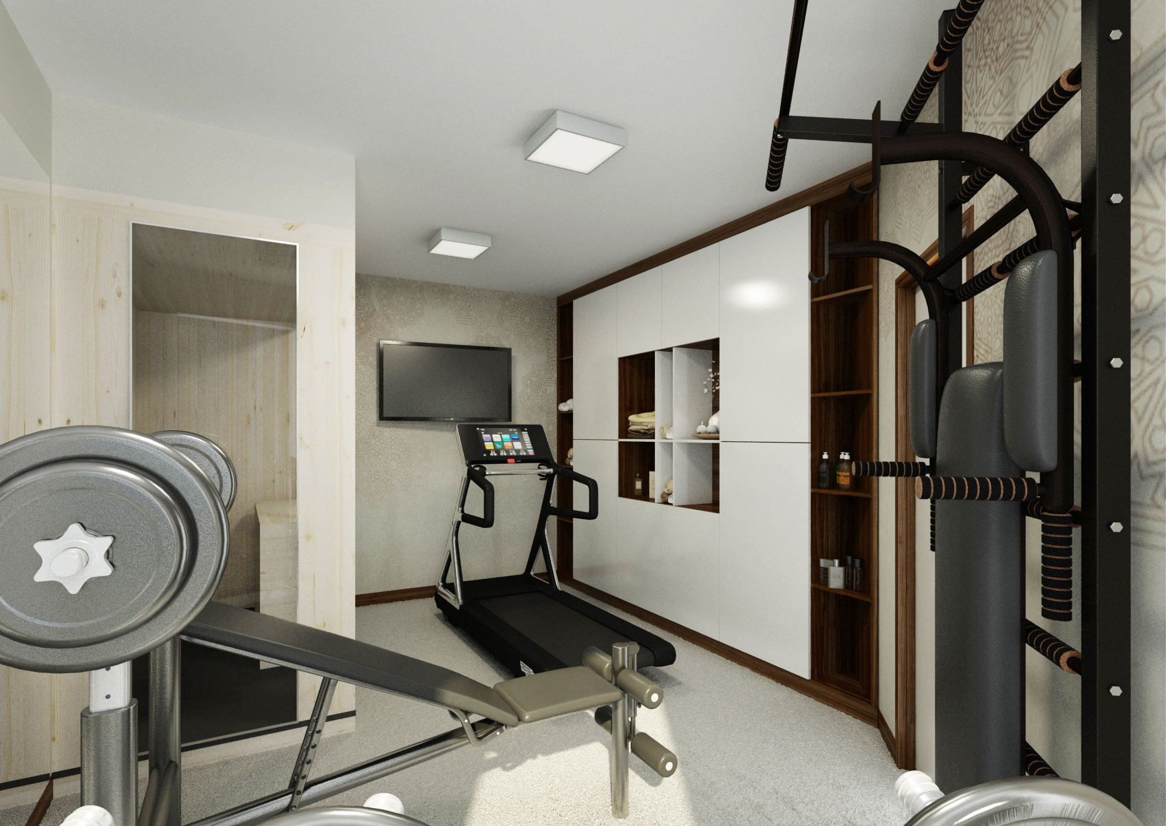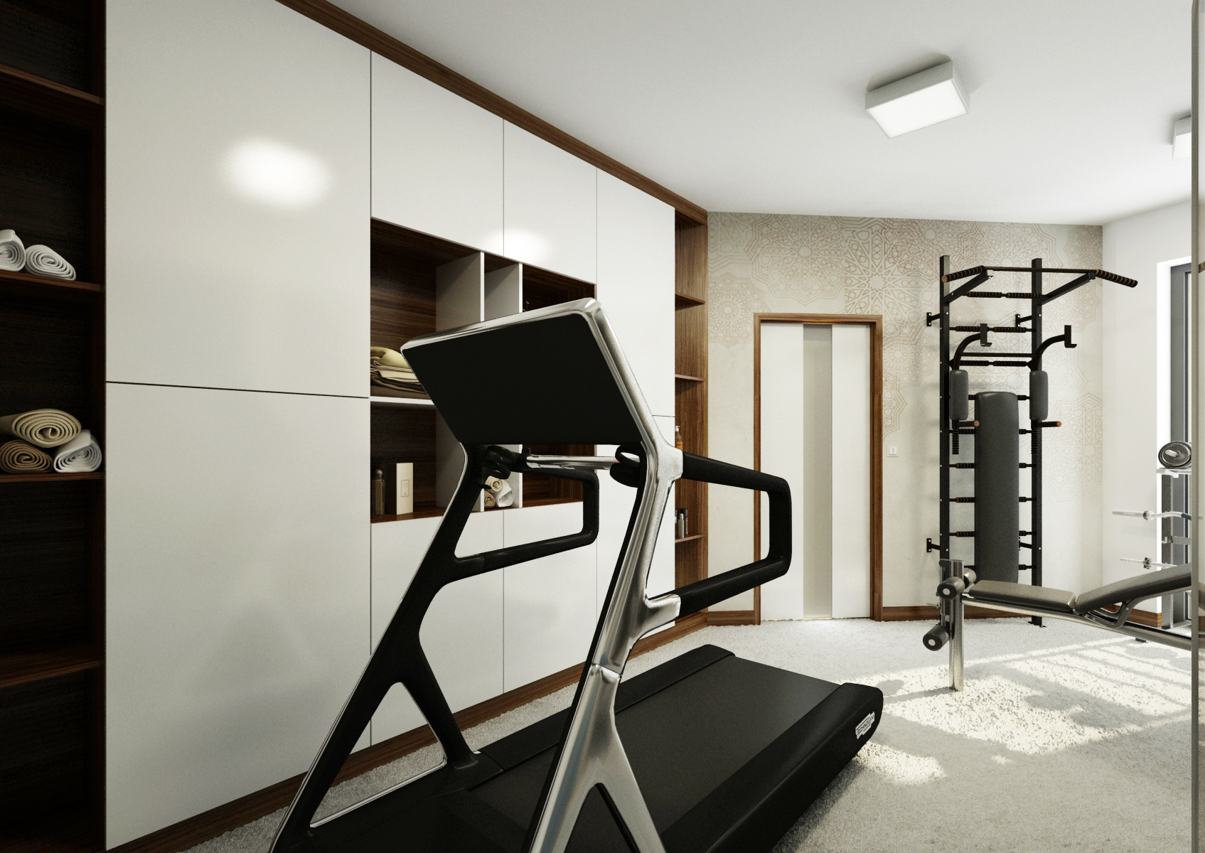 Součástí domu mohou být i místnosti, které slouží jako domácí kino a posilovna. V tomto případě jsme do návrhu použili jako základ obří TV s kvalitním audio systémem, akustické panely, tmavé odstíny koberce, sedačky a závěsů, aby nevznikaly rušivé barevné akcenty. Ve fitku najdeme vestavnou skříň, posilovací lavici a bežecký pás nasměrovaný na TV, aby to při běhu lépe utíkalo...