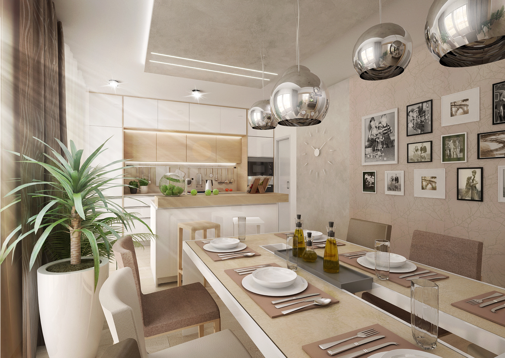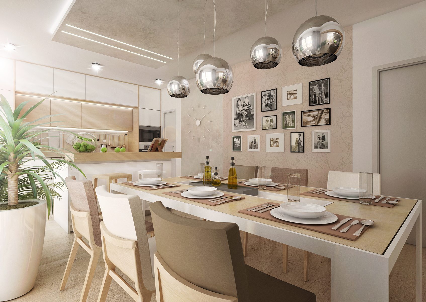 V návrhu interiéru se prolínají světlé odstíny s nugátově hnědou. Kuchyňská linka je vyrobena v kombinaci hedvábně bílé a dekoru přírodního dubu. Materiál a barvy se opakují i na dalším zařízení v celém domě. Sjednocená je i výmalba, vliesové tapety s rostlinným vzorem v jemné meruňkovém tónu dekorují jídelnu i ložnici, jsou nakombinovány s metalickou šedou nástěnnou stěrkou.
