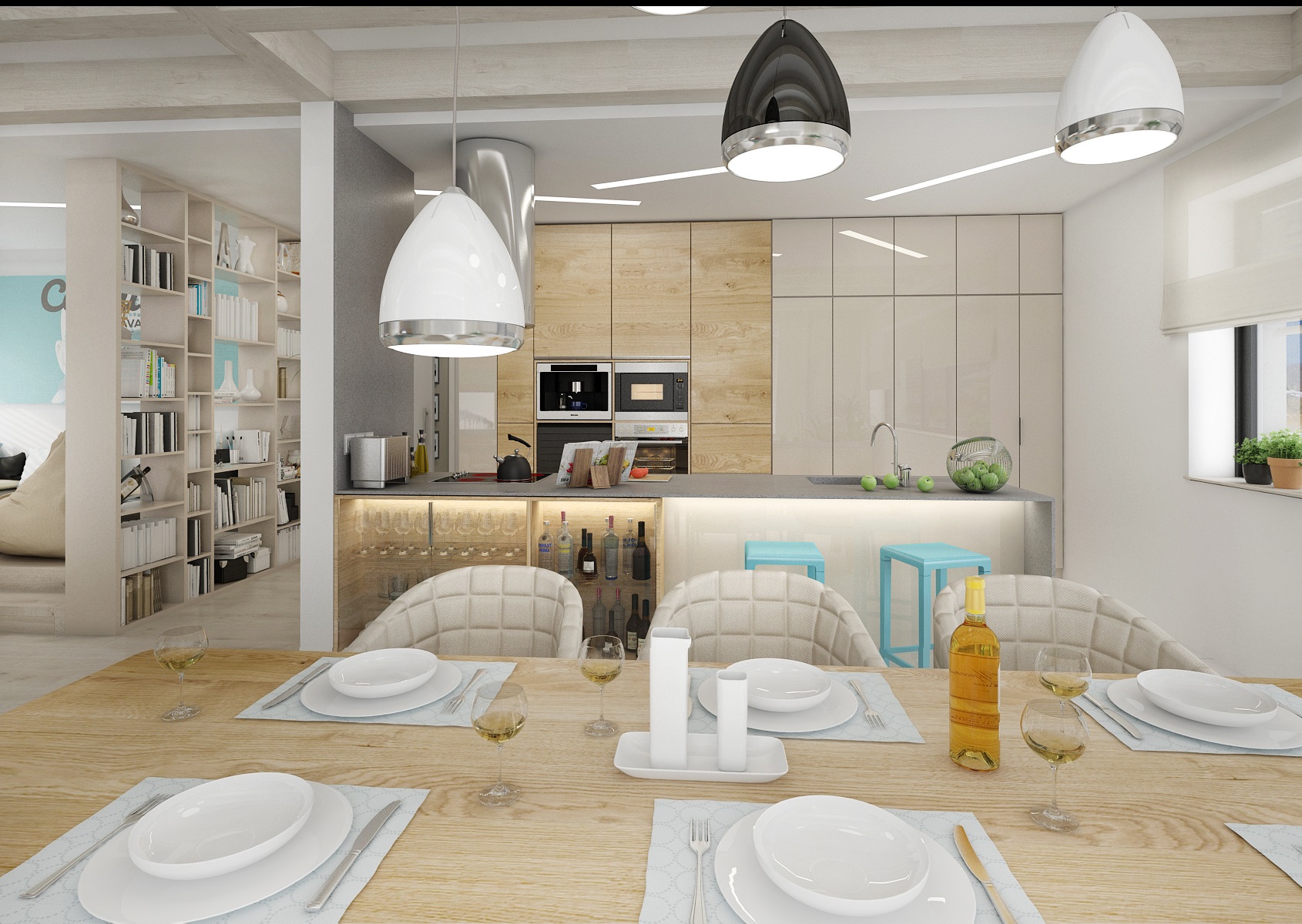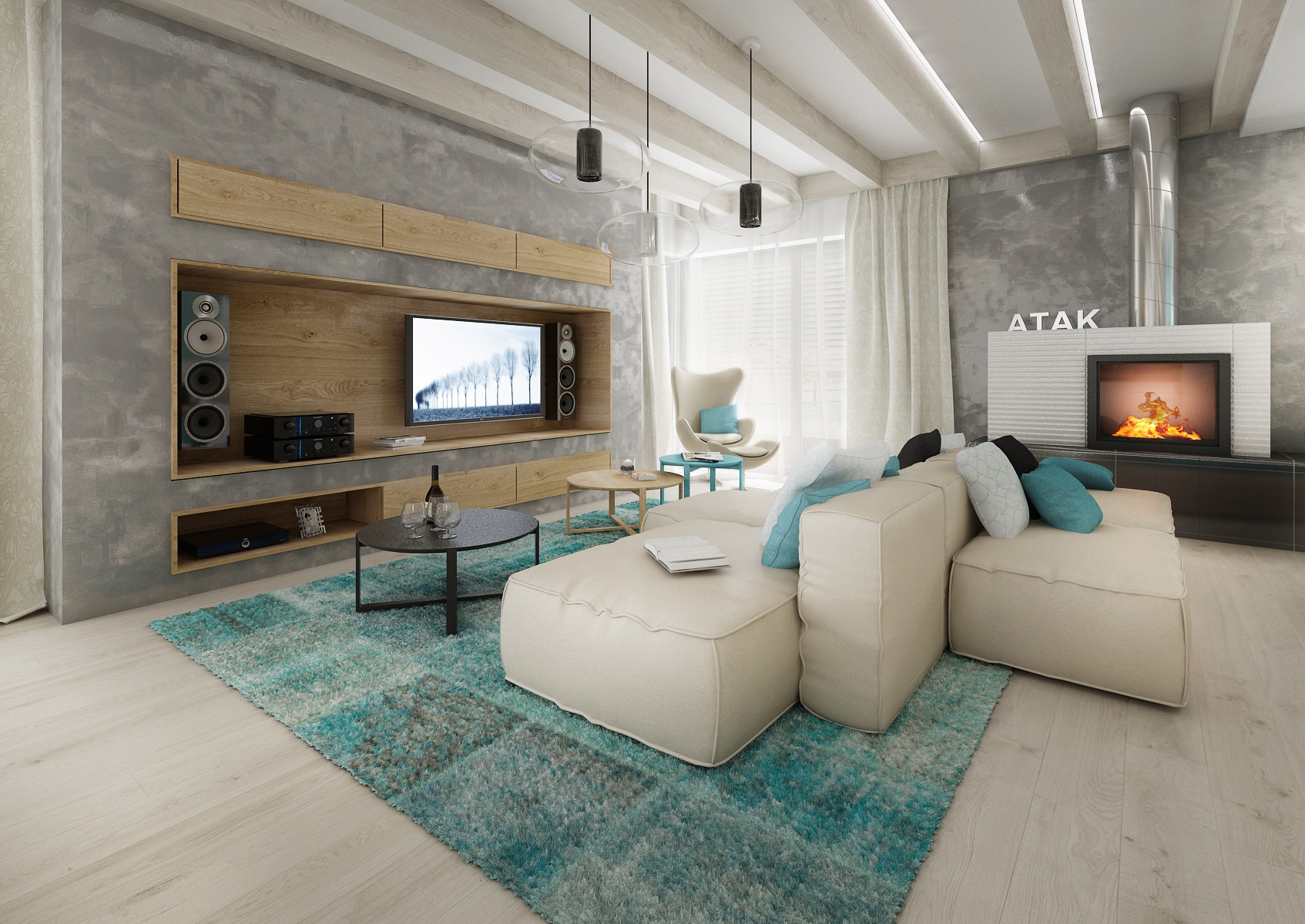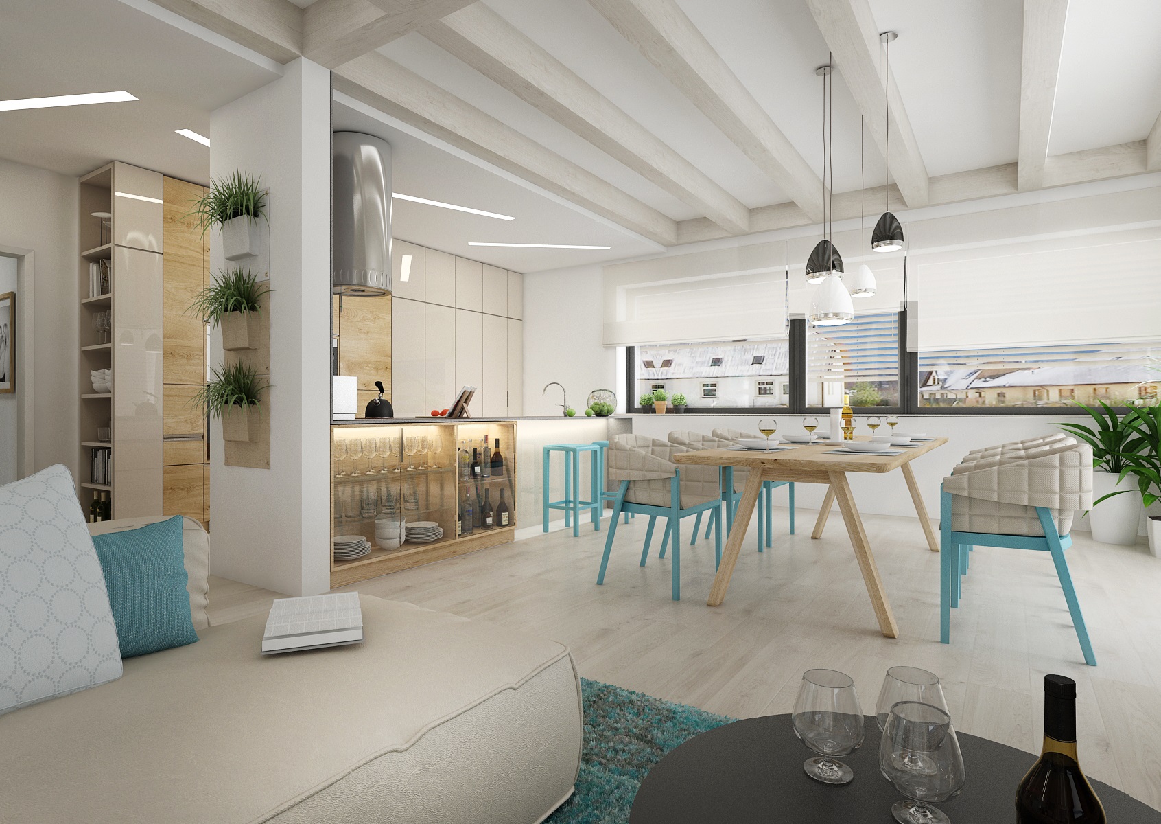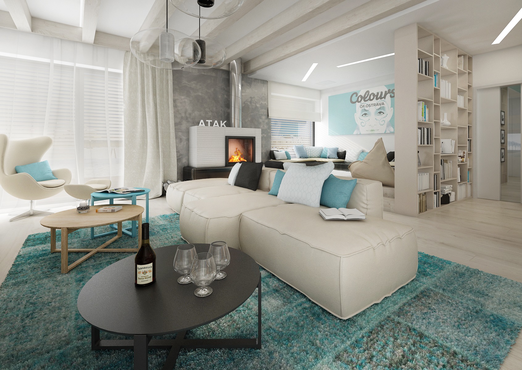 Dřevostavba s moderním designem, kde se použila šedá stěrka, podlaha z běleného dubu, dřevodekor přírodního dubu, vanilková a champagne lakovaná barva na nábytku. Barevný akcent dotvářejí tyrkysové nebo žluté doplňky. Jednoduchý design interiéru je díky těmto barvám zpestřen a zároveň působí jemně a čistě.