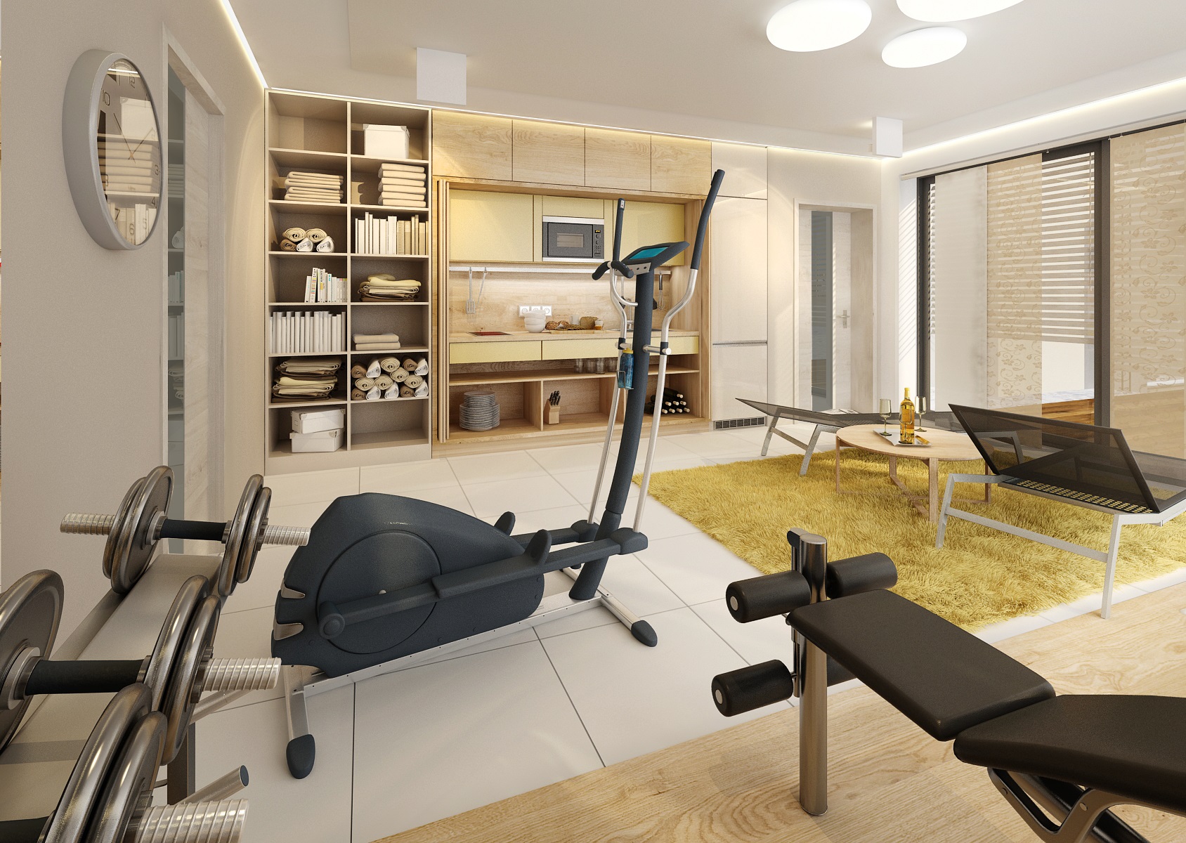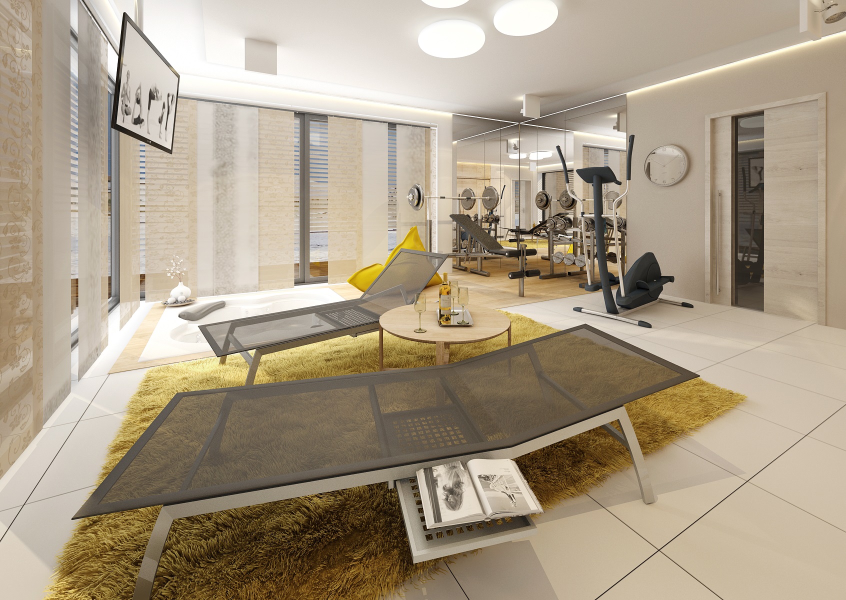 Moderní interiér dřevostavby s fitkem s tyrkysovou a žlutou