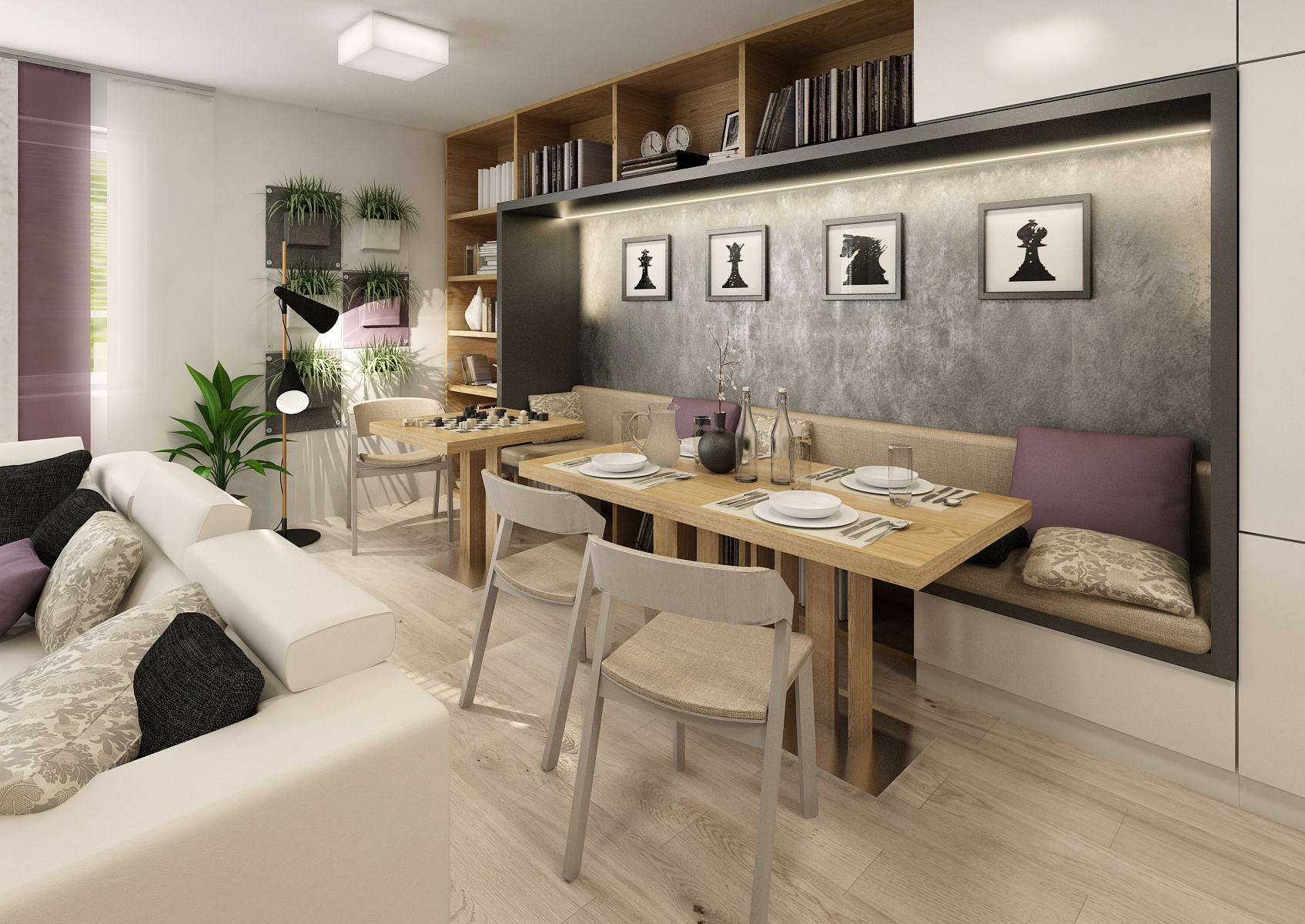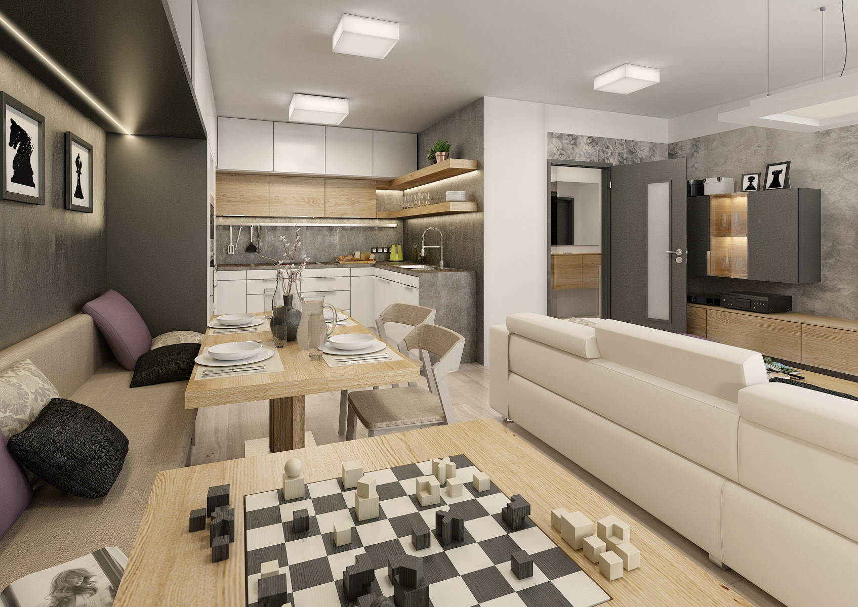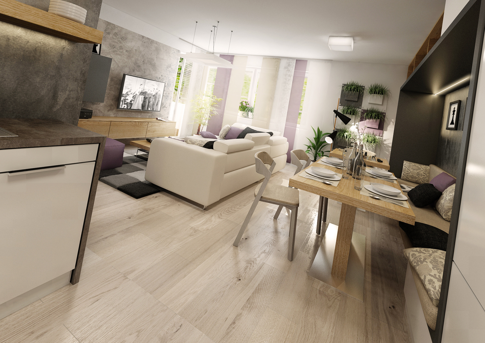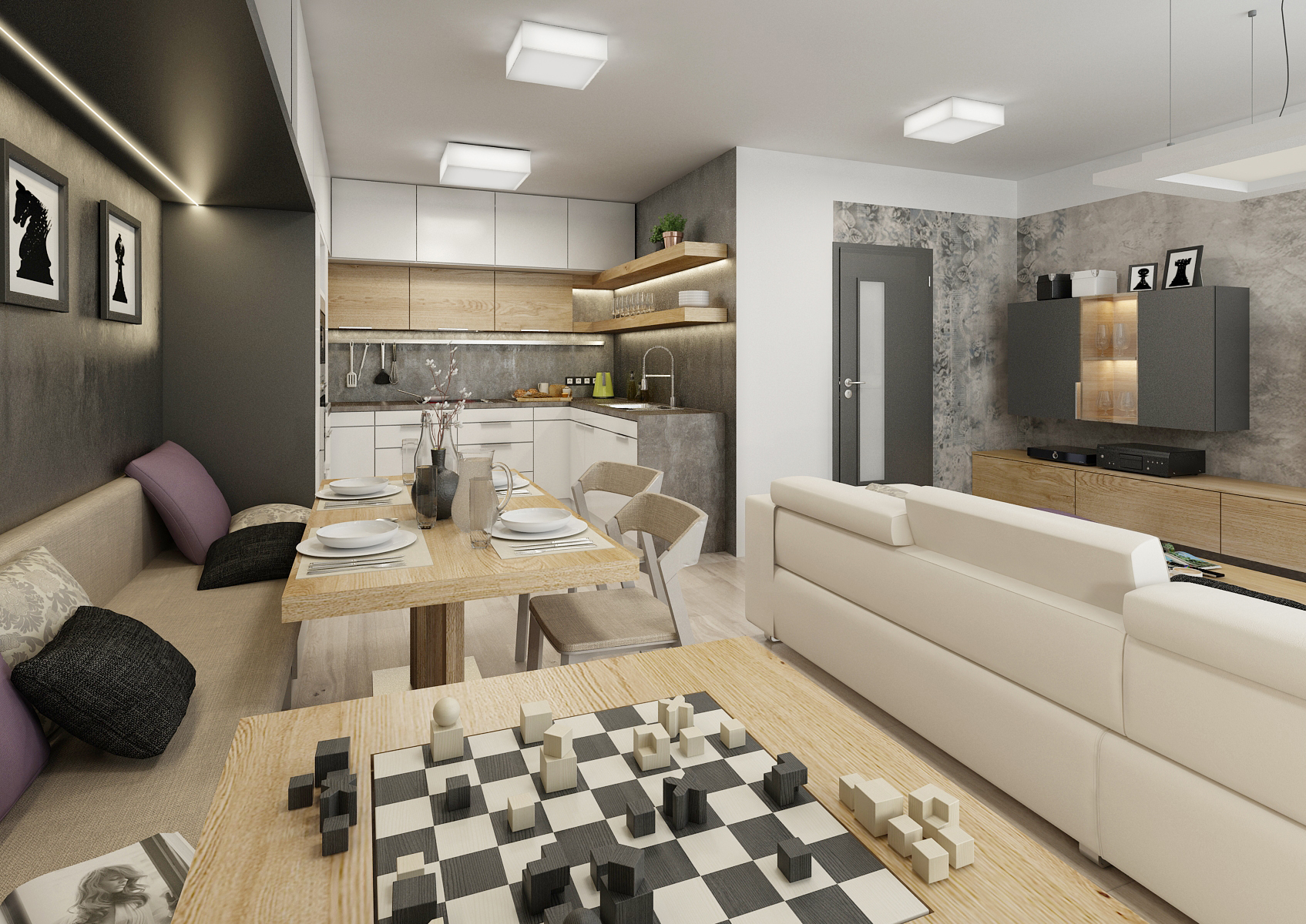 jako startovní bydlení pro novomanžele. Kuchyně je v kombinaci bílého lesku, přírodního dubu a betonové stěrky, která se opakuje na stěnách v celém bytě. Kuchyně plynule navazuje na vestavnou čalouněnou lavici s jídelním stolem, který je ještě doplněn dvěma židlemi Merano od TONu. TV stěna je řešena jen horizontální závěsnou skříňkou na audio/video a menší vitrínou. Další vybavení tvoří sedací souprava Hébé od Polstrinu, stropní svítidla ATEH-Aquarium a závěsné ECO DESIGN-STZ.