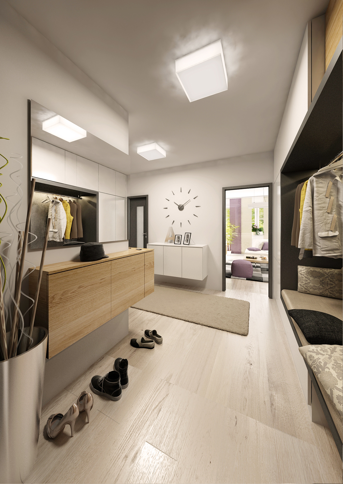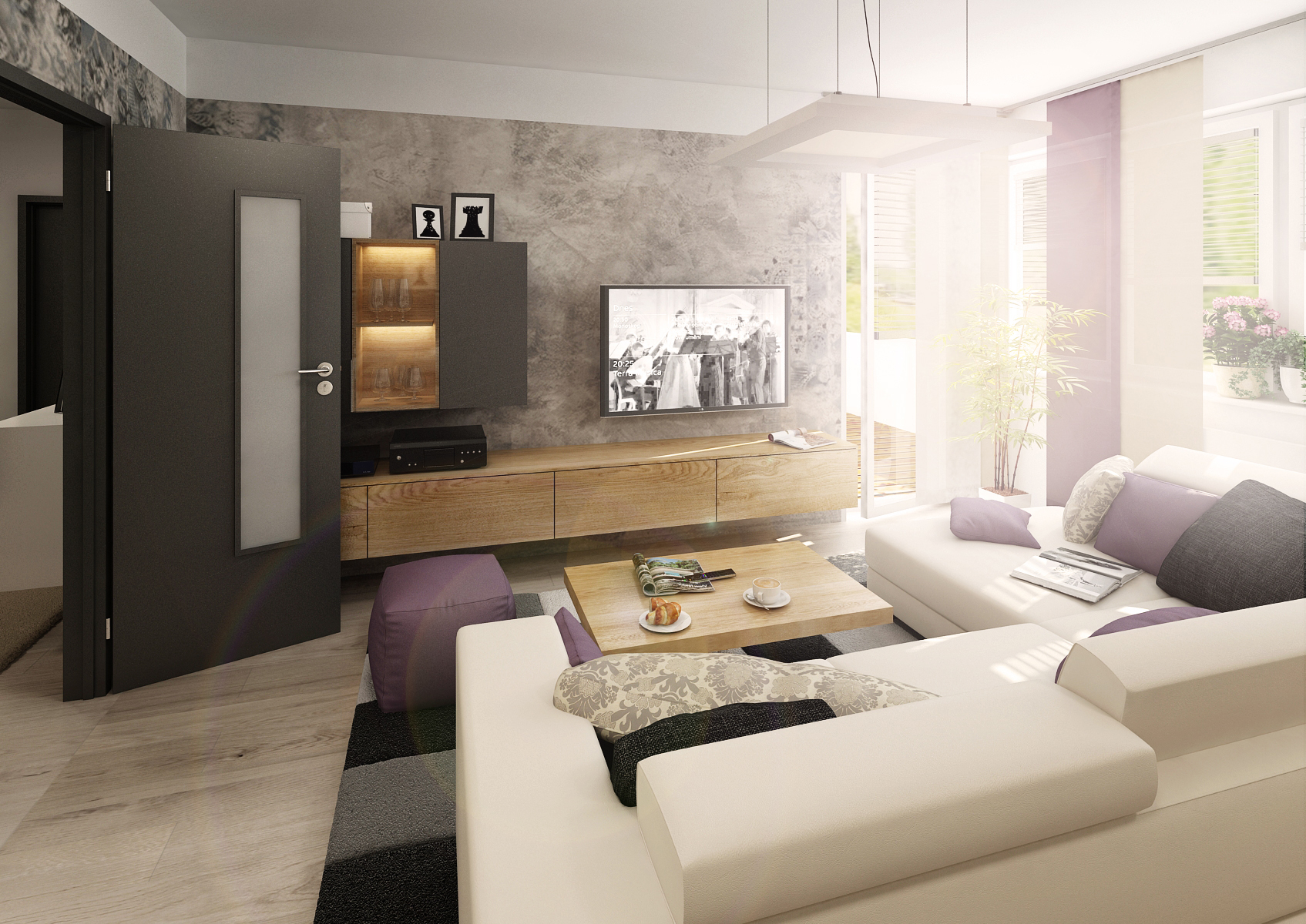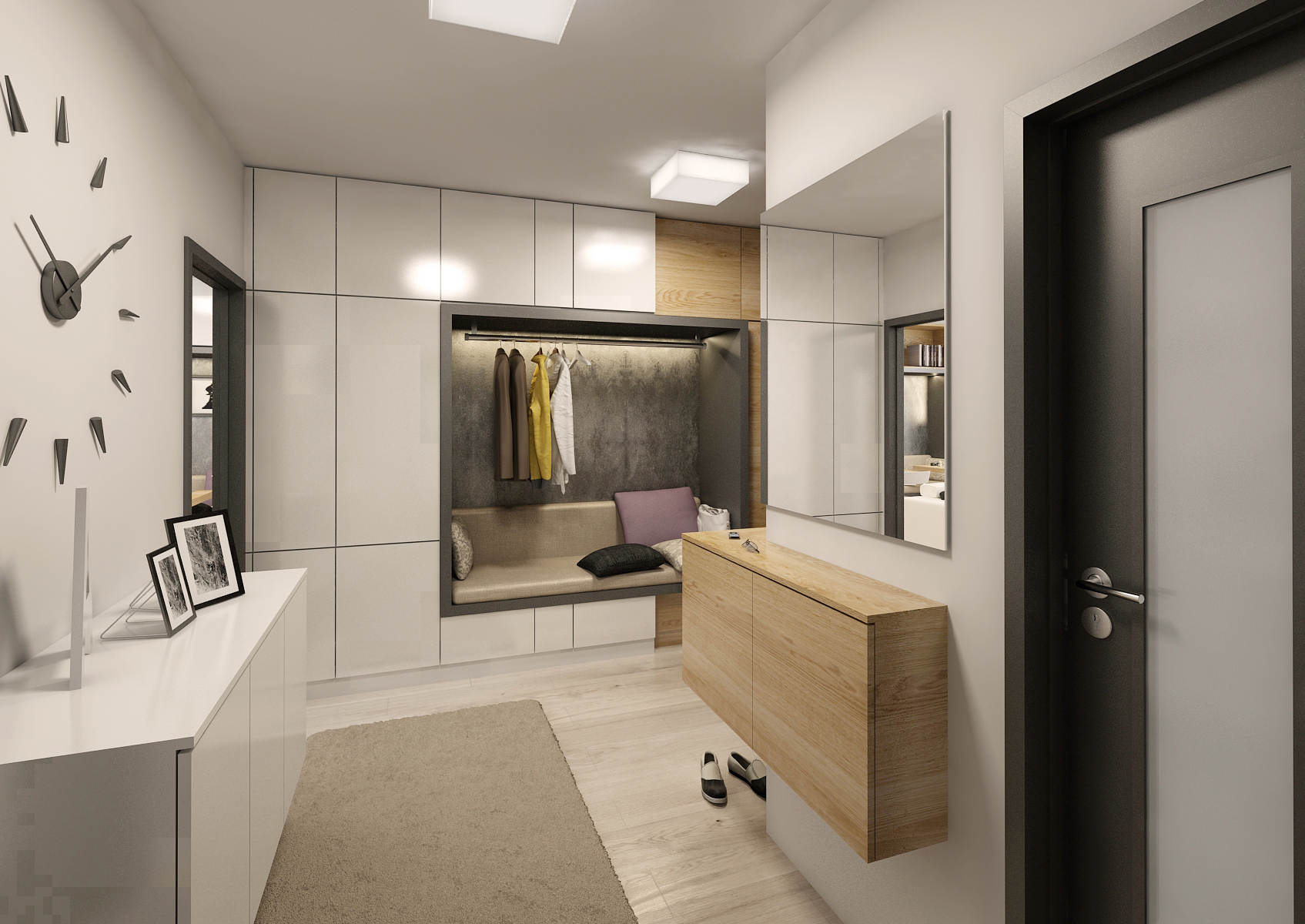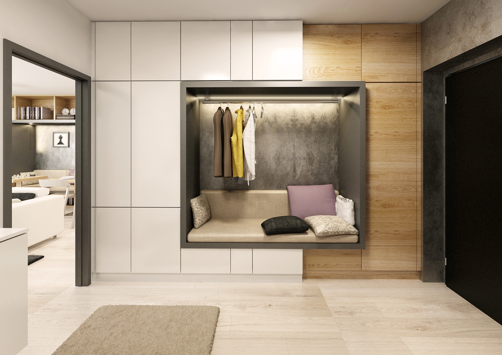 jako startovní bydlení pro novomanžele. Kuchyně je v kombinaci bílého lesku, přírodního dubu a betonové stěrky, která se opakuje na stěnách v celém bytě. Kuchyně plynule navazuje na vestavnou čalouněnou lavici s jídelním stolem, který je ještě doplněn dvěma židlemi Merano od TONu. TV stěna je řešena jen horizontální závěsnou skříňkou na audio/video a menší vitrínou. Další vybavení tvoří sedací souprava Hébé od Polstrinu, stropní svítidla ATEH-Aquarium a závěsné ECO DESIGN-STZ.
