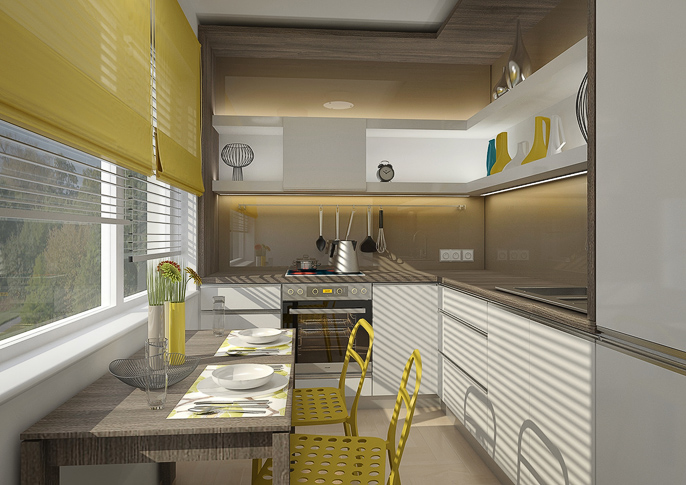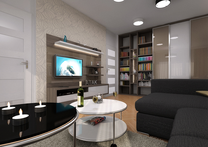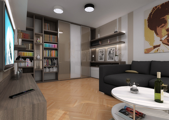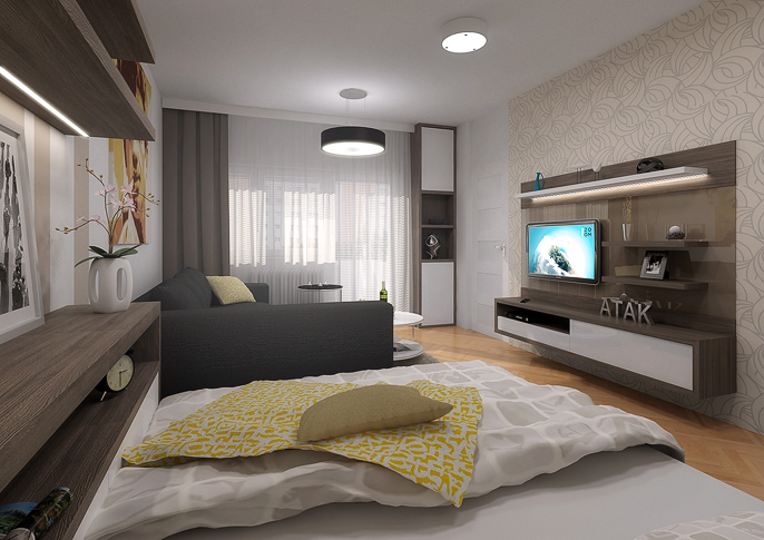 Návrh interiéru garsonky, kde je místo ke spánku řešeno vyklápěcí postelí schovanou za posuvnými dvěřmi, díky čemuž se nám podařilo ušetřit místo. Světlé barvy jsou zpestřeny žlutými doplňky a prvky v kontrastu s černou pohovkou. Prostor působí útulně a moderně.