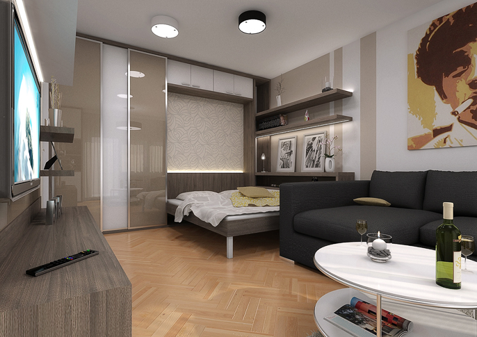 Interiér garsonky s vyklápěcí postelí České Budějovice