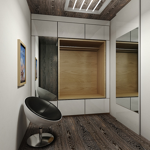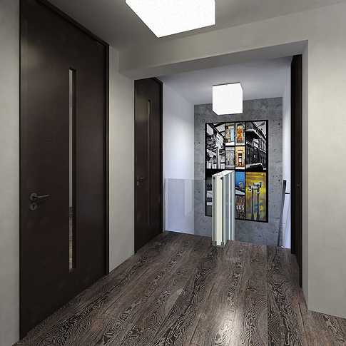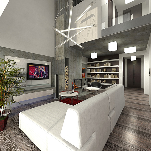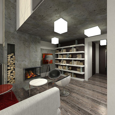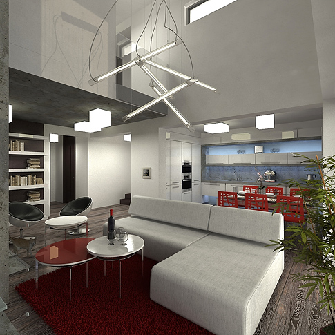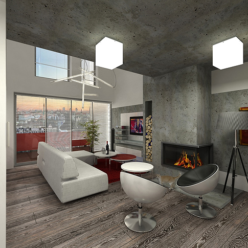 Interiér mezonetového bytu je řešený jako jednoduchý minimalistický prostor, který doplňují výrazně silné materiály jako je betonová stěrka, katrovaný a drásaný kouřový dub a transparentní sklo. Akcent pak tvoří červené interiérové doplňky.