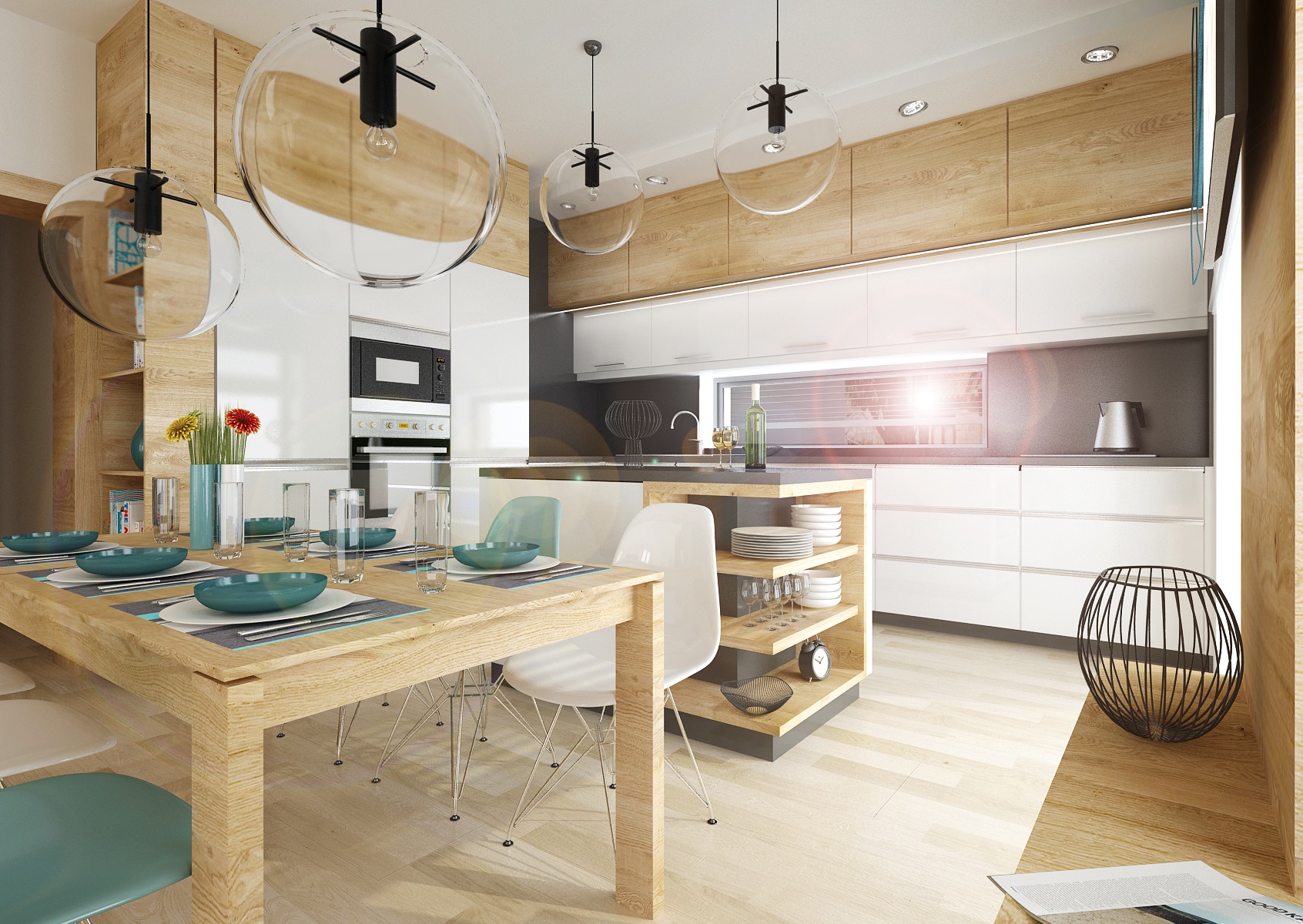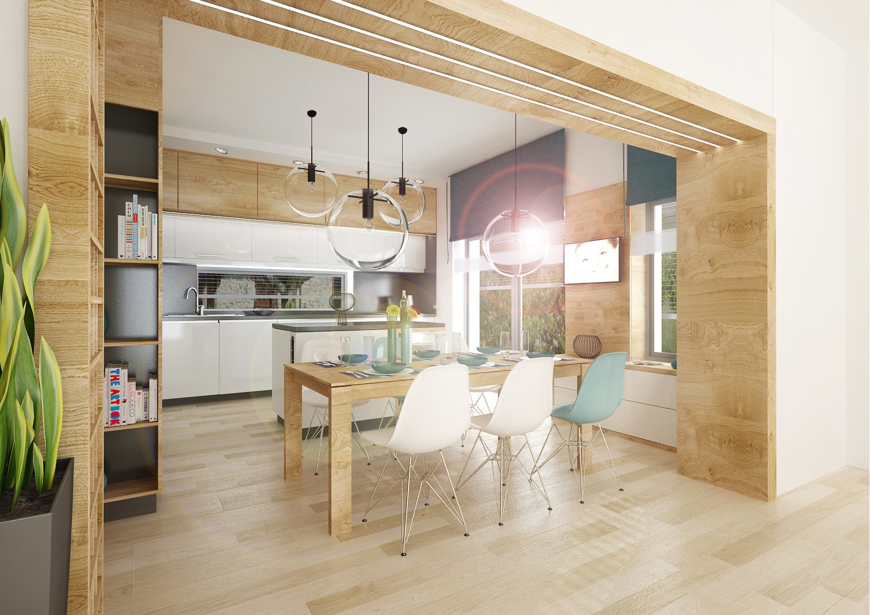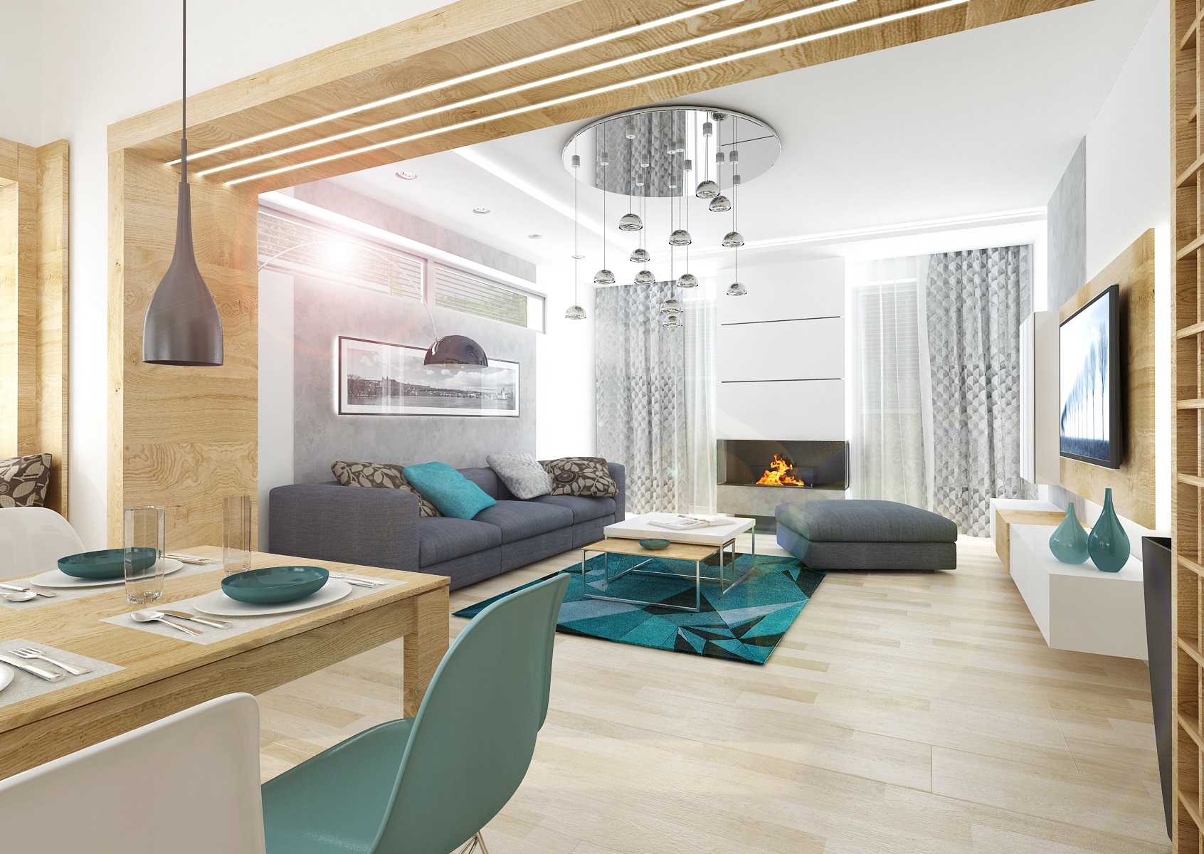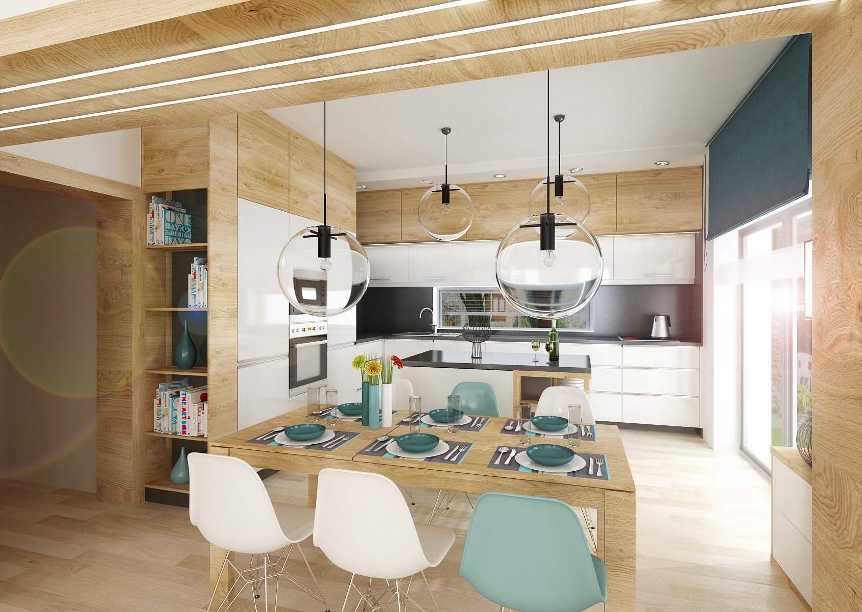 V návrhu obývacího pokoje s kuchyní je použita osvědčená kombinace přírodního dubu, bílého lesku a antracitu. Jako doplňková barva byla zvolena tyrkysová-koberec, keramika, látky, atd. Obložení průchodu z kuchyně do obývacího pokoje je využito také jako knihovna s osvětlením. Dominantou obývacího pokoje je křišťálový lustr Bubble.
