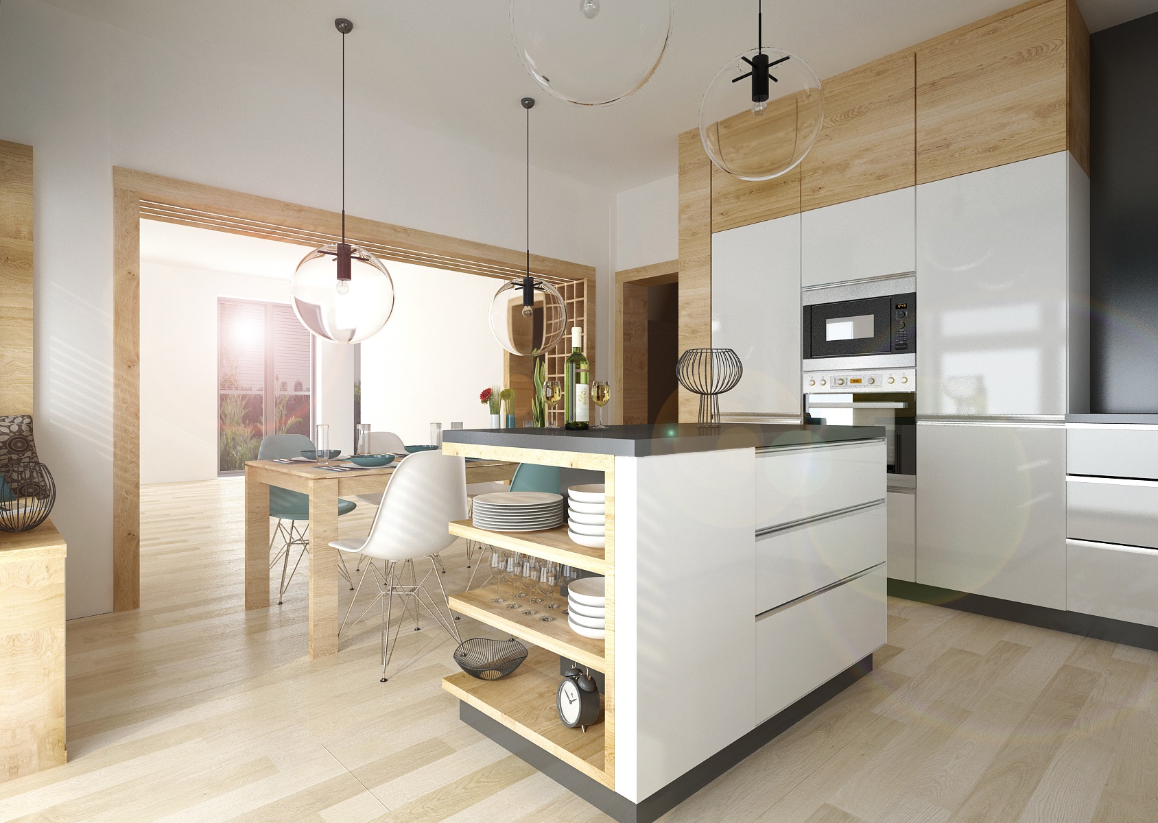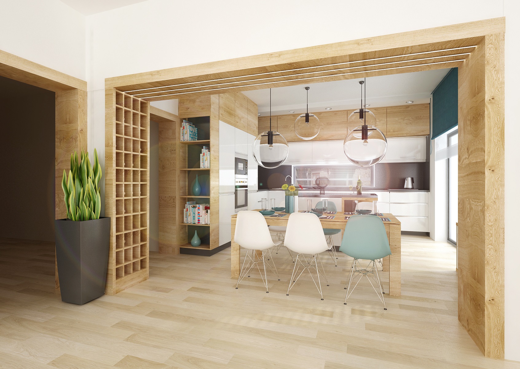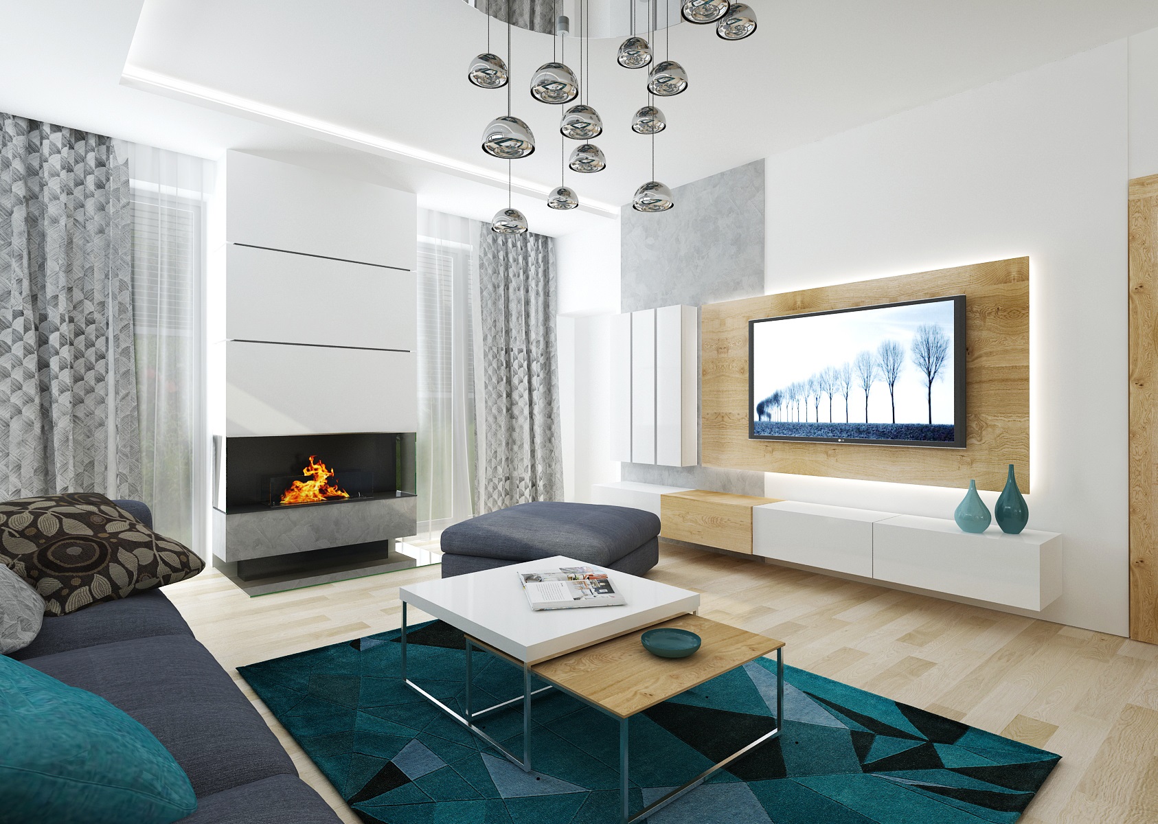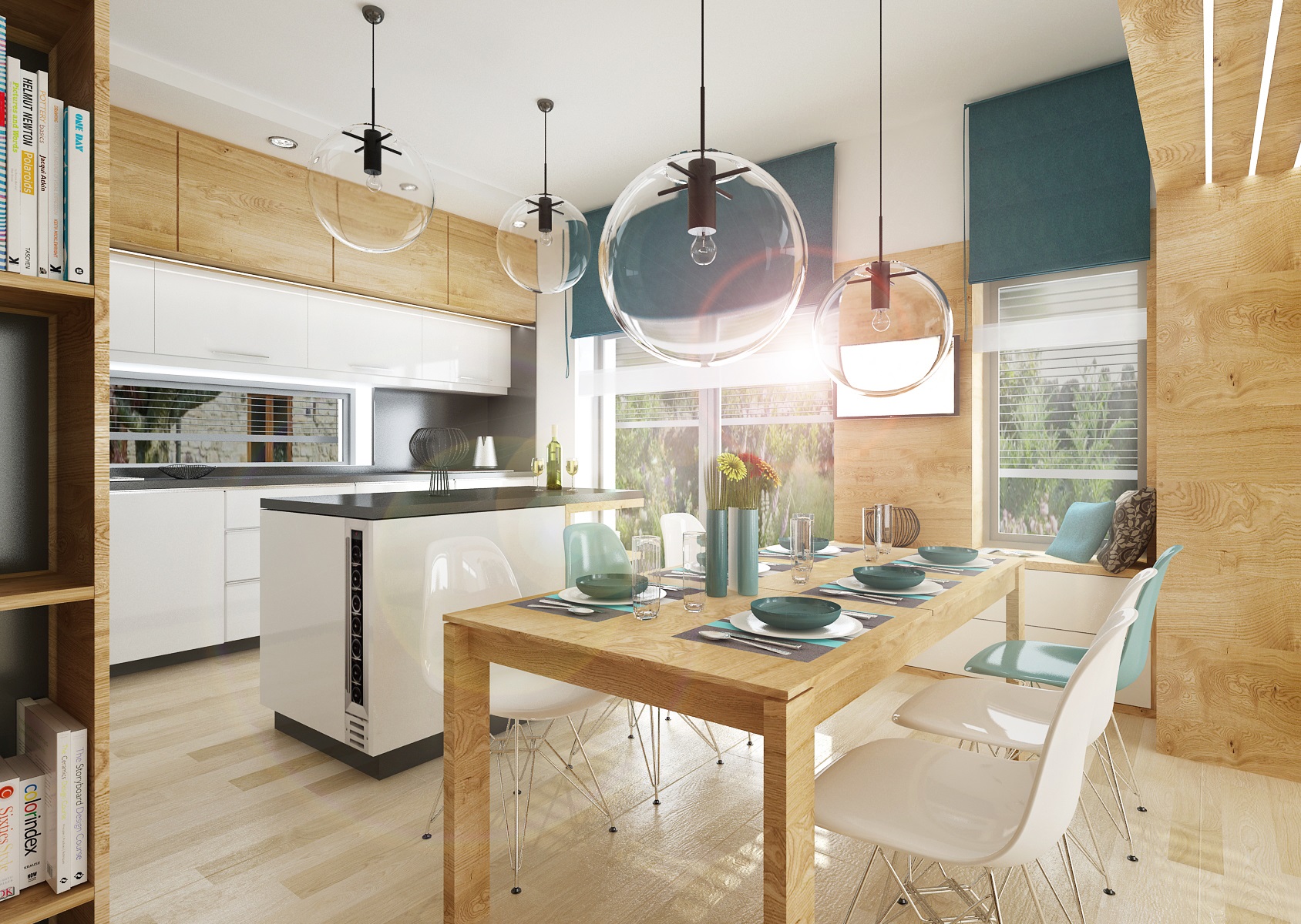 V návrhu obývacího pokoje s kuchyní je použita osvědčená kombinace přírodního dubu, bílého lesku a antracitu. Jako doplňková barva byla zvolena tyrkysová-koberec, keramika, látky, atd. Obložení průchodu z kuchyně do obývacího pokoje je využito také jako knihovna s osvětlením. Dominantou obývacího pokoje je křišťálový lustr Bubble.