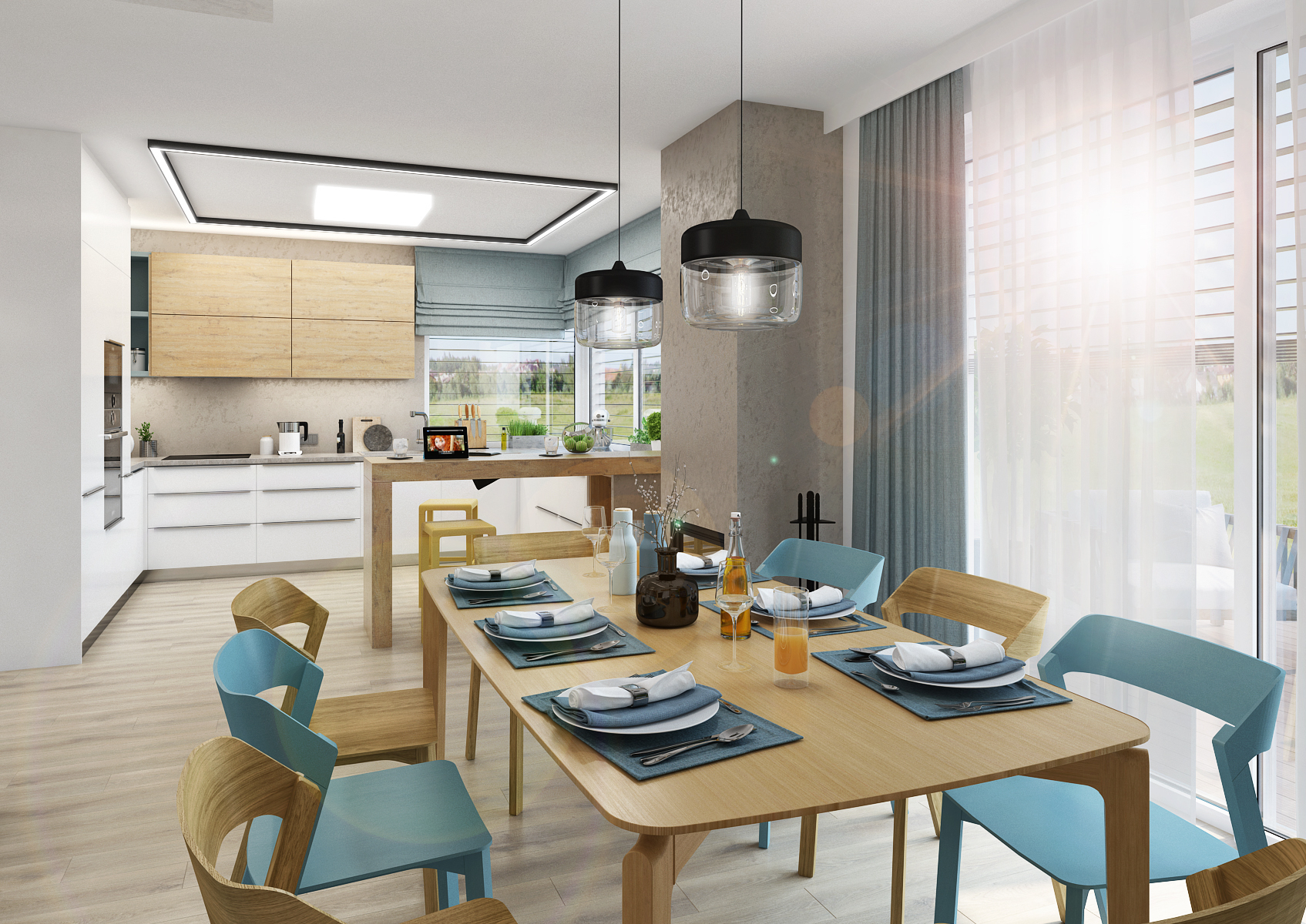Návrh interiéru přízemí domu se pyšní hojným využitím tyrkysové barvy zejména na doplňcích v kombinaci s dubovým dřevem.
