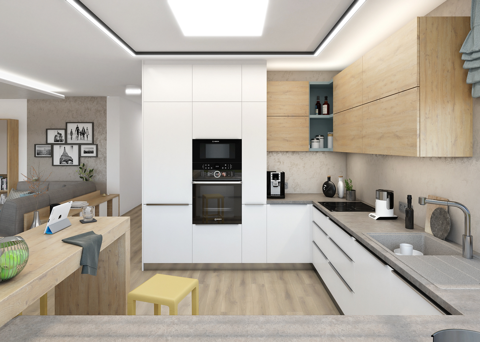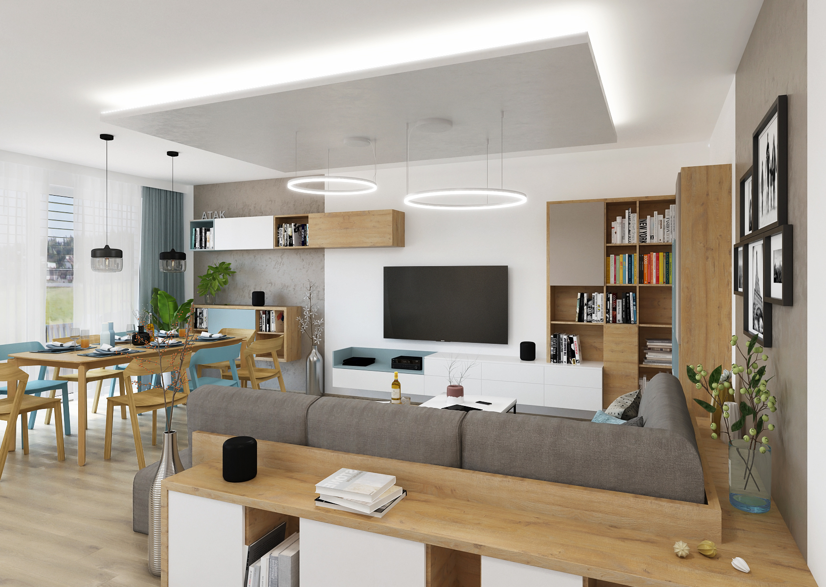 Tyrkysová barva se vyskytuje nejen na bytovém textilu, ale také na nábytkových prvcích, jako jsou jídelní židle, kde se střídá právě dubové dřevo se zmíněnou barvou či na bezúchytových dvířkách skříňové stěny v obývacím pokoji. Zajímavým prvkem je zde také stropní podhled, kde je využit LED pásek jako ambientní osvětlení navouzující příjemnou atmosféru.