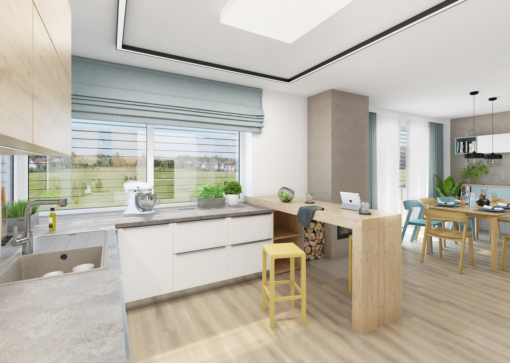 Kamenná kuchyňská deska s granitovým dřezem navazuje na dubový barový pult, za kterým se skrývají zabudovaná krbová kamna se zásobníkem na dříví. Prostor je osvětlen rámovým stropním osvětlením.