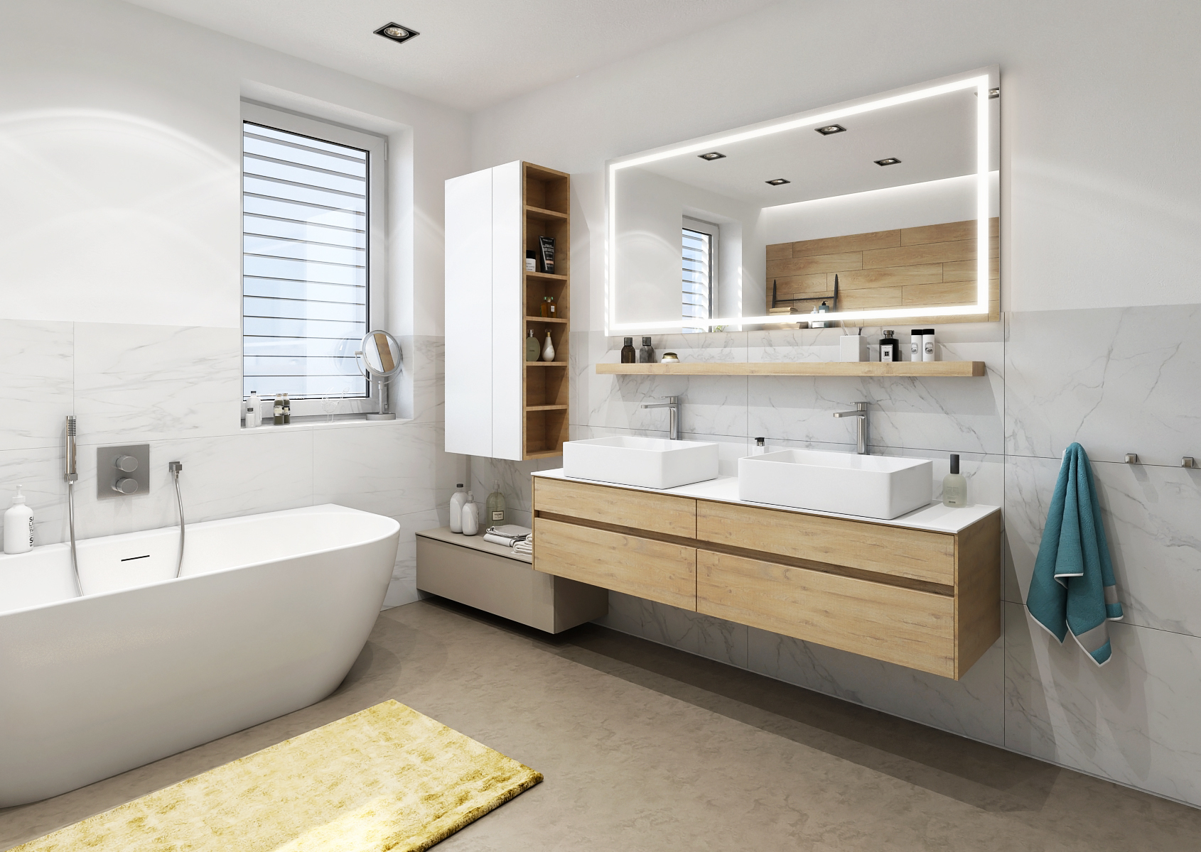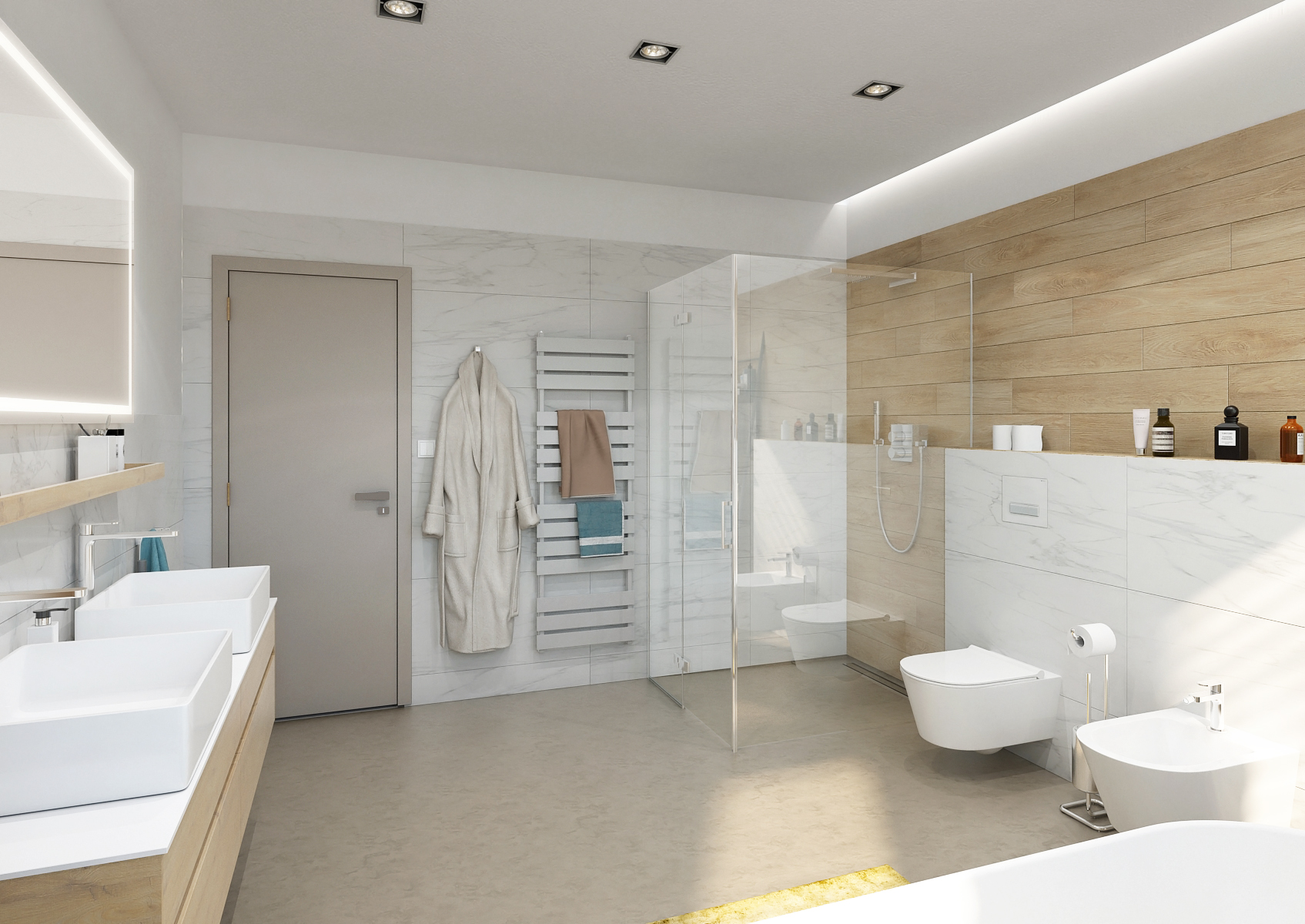 Zeď v koupelně je zpestřena obkladem s motivem dřeva v kombinaci s mramorovým velkoformátovým obkladem a litou podlahou. Nechybí zde ani prostorná walk-in sprcha.