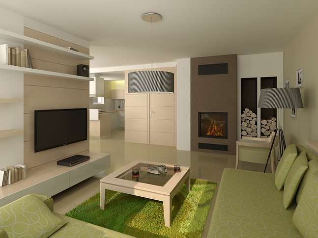 Interiér rodinného domu je řešen čistě, útulně a prakticky. Pastelově zelené prvky přecházející do dalších odstínů zelené celý prostor harmonizují a interiér tak působí lehce a přírodně. Jodnoduchost nalezneme v obkladu kolem dveří a za televizní stěnou ve světlém dřevodekoru. Nechybí ani moderní krb.