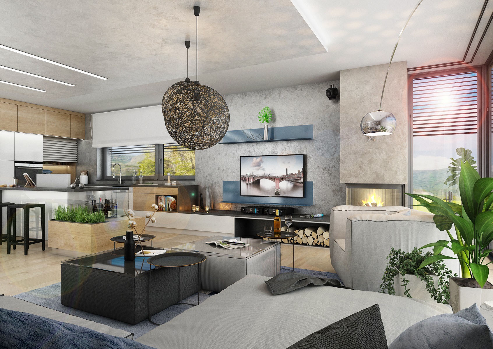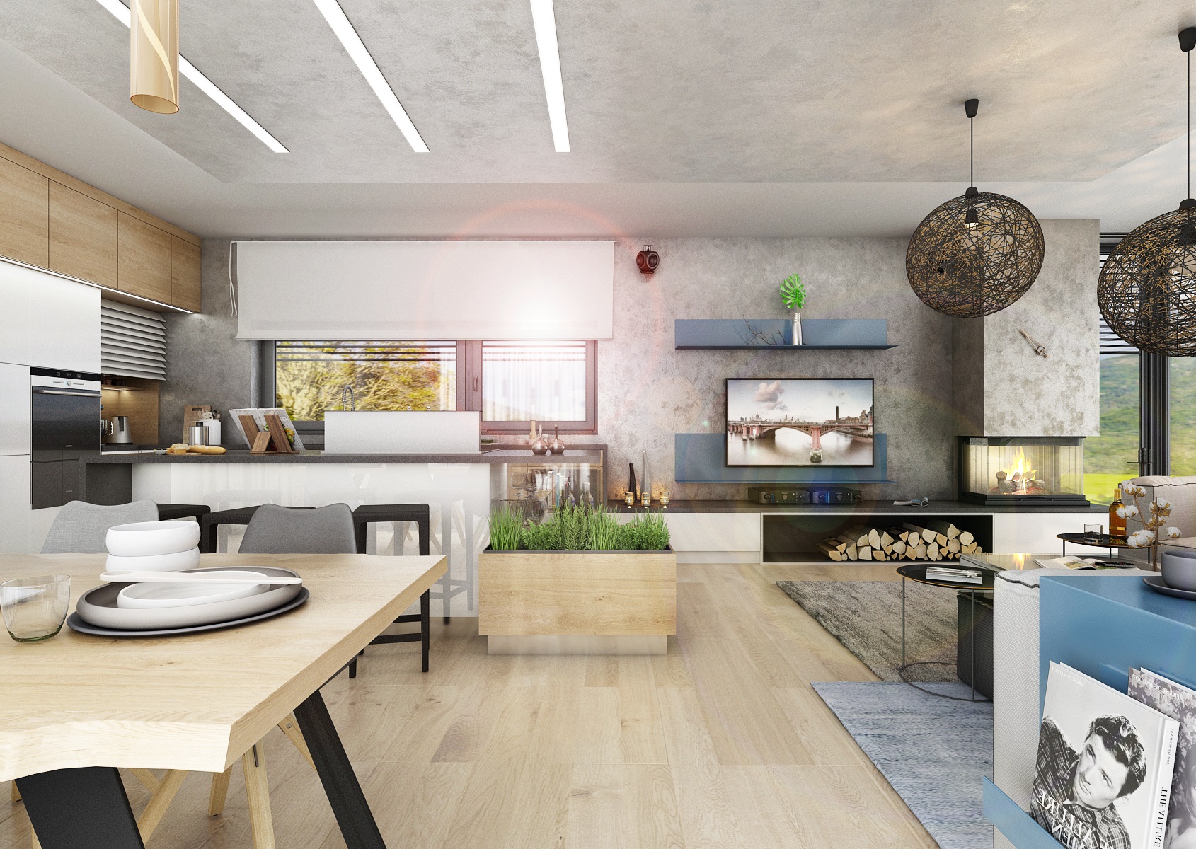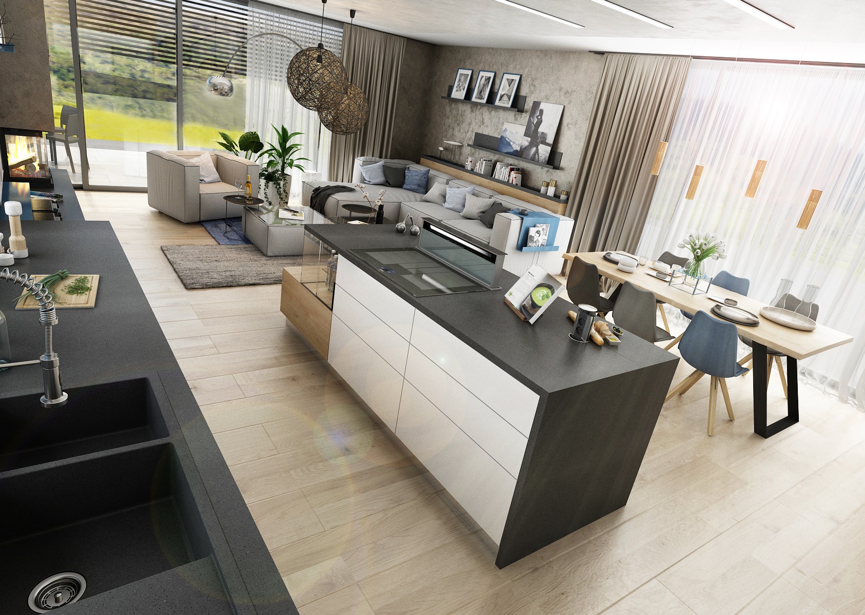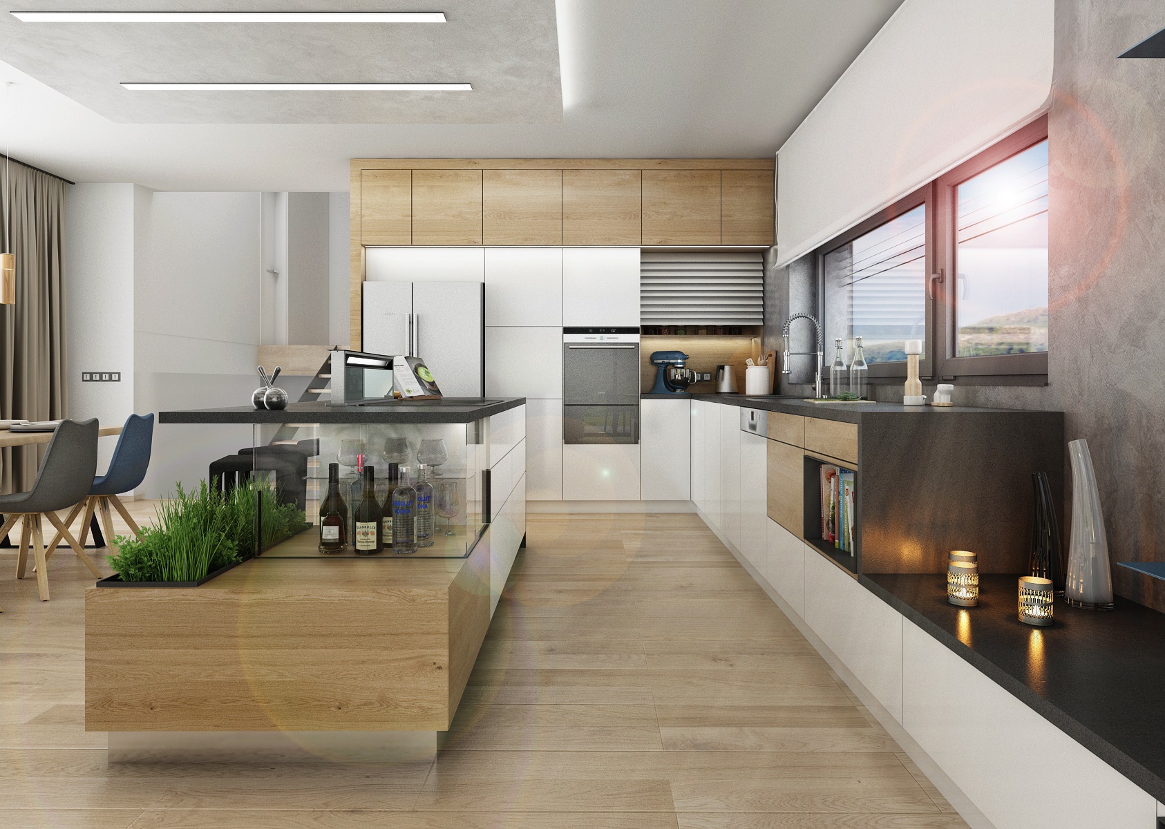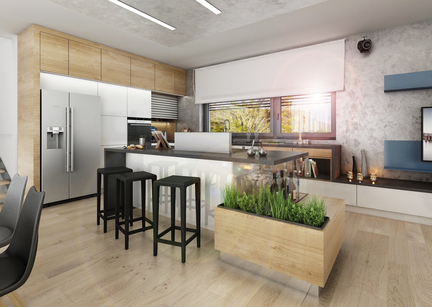 V návrhu domu hraje prim šedá dekorační stěrka, přírodní dub a bílá. Kuchyňská linka má pracovní desku z materiálu technistone, kterou lze díky její odolnosti použít i ke krbové vložce. Kuchyňský ostrůvek má v sobě zakomponovaný bar a prostor na truhlíky s bylinkami atd.