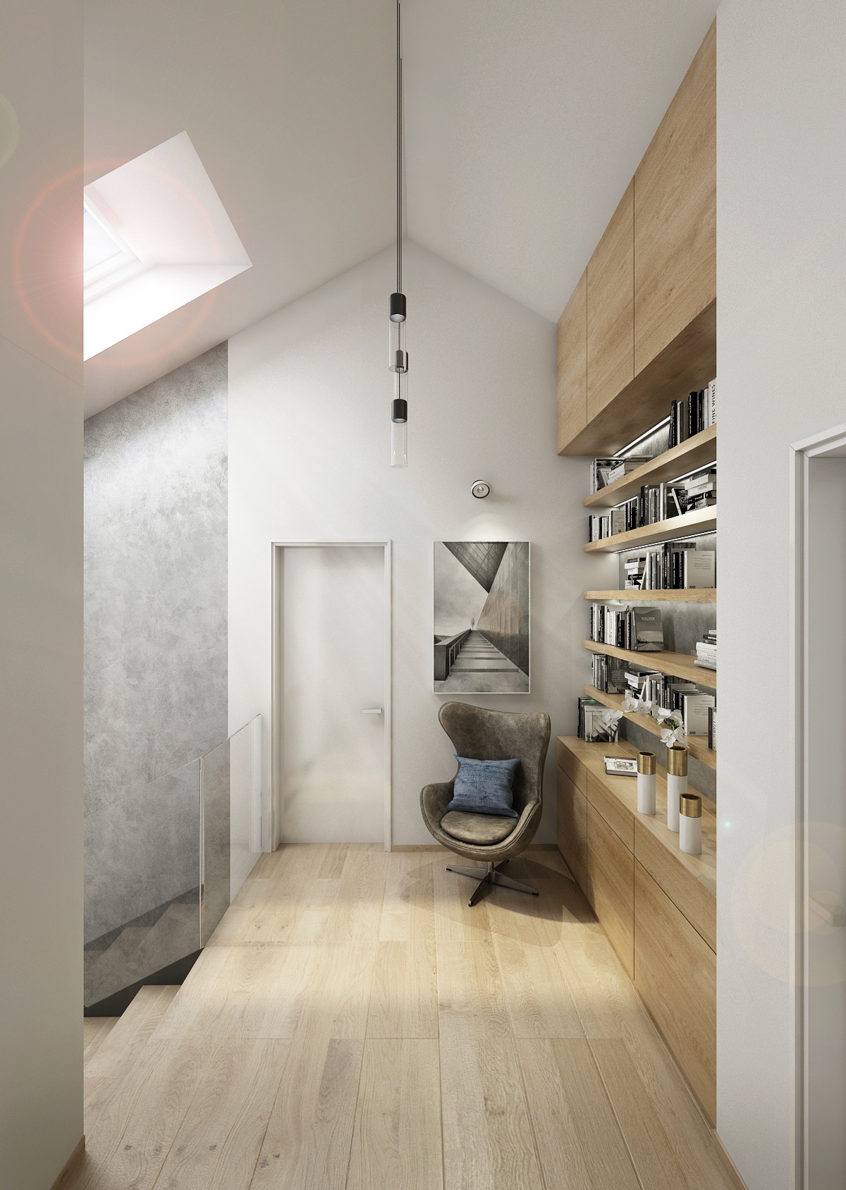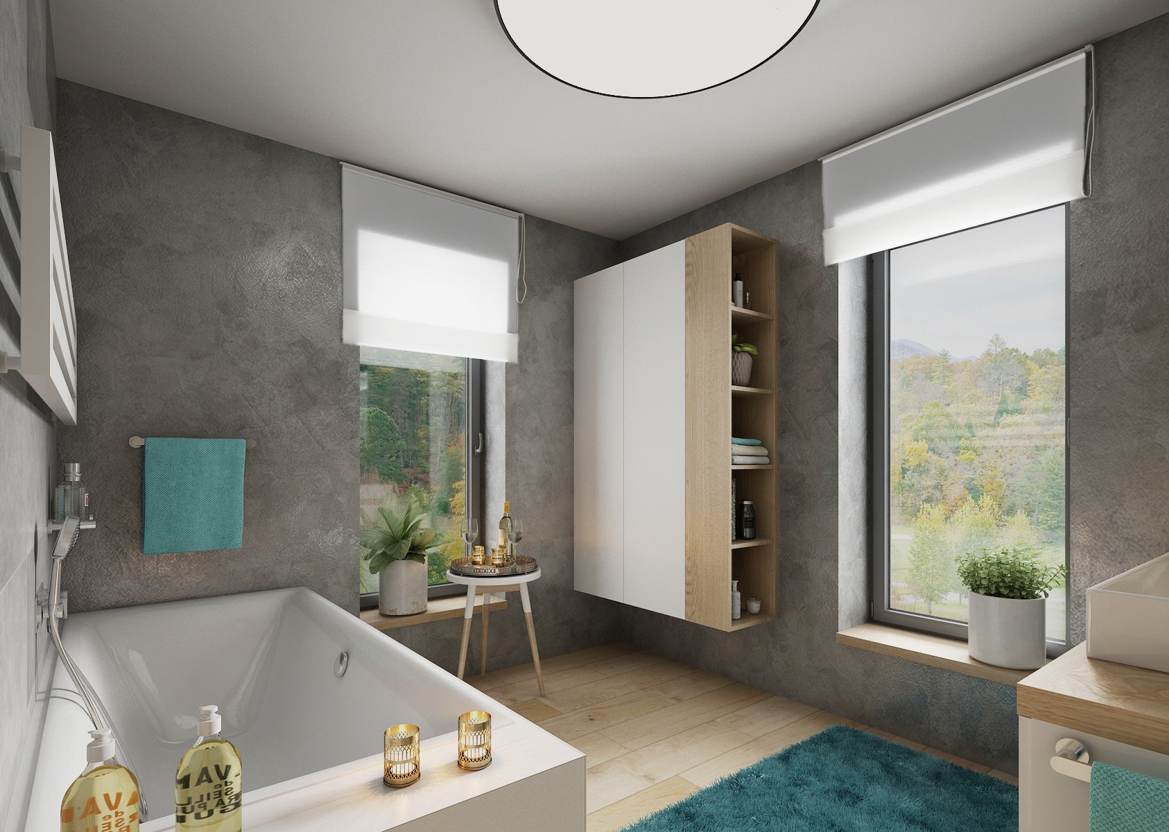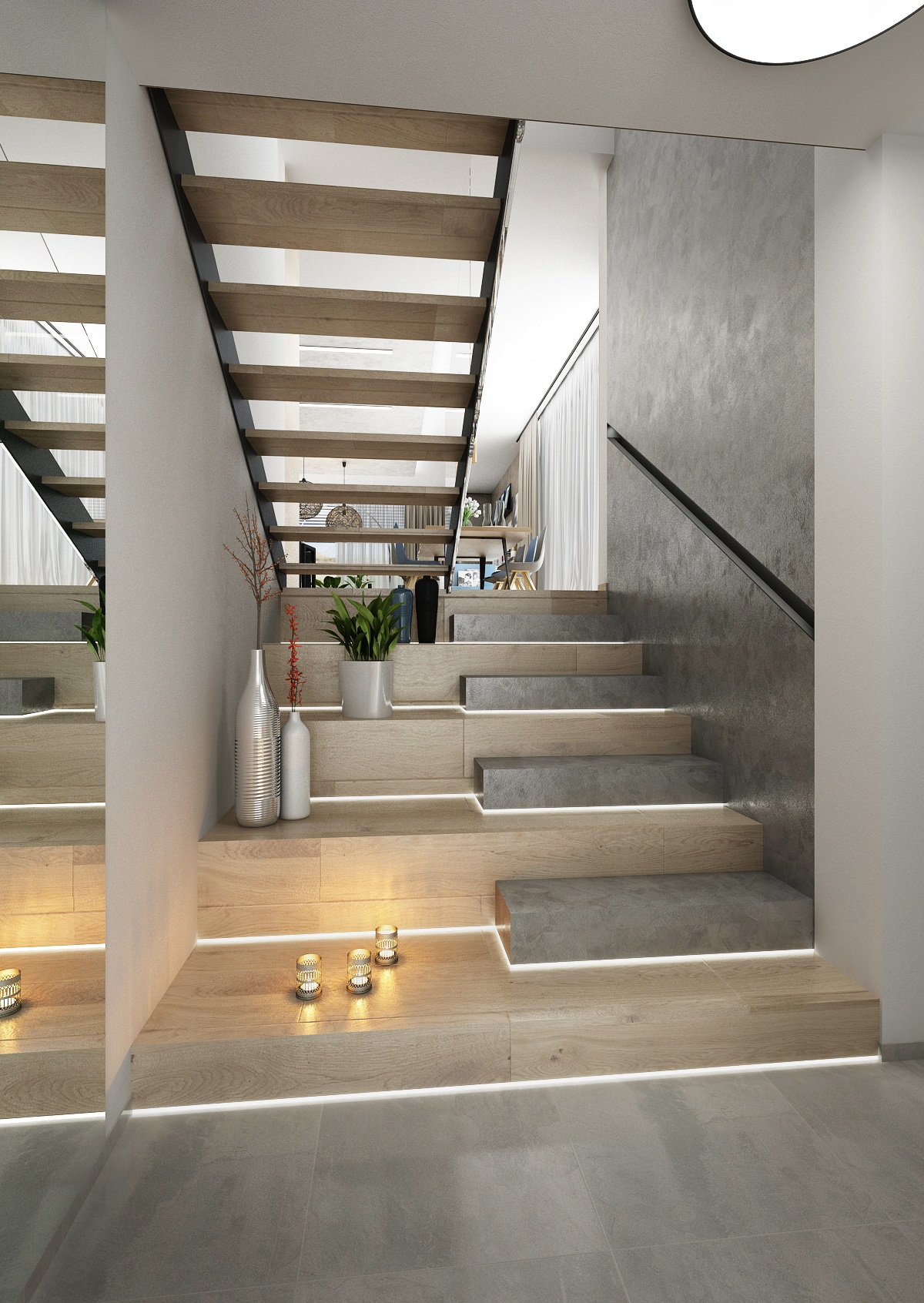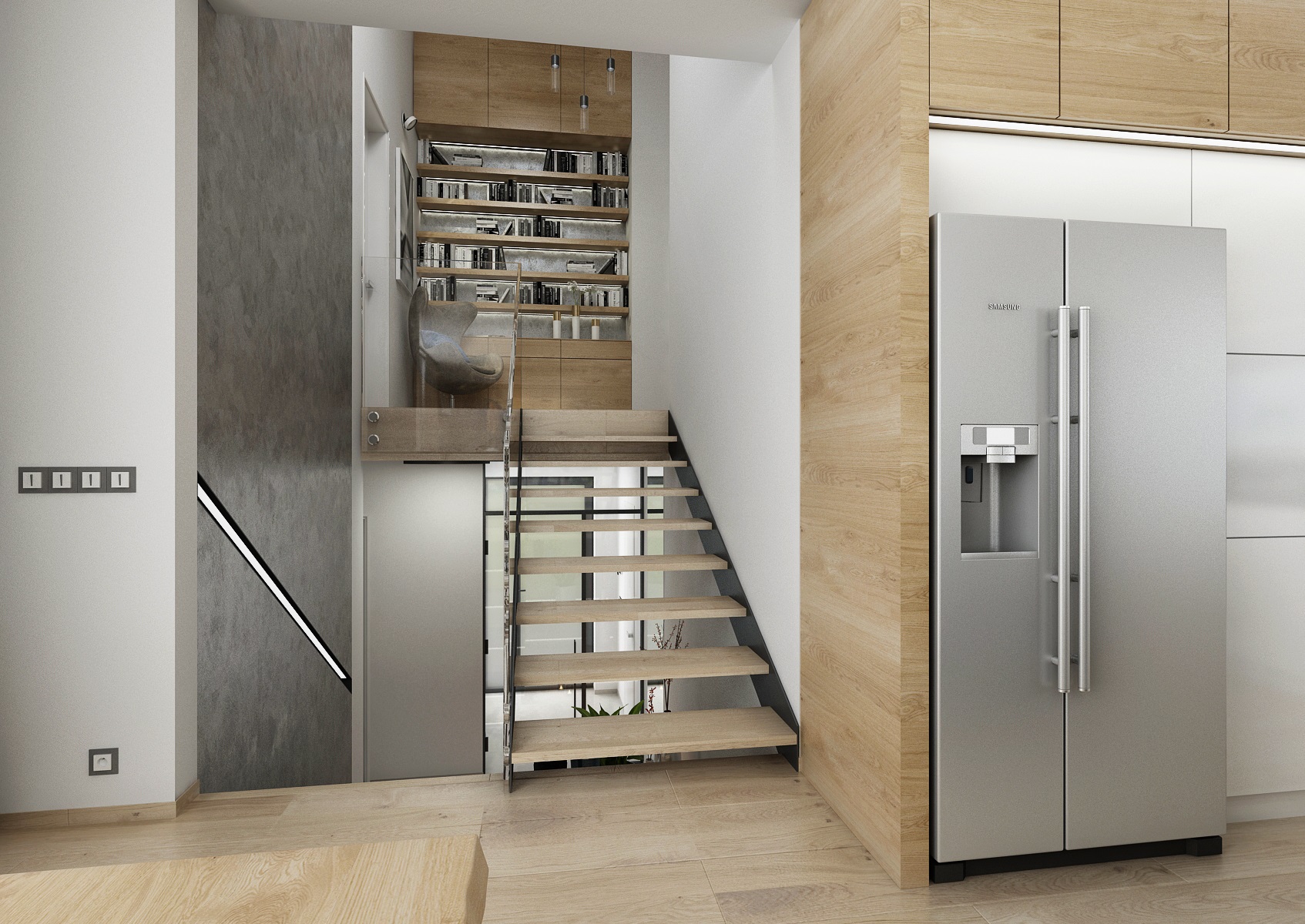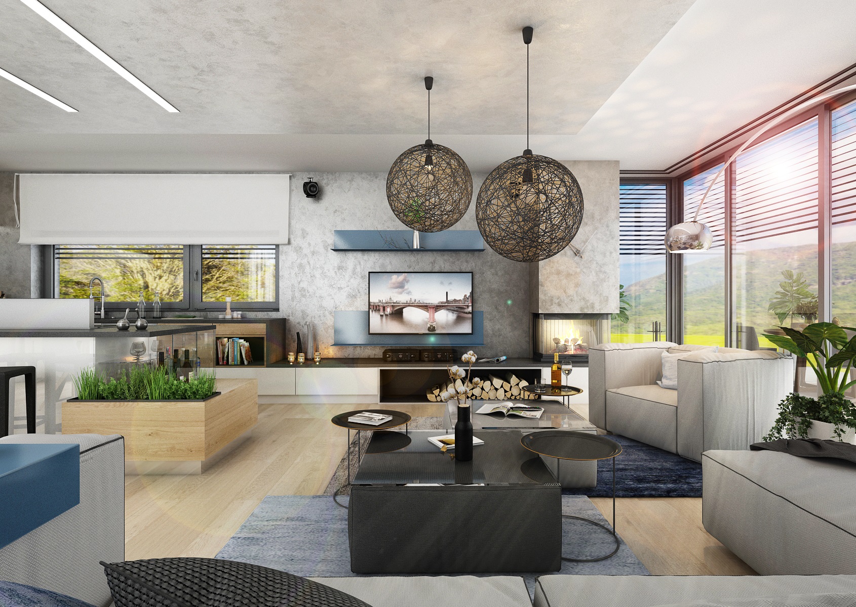 V návrhu domu hraje prim šedá dekorační stěrka, přírodní dub a bílá. Kuchyňská linka má pracovní desku z materiálu technistone, kterou lze díky její odolnosti použít i ke krbové vložce. Kuchyňský ostrůvek má v sobě zakomponovaný bar a prostor na truhlíky s bylinkami atd.
