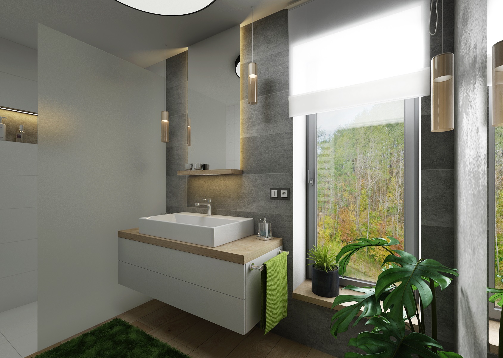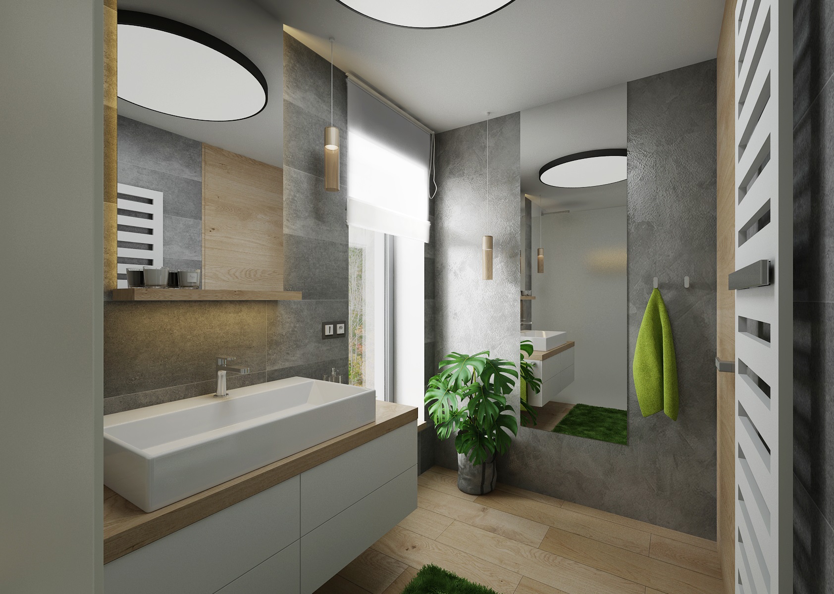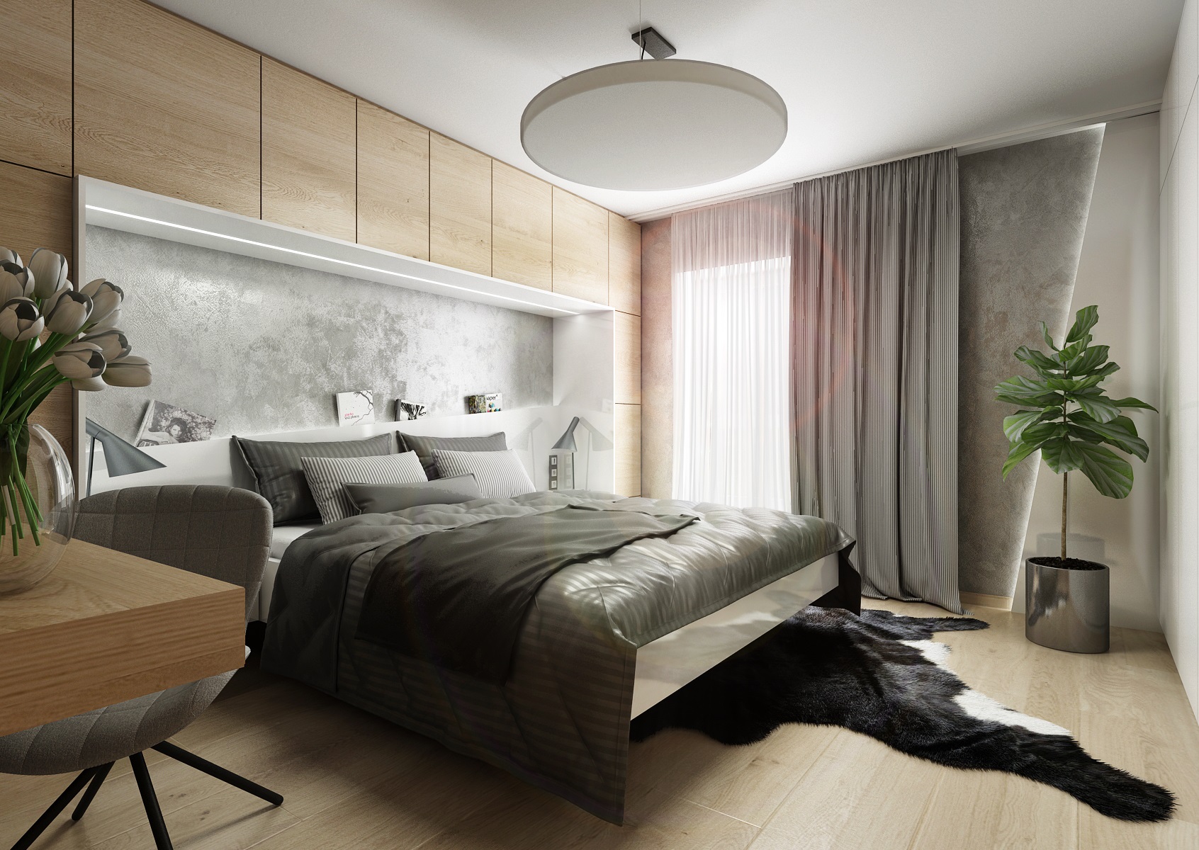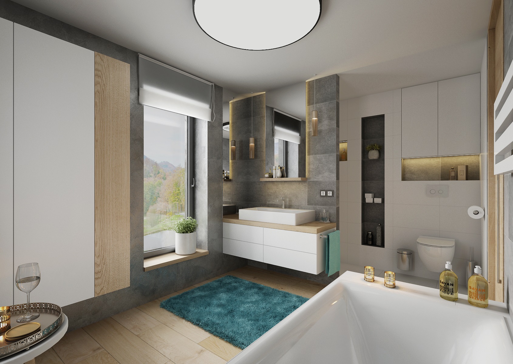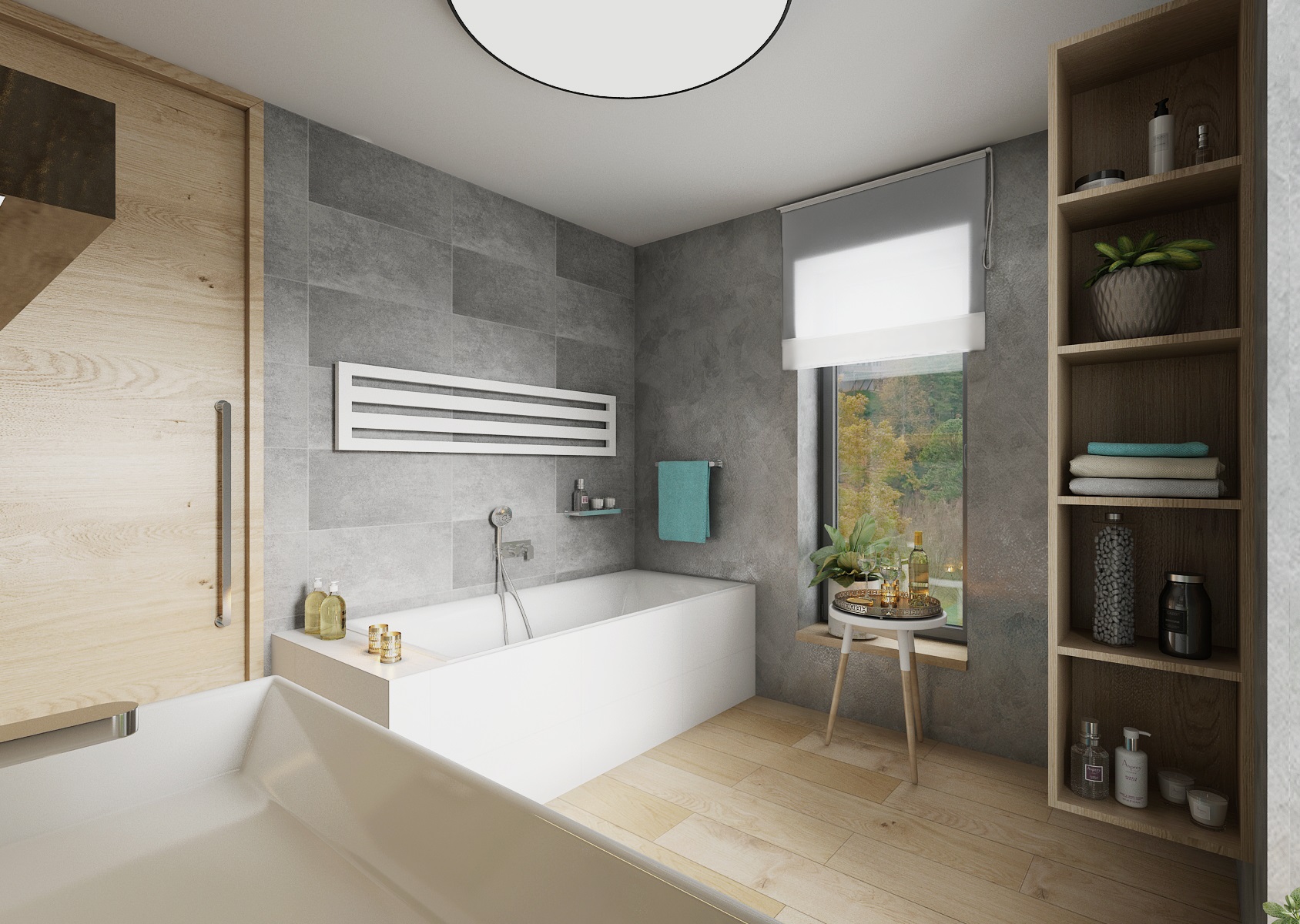 V návrhu domu hraje prim šedá dekorační stěrka, přírodní dub a bílá. Kuchyňská linka má pracovní desku z materiálu technistone, kterou lze díky její odolnosti použít i ke krbové vložce. Kuchyňský ostrůvek má v sobě zakomponovaný bar a prostor na truhlíky s bylinkami atd.
