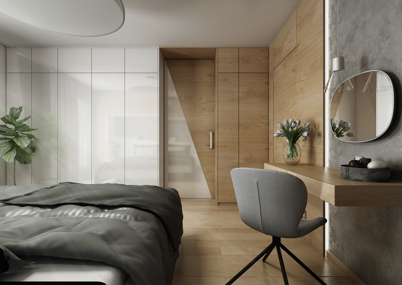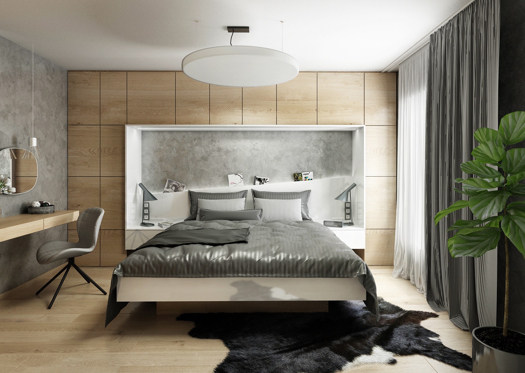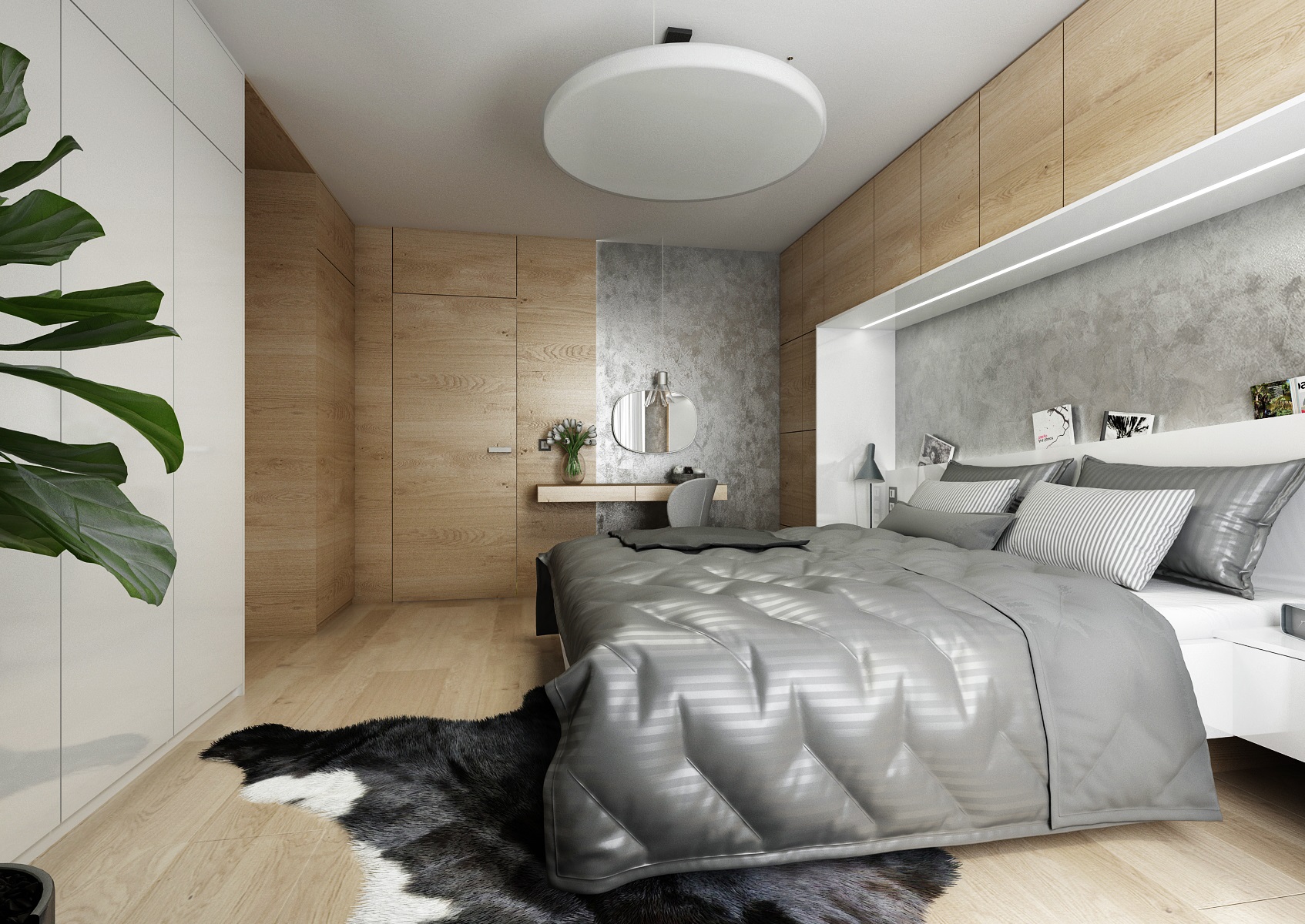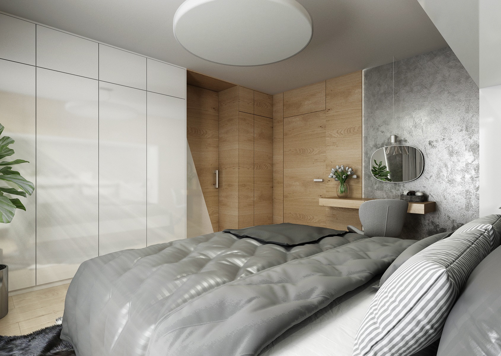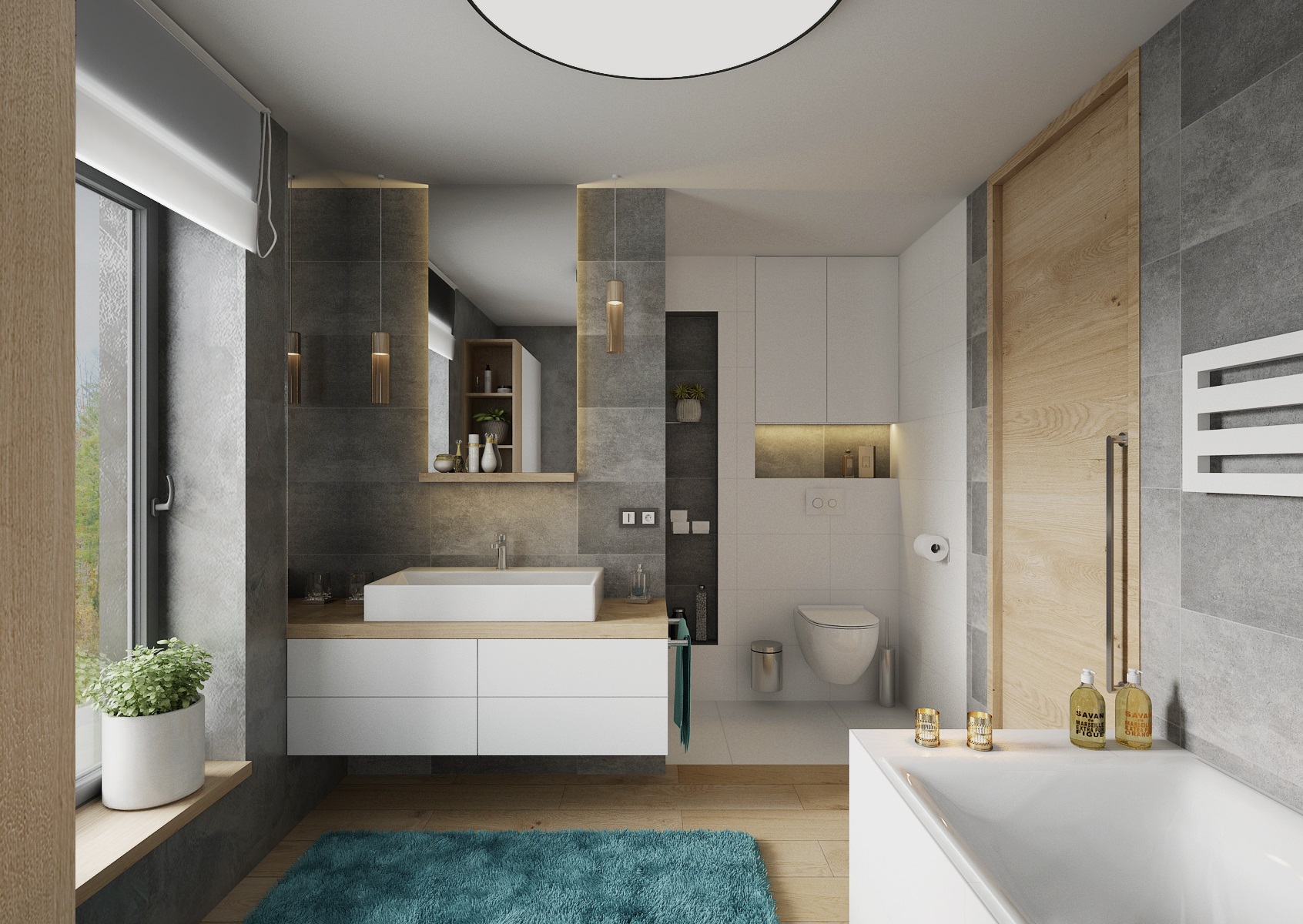 V návrhu domu hraje prim šedá dekorační stěrka, přírodní dub a bílá. Kuchyňská linka má pracovní desku z materiálu technistone, kterou lze díky její odolnosti použít i ke krbové vložce. Kuchyňský ostrůvek má v sobě zakomponovaný bar a prostor na truhlíky s bylinkami atd.
