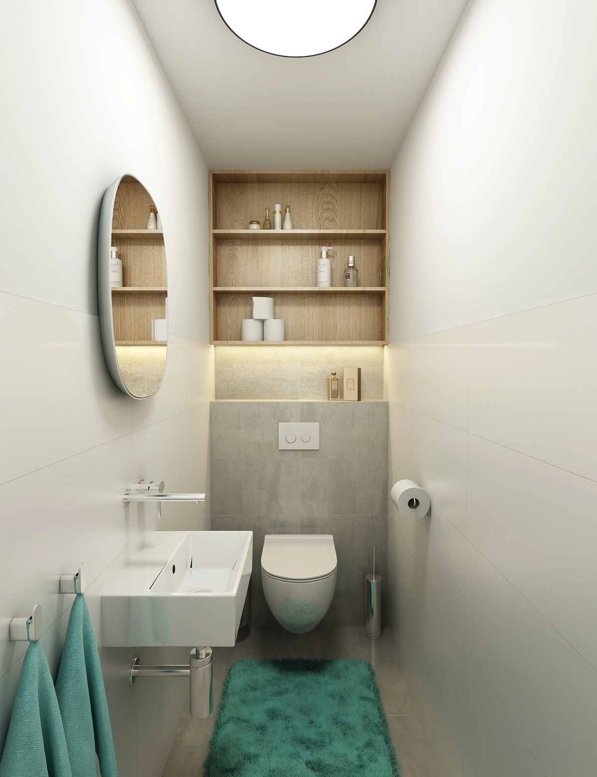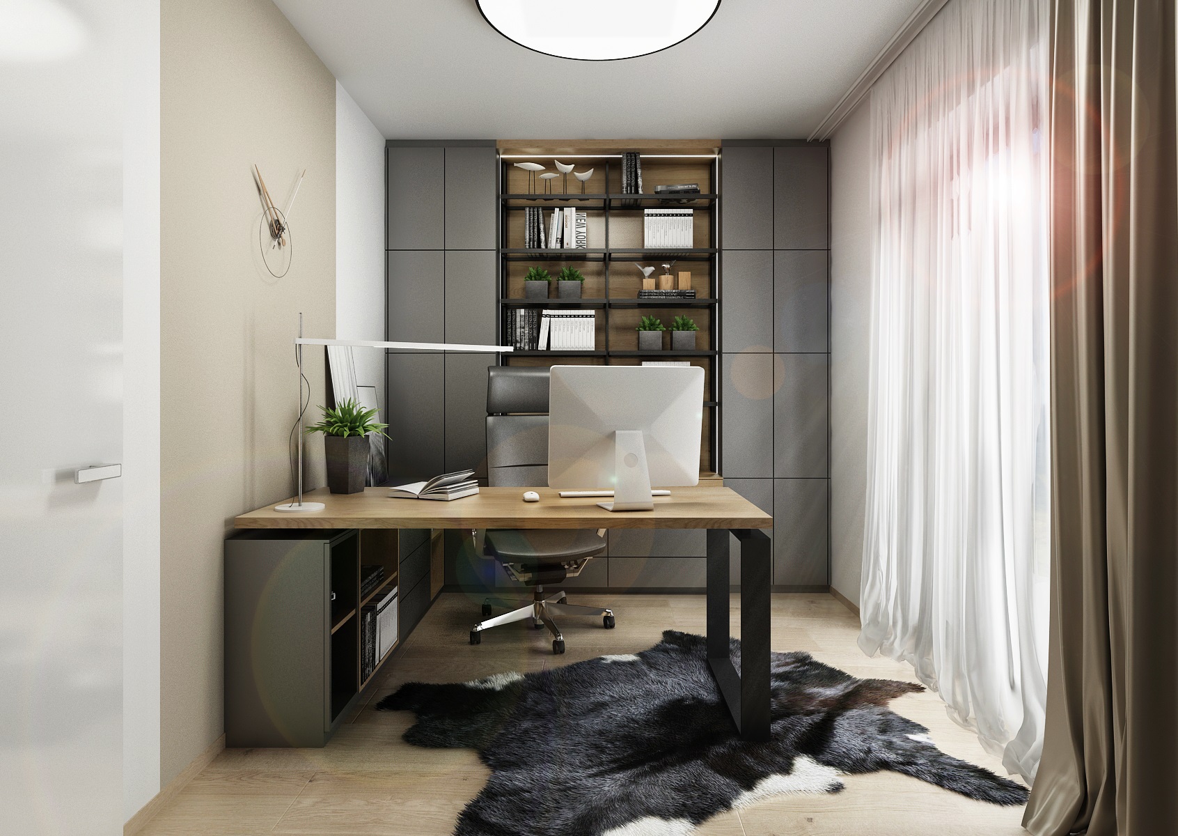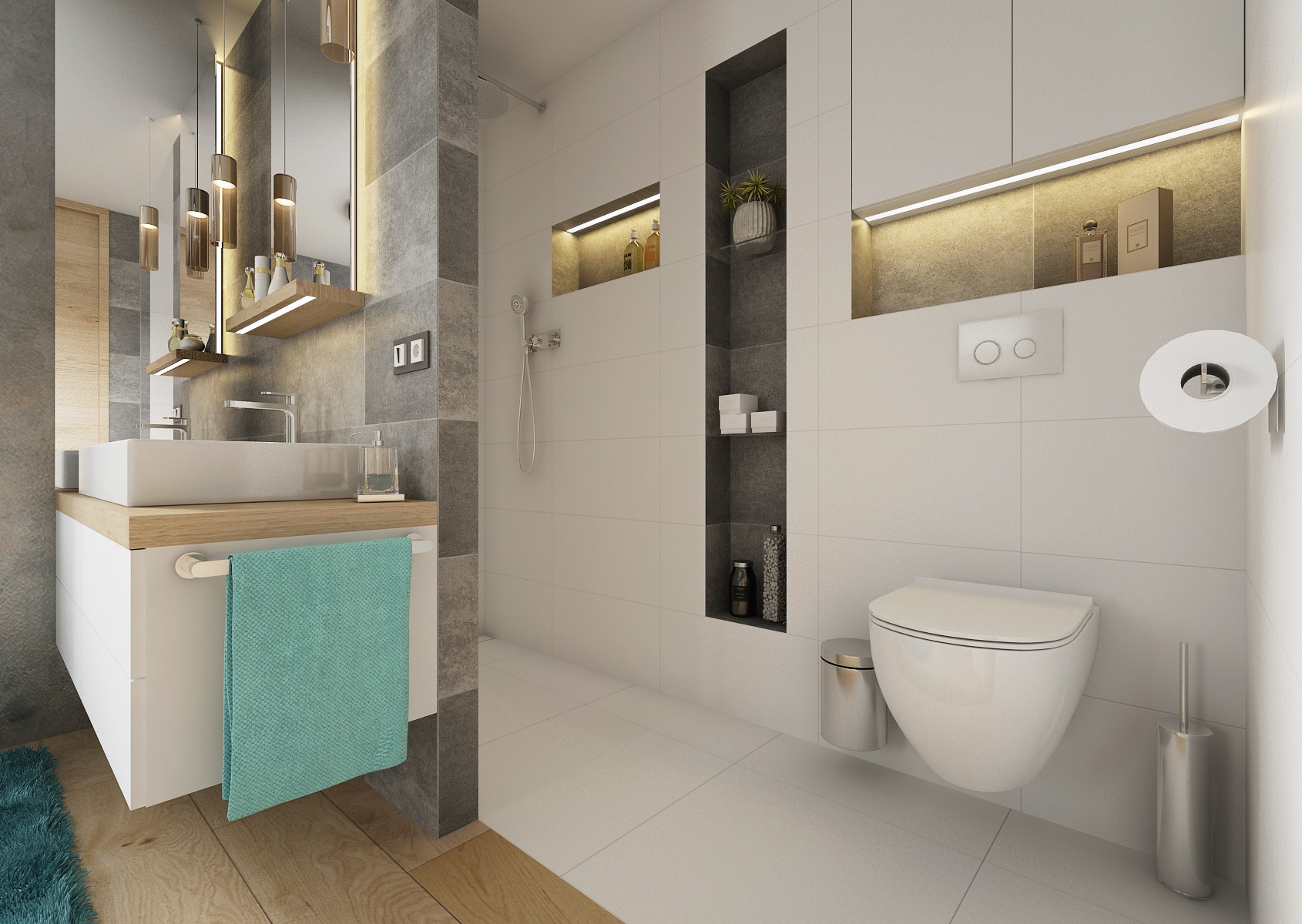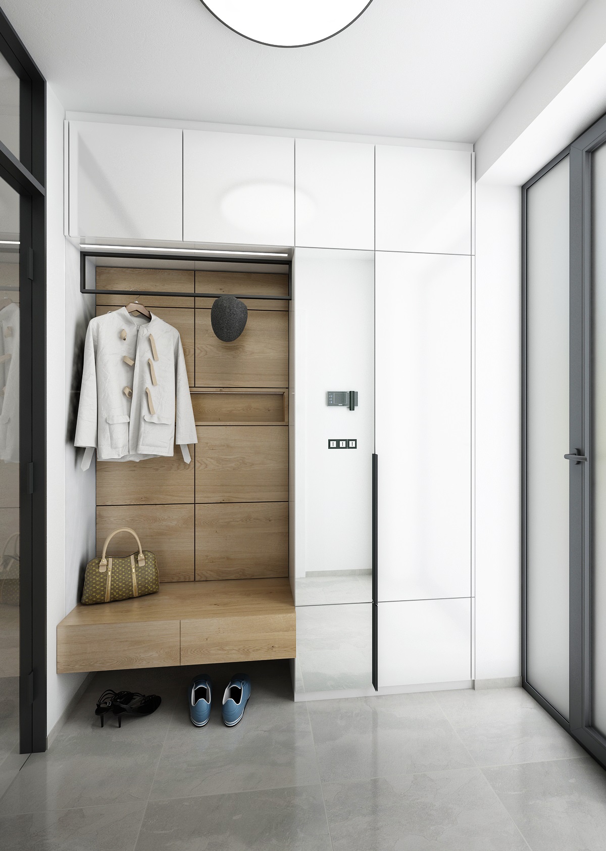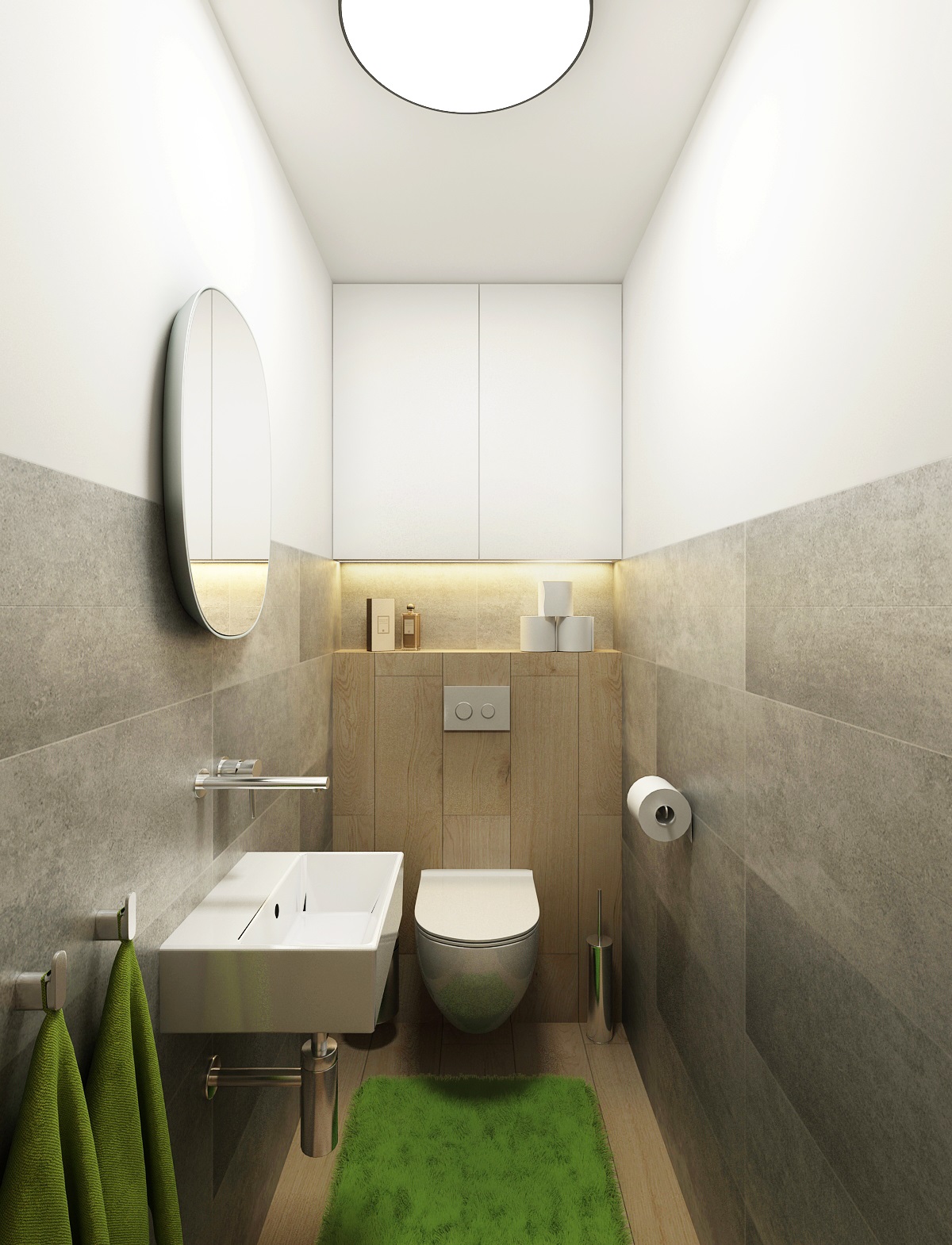 V návrhu domu hraje prim šedá dekorační stěrka, přírodní dub a bílá. Kuchyňská linka má pracovní desku z materiálu technistone, kterou lze díky její odolnosti použít i ke krbové vložce. Kuchyňský ostrůvek má v sobě zakomponovaný bar a prostor na truhlíky s bylinkami atd.