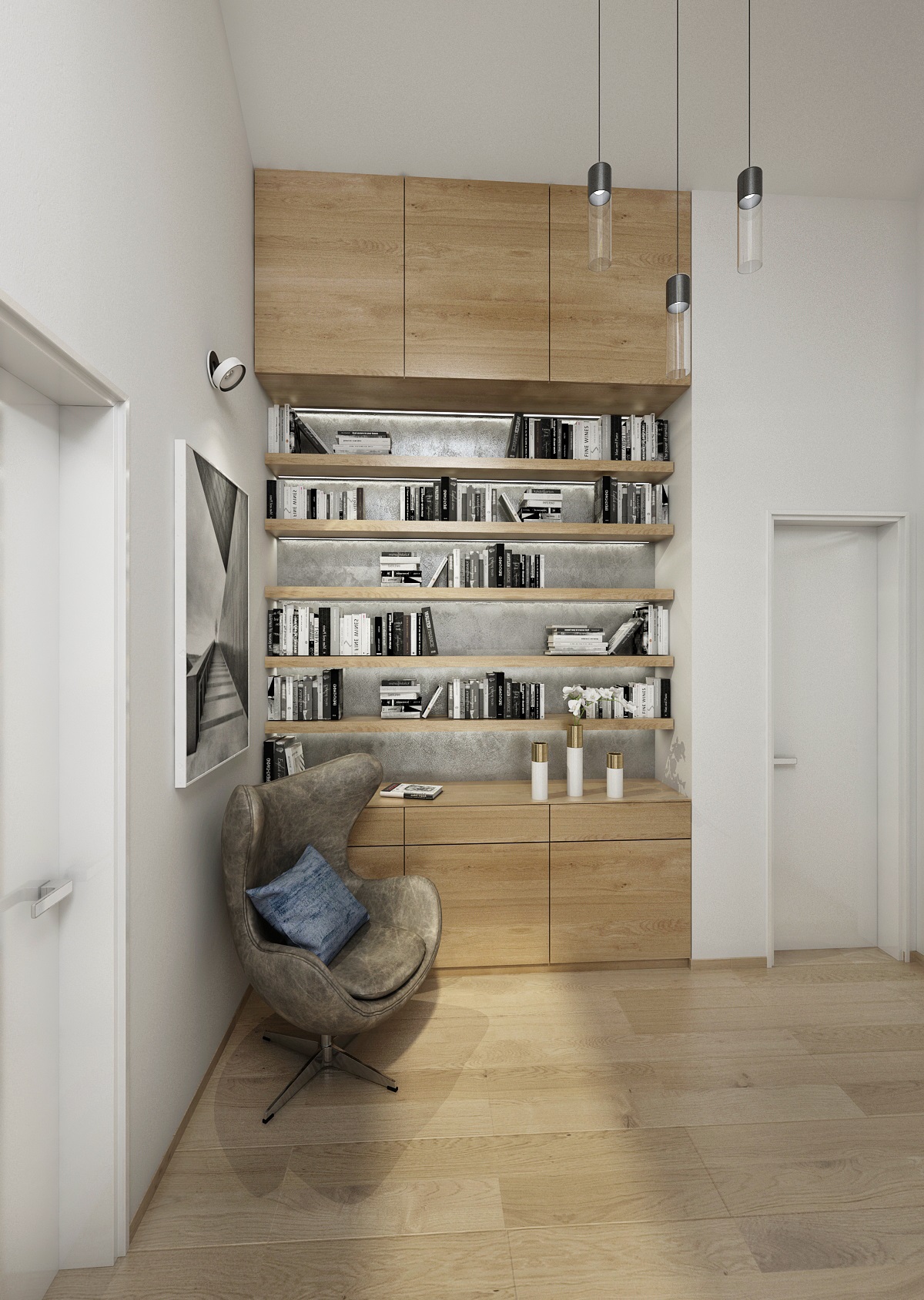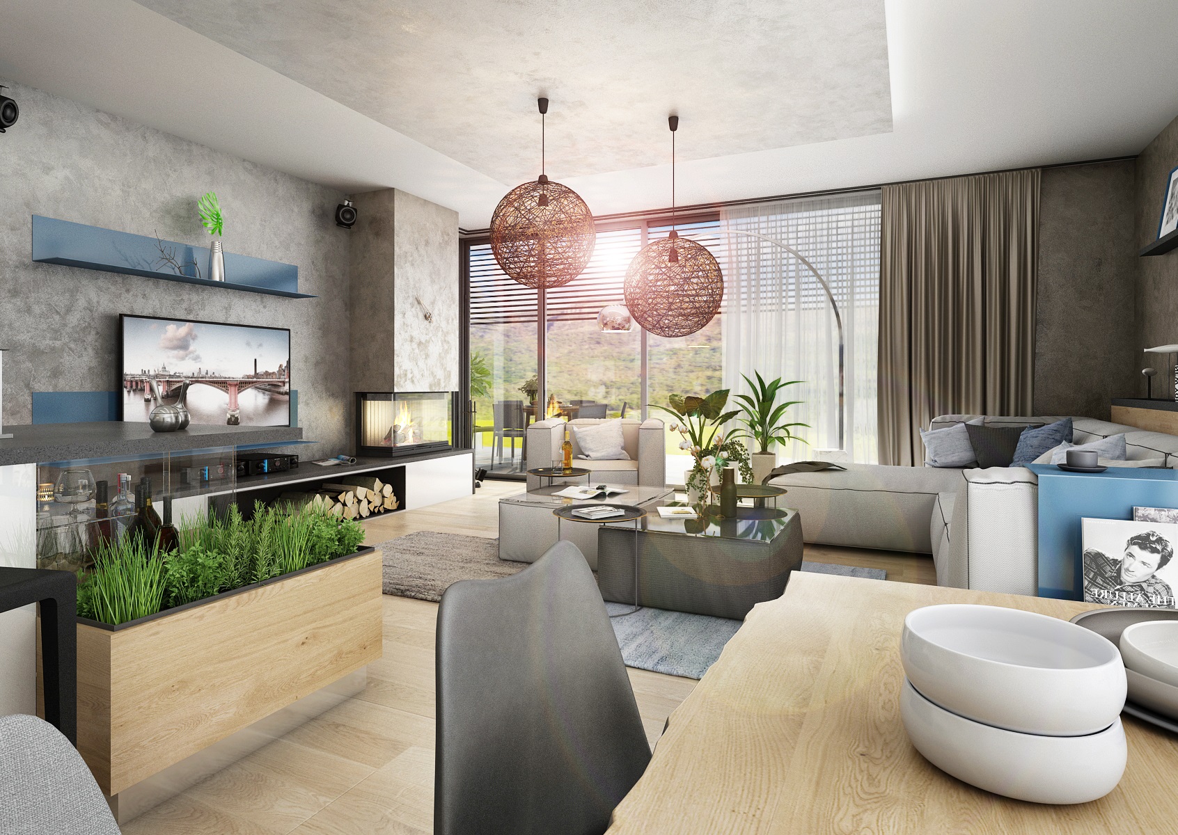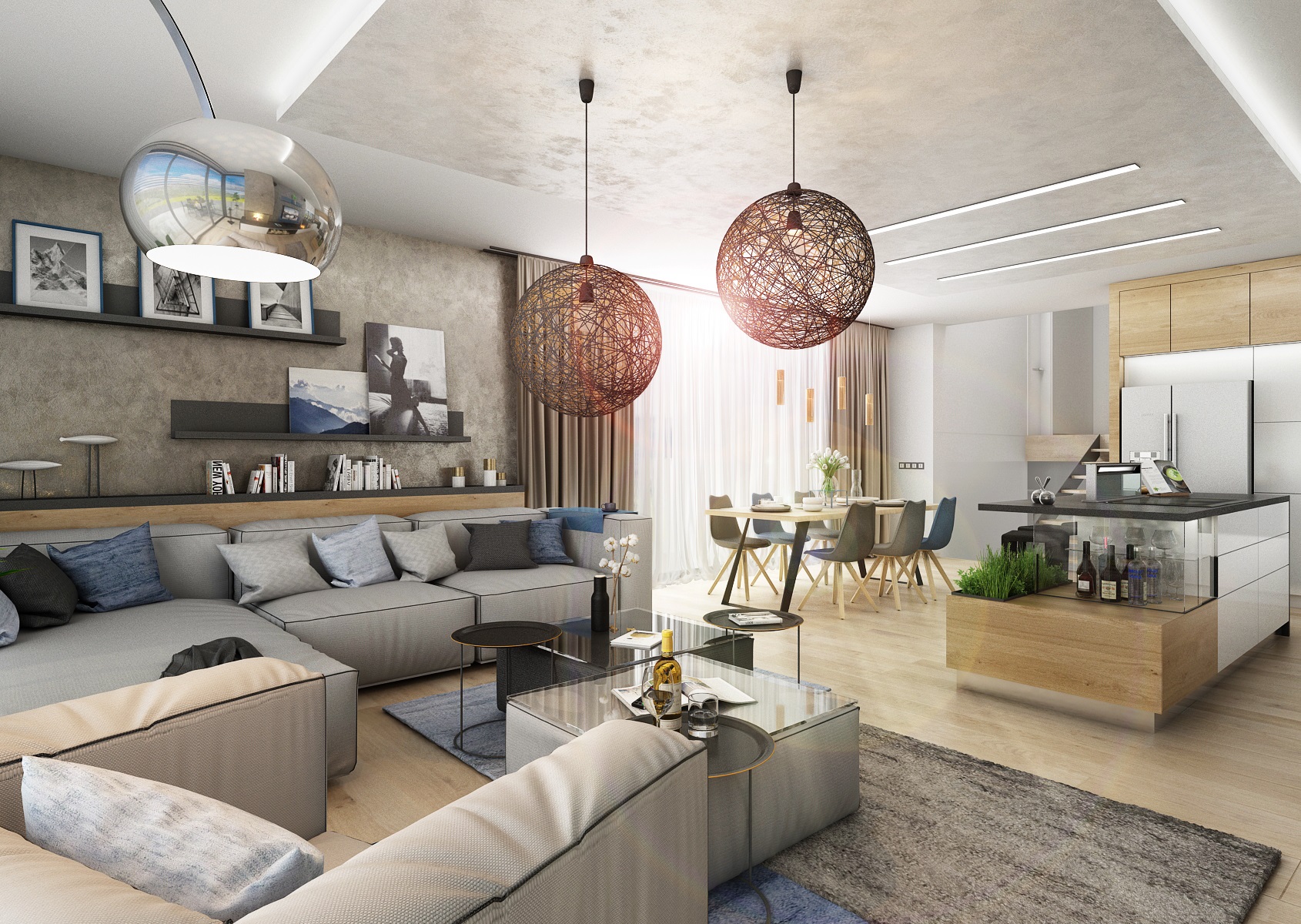 Jako sedací souprava byla vybrána pohovka NEFF z firmy Polstrin a závěsná kulovitá svítidla ze sklolaminátu Moooi Random.
