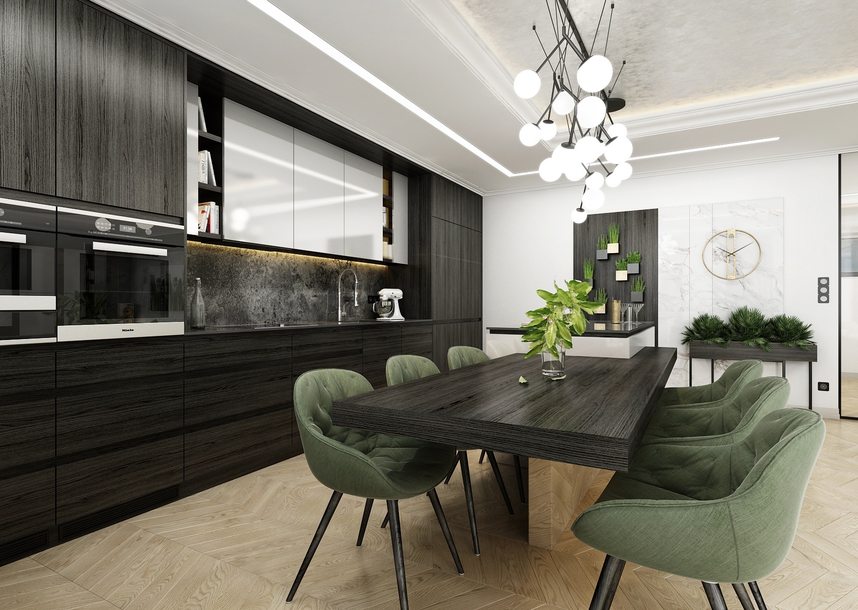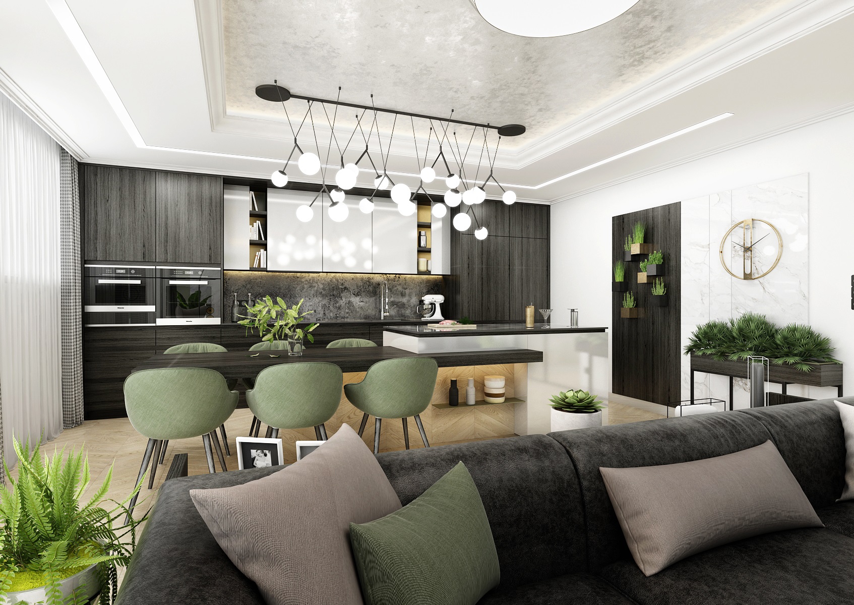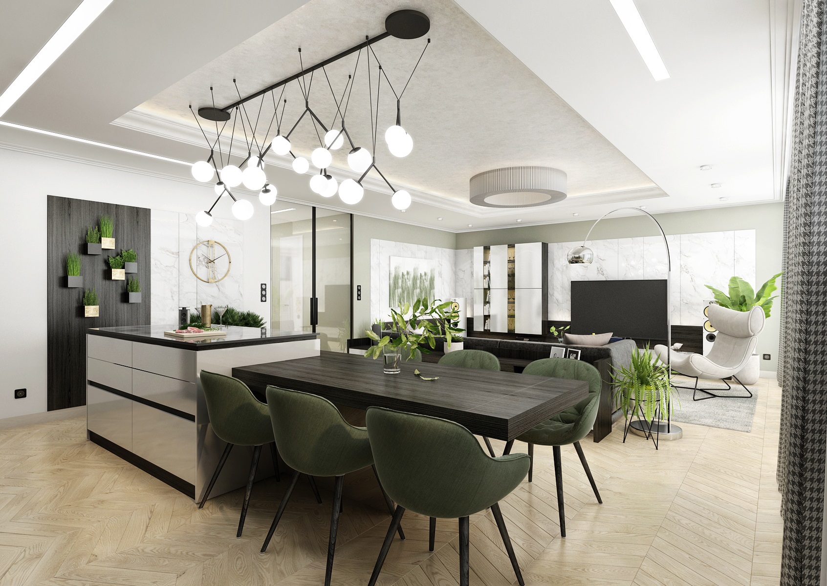 Monochromacitu prostoru vyvažuje dřevěná podlaha z běleného dubu a doplňková zelená barva čalounění, židlí a květin.
