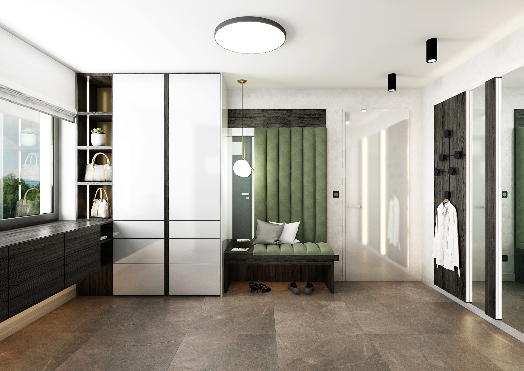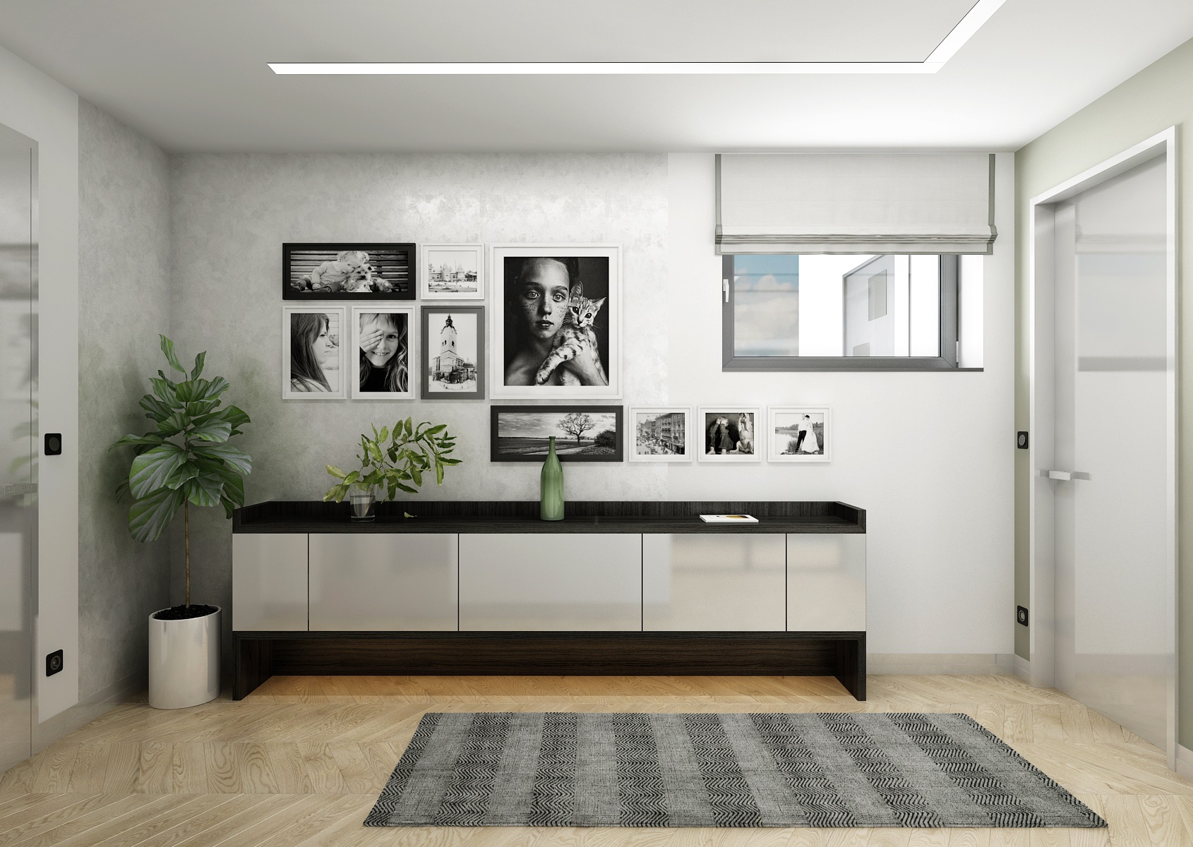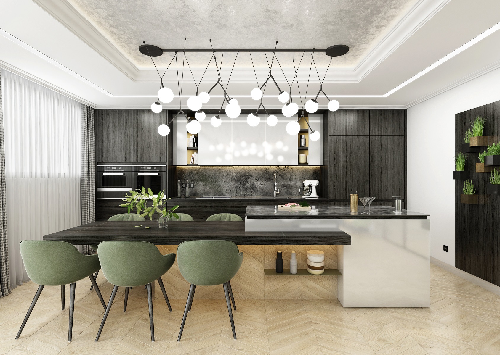 Monochromacitu prostoru vyvažuje dřevěná podlaha z běleného dubu a doplňková zelená barva čalounění, židlí a květin.
