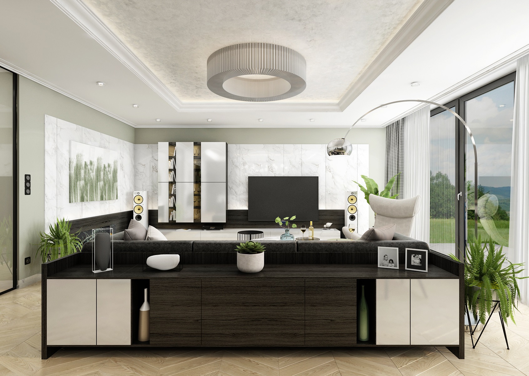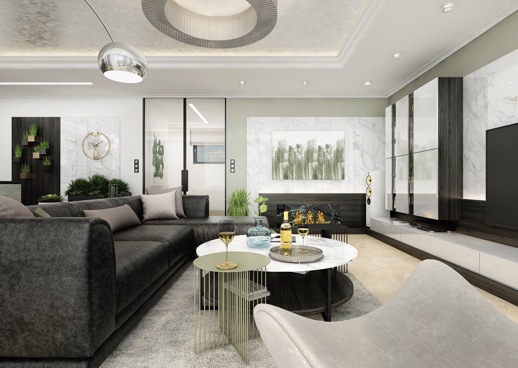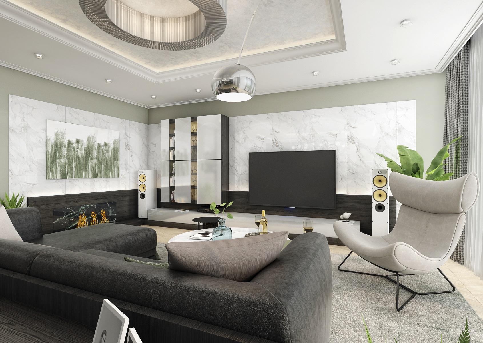 Interiér skoro jen výlučně v černobílé kombinaci mramoru, šedé metalické stěrky, nábytku z tmavé dýhy wenge a bíle lakované MDF.