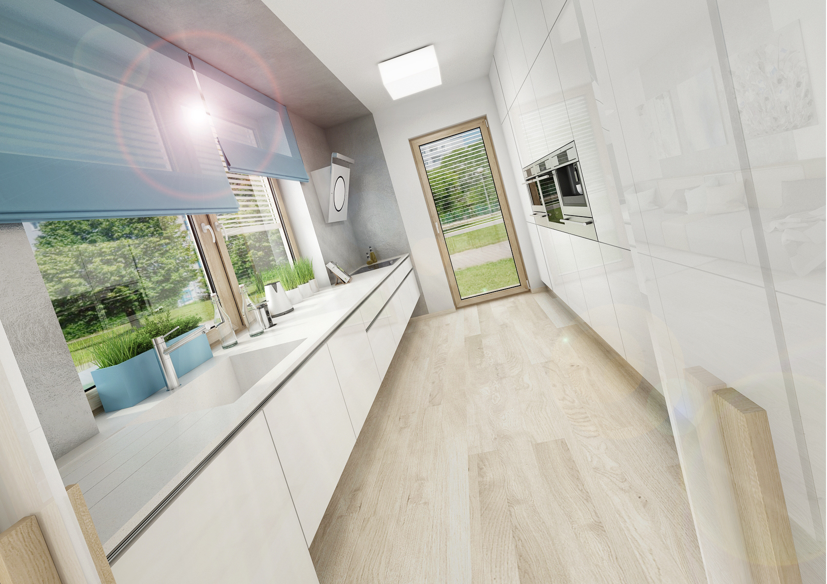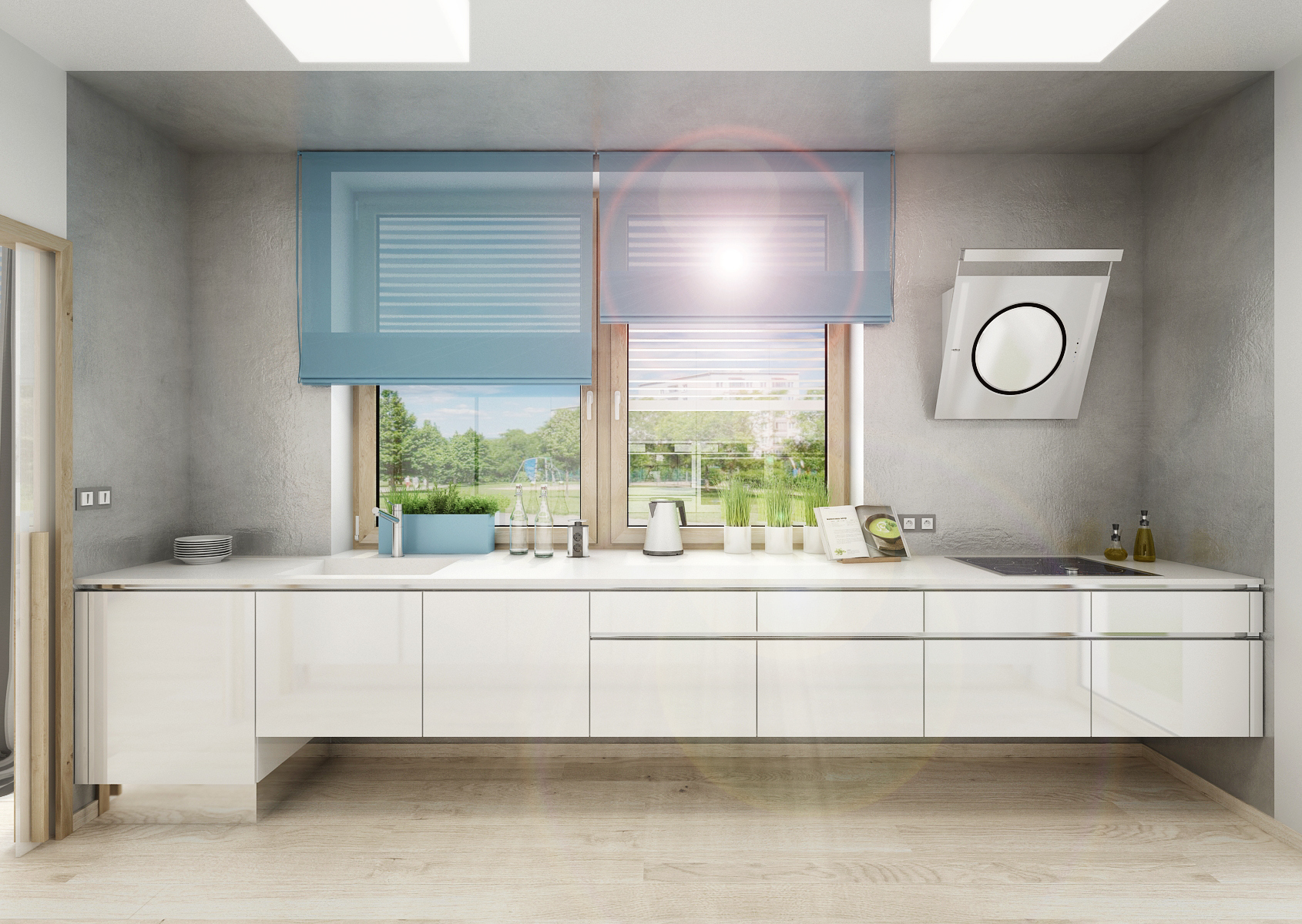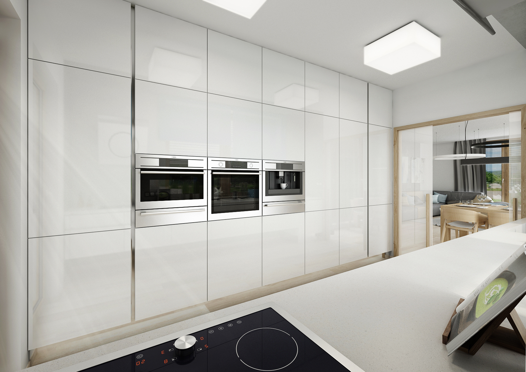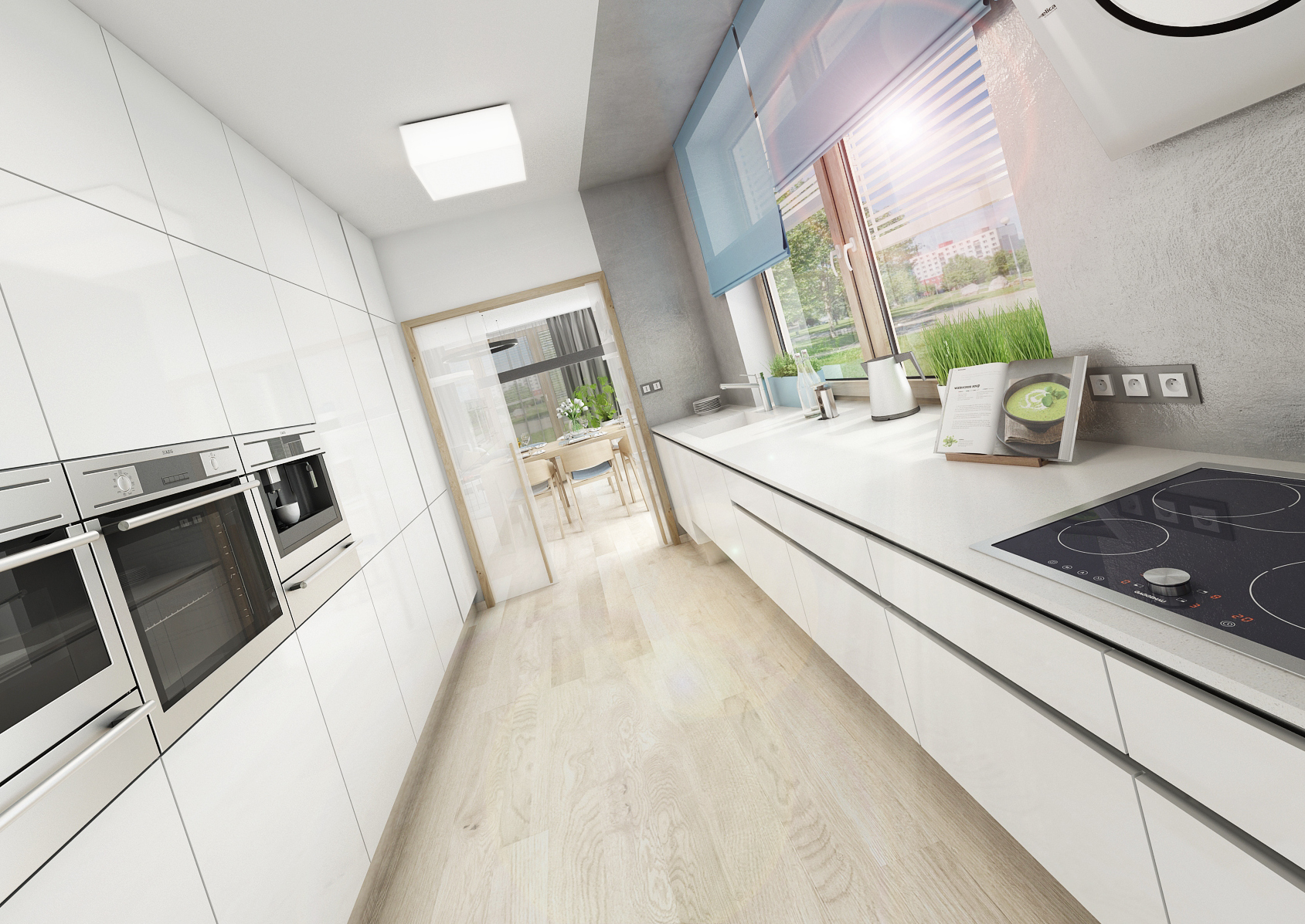 Moderní kuchyňská linka je oddělena dveřmi z mléčného skla v posuvu, které se zasouvají do pouzdra mezi sádrokartonovými zdmi. Dvě paralelní sestavy v úzkém prostoru omezeném vchodem a okny jsou nanejvýš praktické. Pod varnou deskou jsou zavěšené spodní skříňky, bez nožek, bez soklu. Výjimkou je vestavná myčka, umístěná vedle dřezu. Ten je z umělého kamene stejně jako pracovní deska. Zvolený materiál umožňuje vyrobit desku v takové délce bez viditelných spojů. Vysoká skříň ukrývá vestavnou lednici a poskytuje maximum úložného prostoru. Výše posazené spotřebiče jsou pohodlně přístupné.
