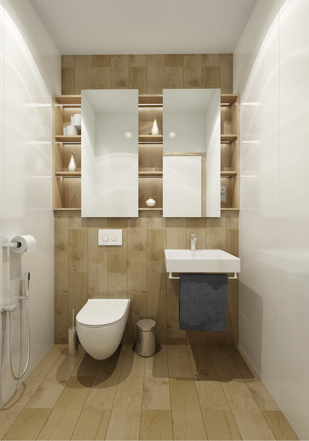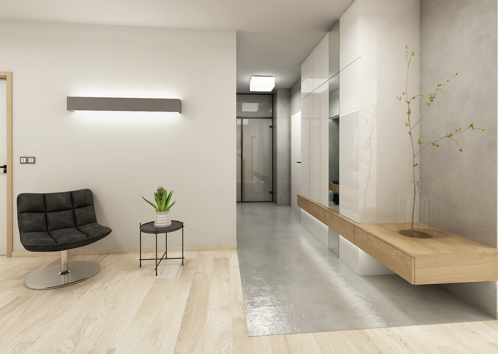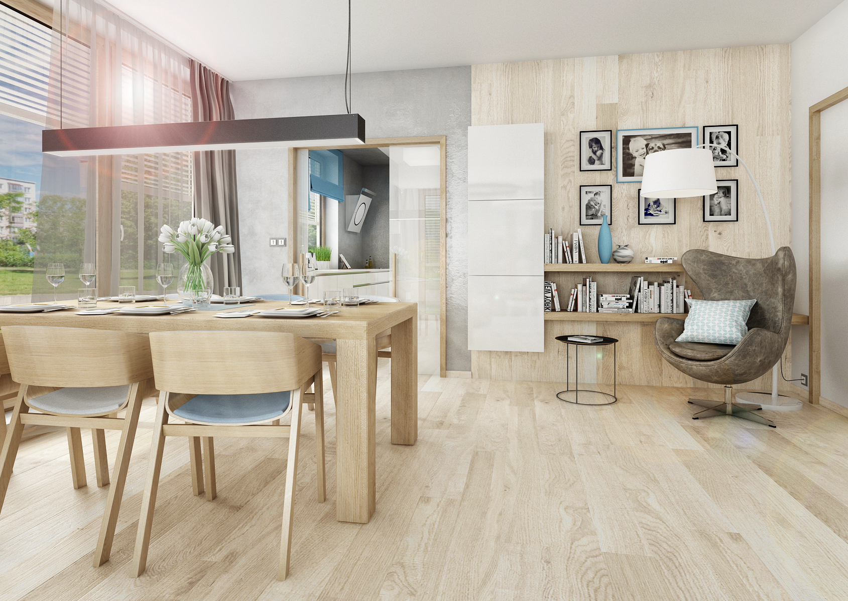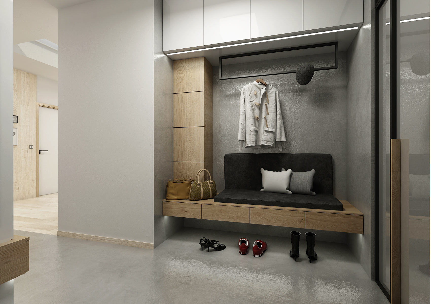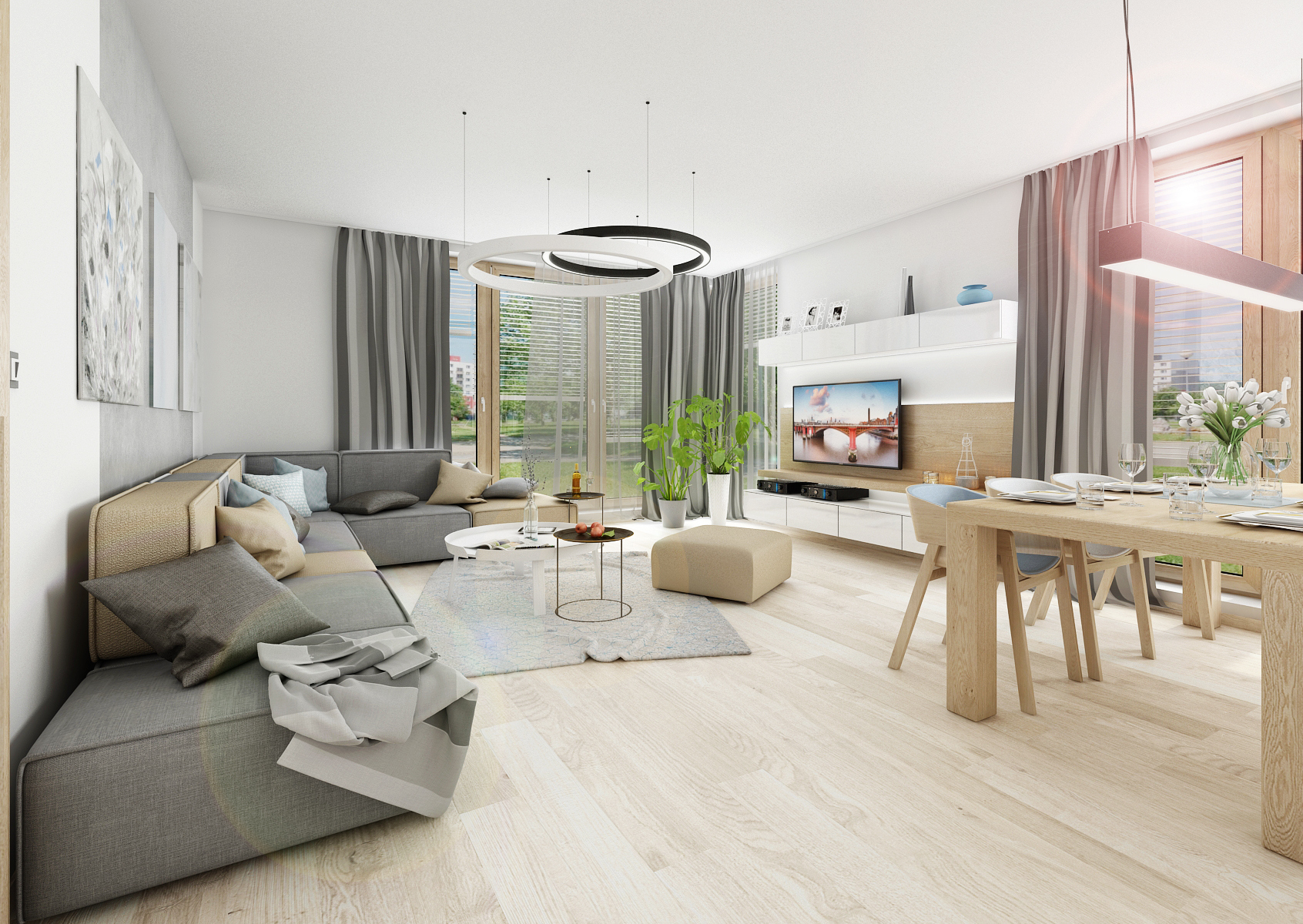 Byt o rozloze 125 m2, v posledním patře nového bytového domu. Materiál přírodního dubu a bílého laku ve vysokém lesku prostupuje celým bytem, doplňuje ho módní šedá stěrka. Do jednoduše zařízeného obývacího pokoje se vejde velká rohová pohovka, sestavená z jednotlivých modulů, i masivní jídelní stůl pro šest osob.