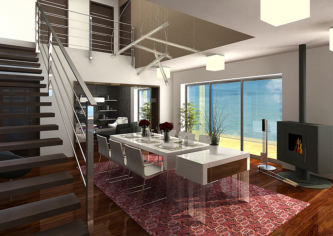 V mezonetovém prostoru bytu je výrazná hnědá dřevěná podlaha, dominantou v jídelní části je stůl, vhodný pro společenská setkání. Velká prosklená okna zajišťují dostatek denního světla a dále je interiér doplněn mnoha stropními a dalšími světly.
