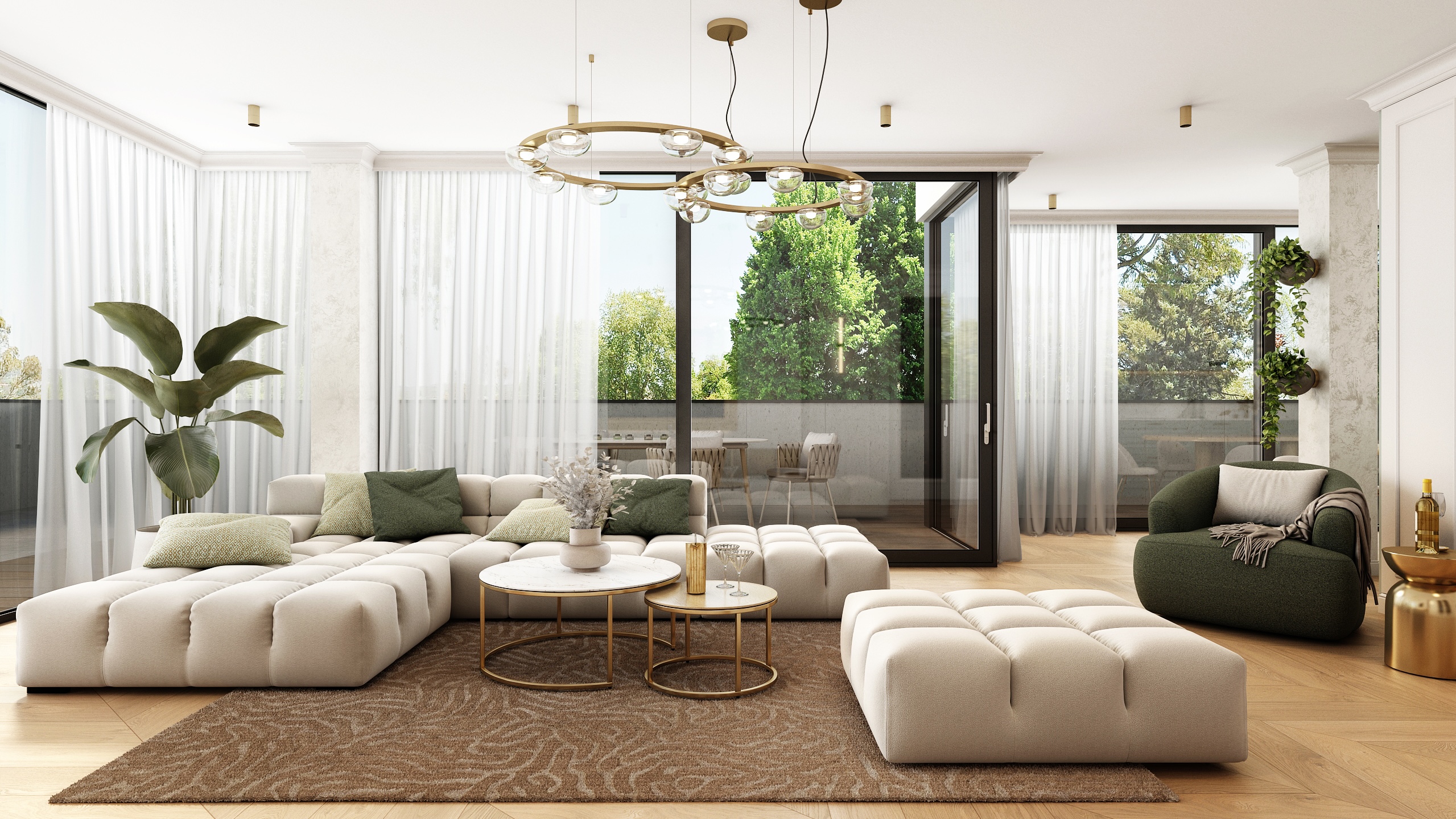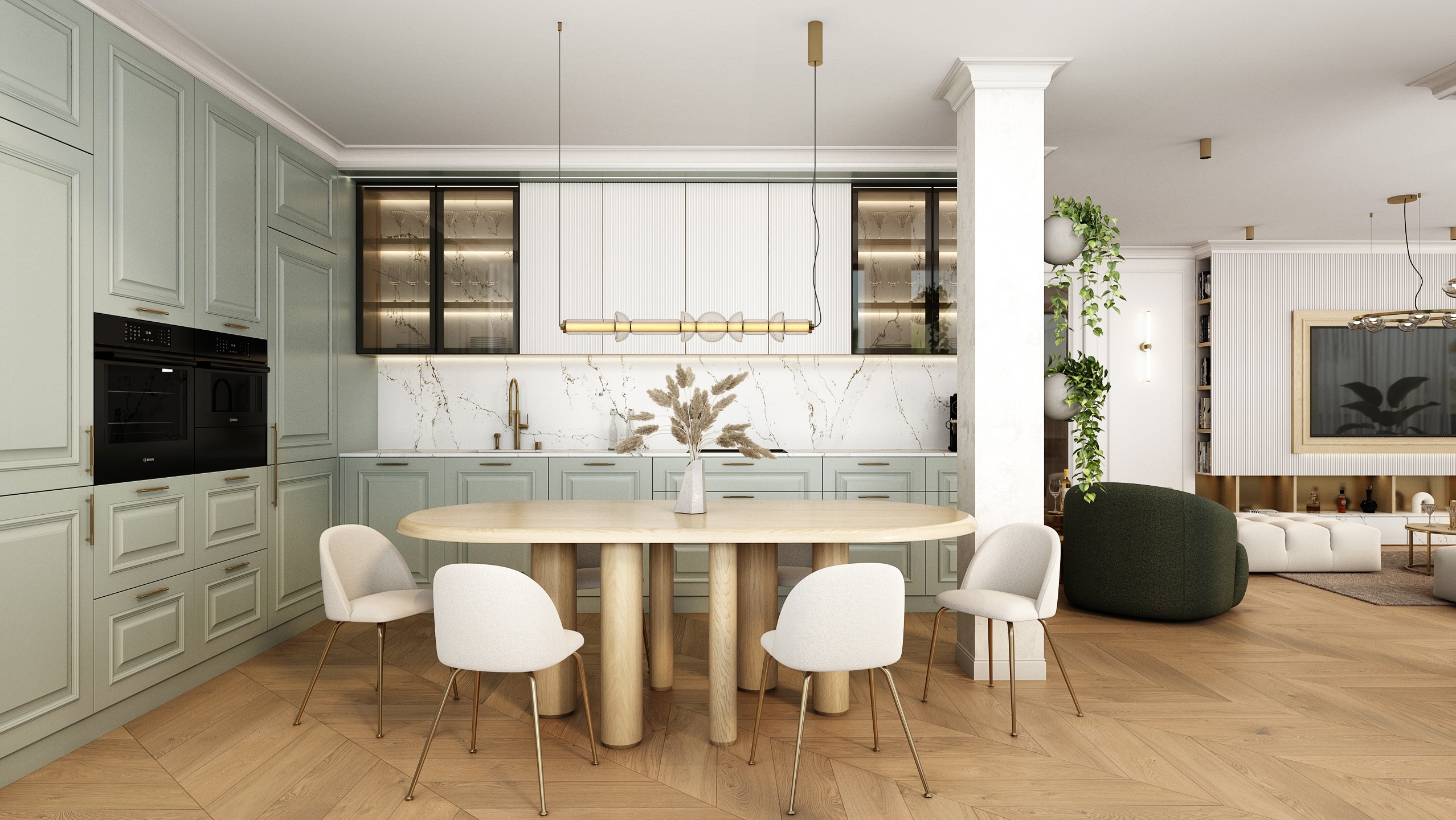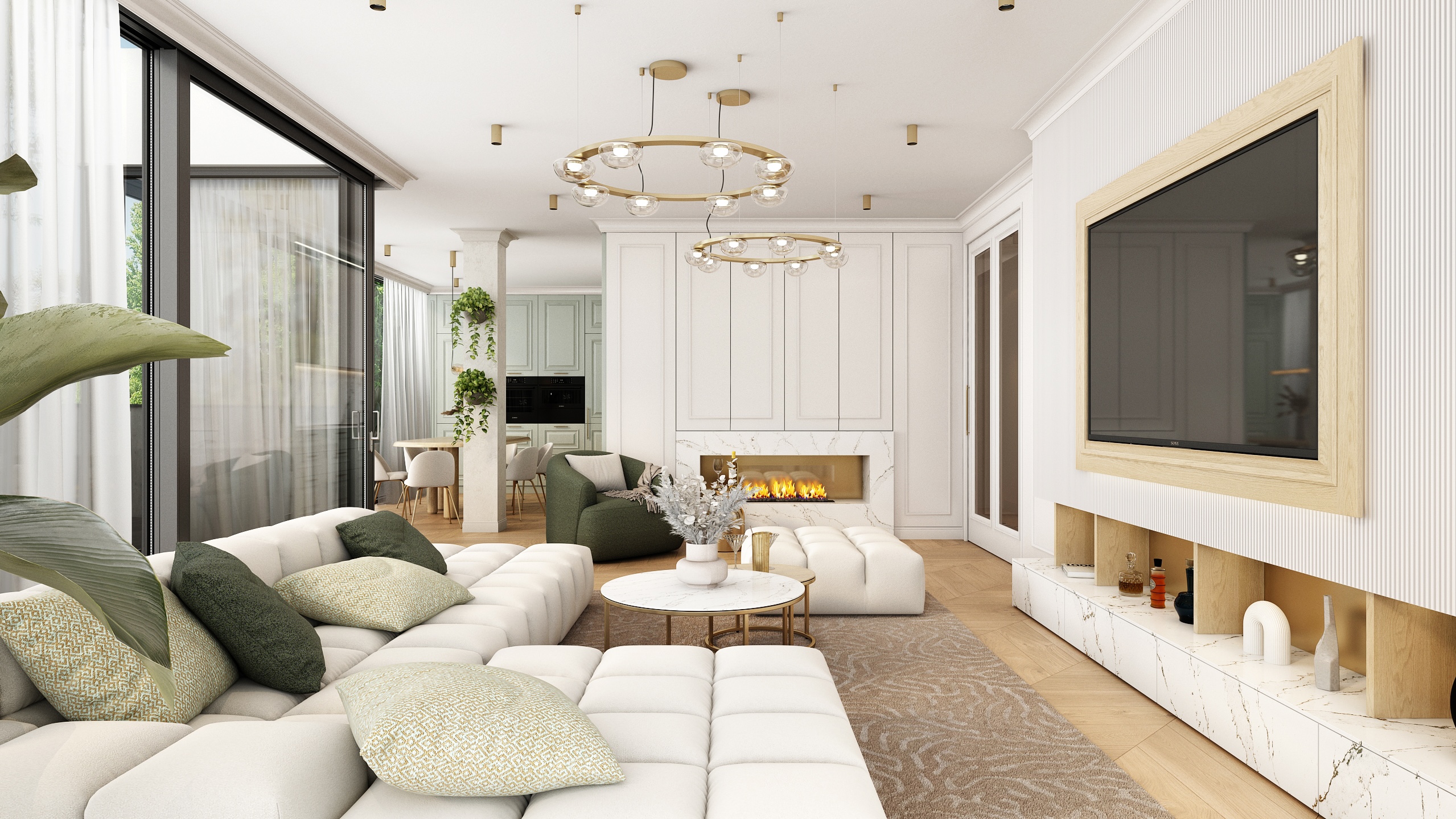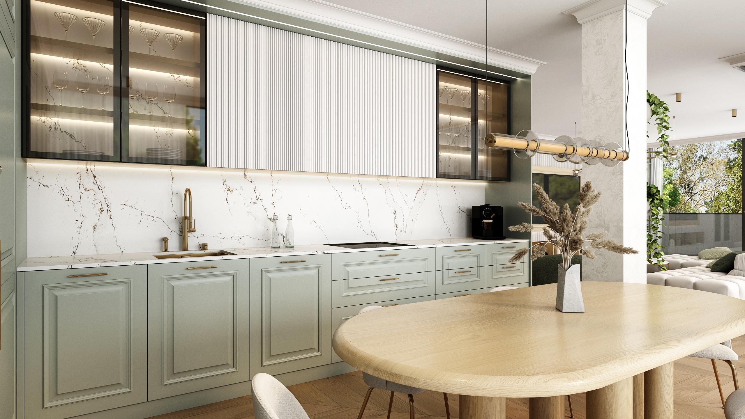 Mramorový obklad s jemnou kresbou doplňuje celkový dojem elegance, kterou podtrhuje i kulatý jídelní stůl z přírodního dřeva. Obývací část je navržena jako komfortní zóna pro odpočinek i rozhovory. Modulární pohovka v neutrální béžové barvě spolu s jemným kobercem a zelenými polštářky vytváří harmonické a útulné prostředí. Zlaté detaily na konferenčních stolcích elegantně propojují prostor s kuchyní.