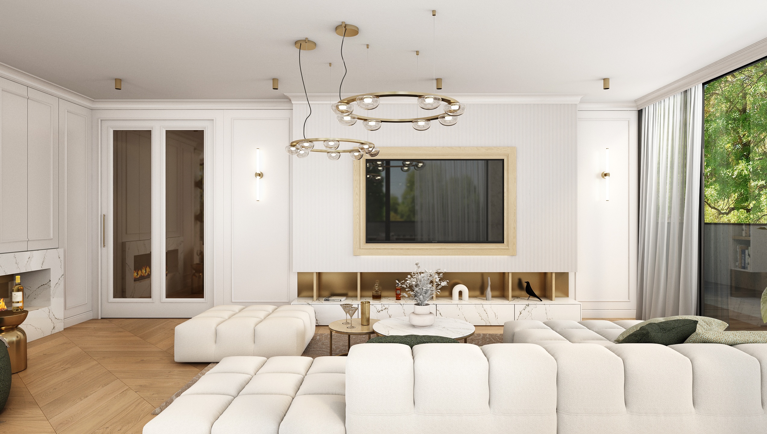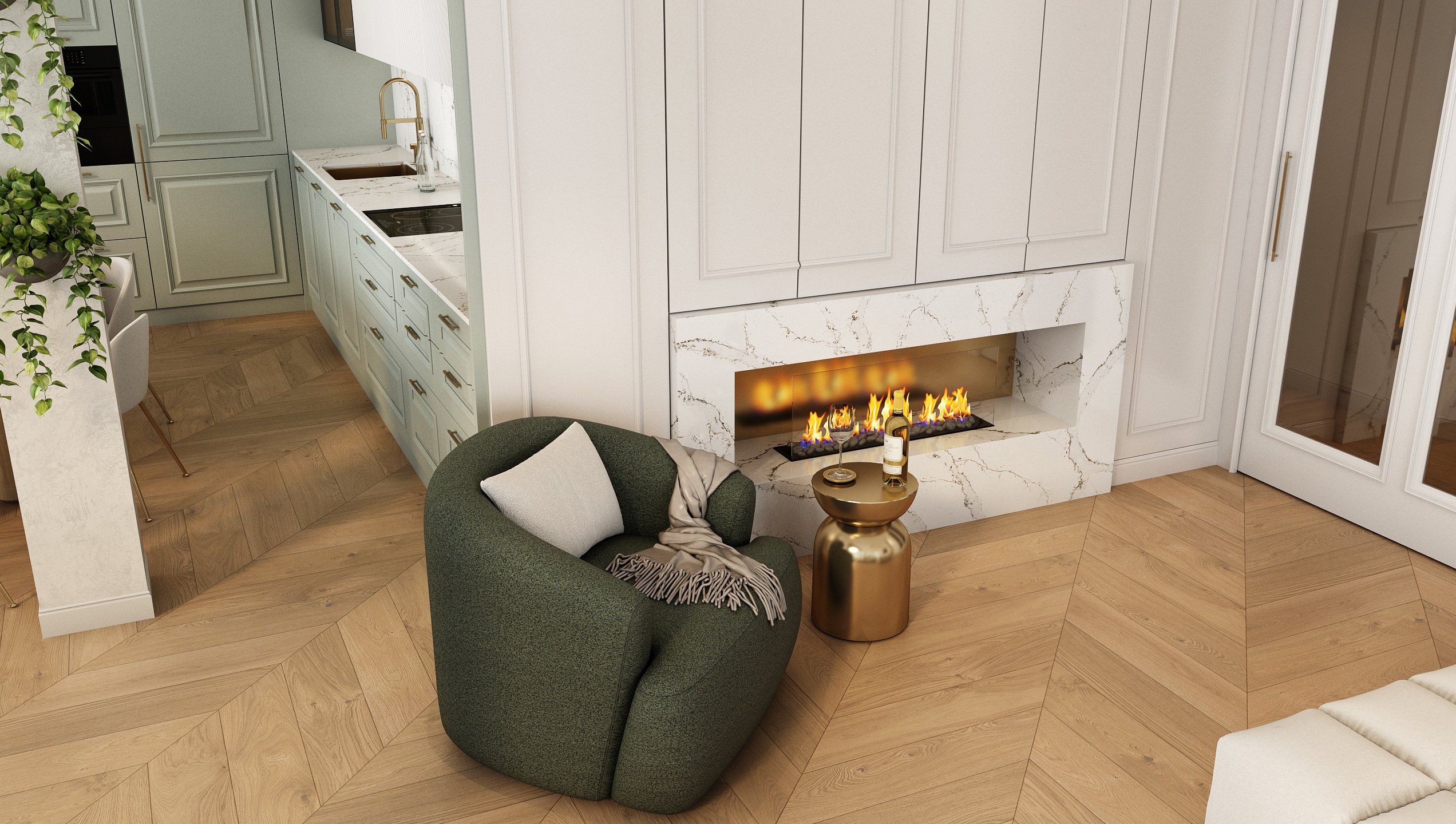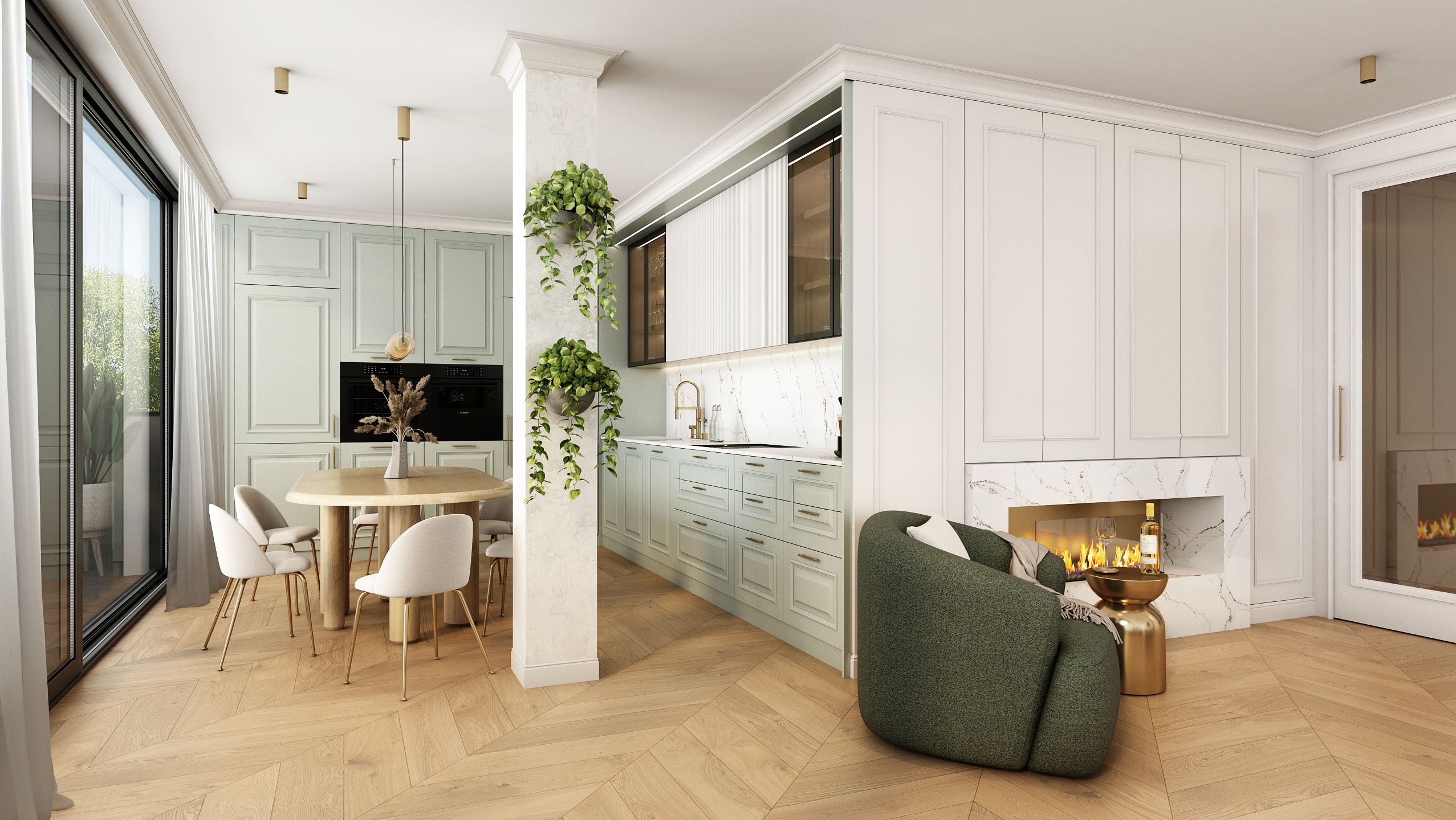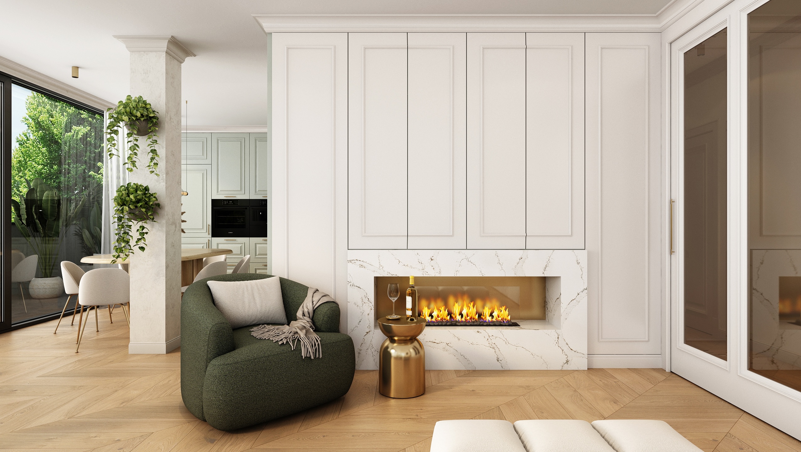 Mramorový obklad s jemnou kresbou doplňuje celkový dojem elegance, kterou podtrhuje i kulatý jídelní stůl z přírodního dřeva. Obývací část je navržena jako komfortní zóna pro odpočinek i rozhovory. Modulární pohovka v neutrální béžové barvě spolu s jemným kobercem a zelenými polštářky vytváří harmonické a útulné prostředí. Zlaté detaily na konferenčních stolcích elegantně propojují prostor s kuchyní.
