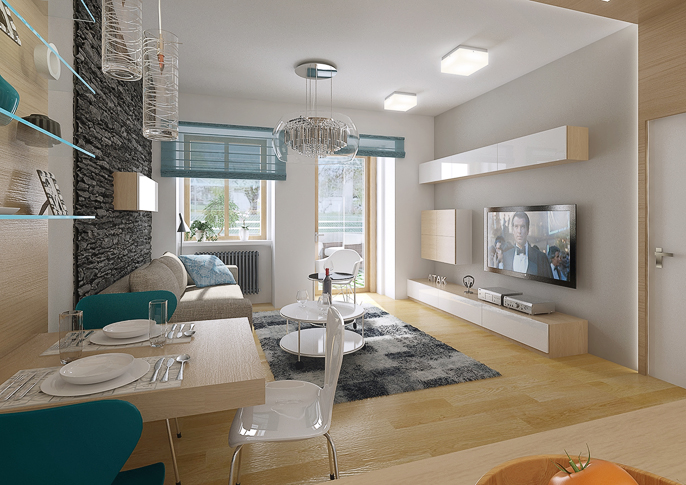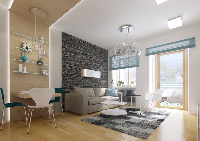 Návrh obytného prostoru moderní garsonky. Dominantním prvkem je zde kamenný obklad za sedací soupravou. Jídelní stůl je kvůli ušetření místa zavěšený na stěně.
